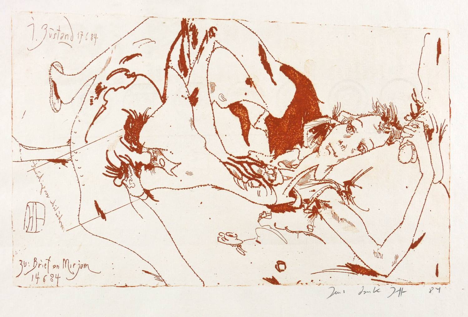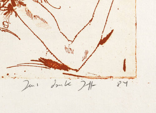 Rechts unten in Bleistift signiert und datiert: ″Janssen 84″. Daneben eigenhändige Widmung. In der Platte diverse Inschriften: ″1. Zustand 17 6 84 // zu: Brief an Mirjam // 14 6 84″. Dazu Monogramm sowie spiegelschriftlich die Bezeichnung: ″natürlich verzeichnet″. – Tadellos. Hervorragender Zustand.