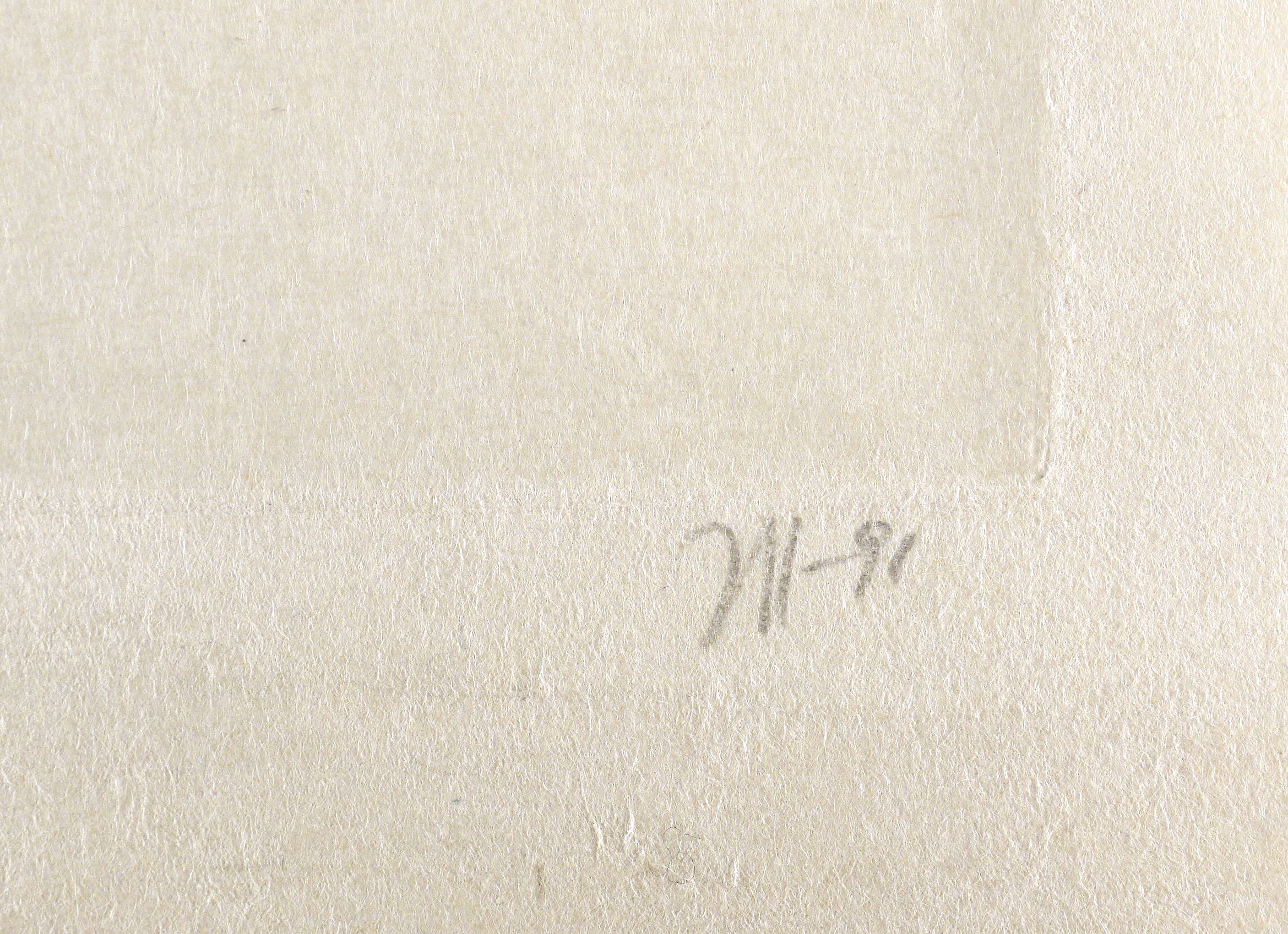 Rechts unten in Bleistift signiert und datiert: ″Janssen 91″. Links Auflagenbezeichnung: ″II 14/75″. In der Platte rechts unten monogrammiert, datiert, betitelt und bezeichnet: ″Albertinum seelig!″. In Spiegelschrift bezeichnet: ″Es gibt Zeichner und dann gibt es Zeichner″. Dazu Widmung an Werner Schmidt. – Totentanz-Motiv und Altstadt-Silhouette Dresdens werden zu einem Requiem auf die untergegangene und einem Dankgesang auf die wieder auferstandene Barockstadt. – Sehr schön erhalten. Tadelloser Zustand.