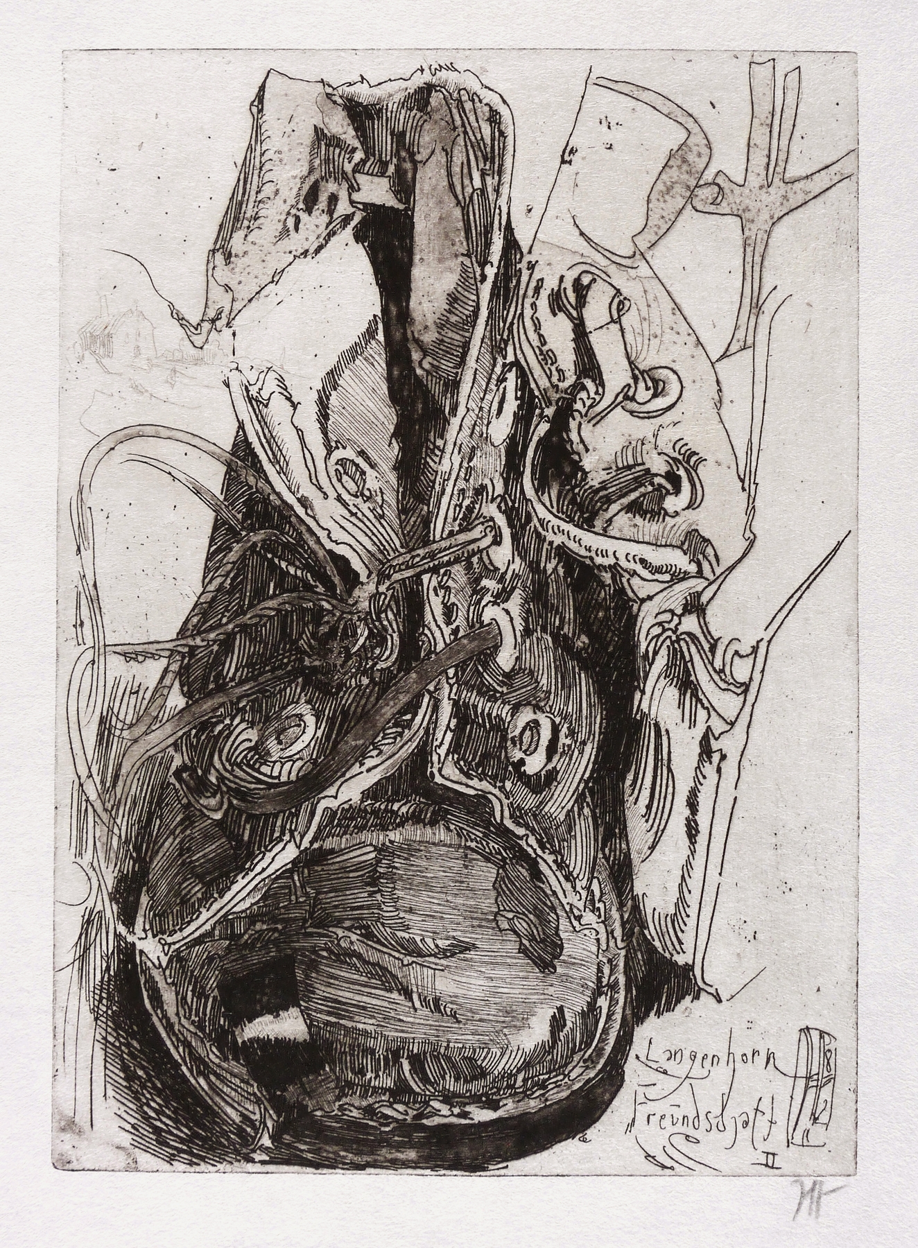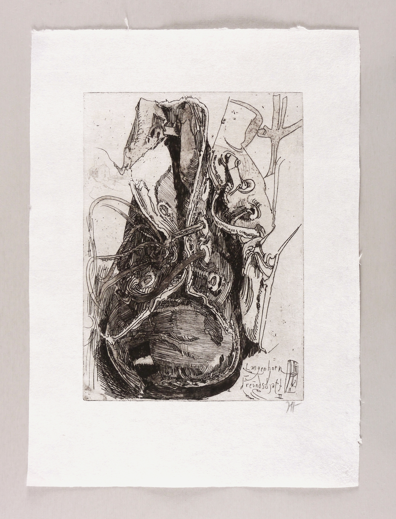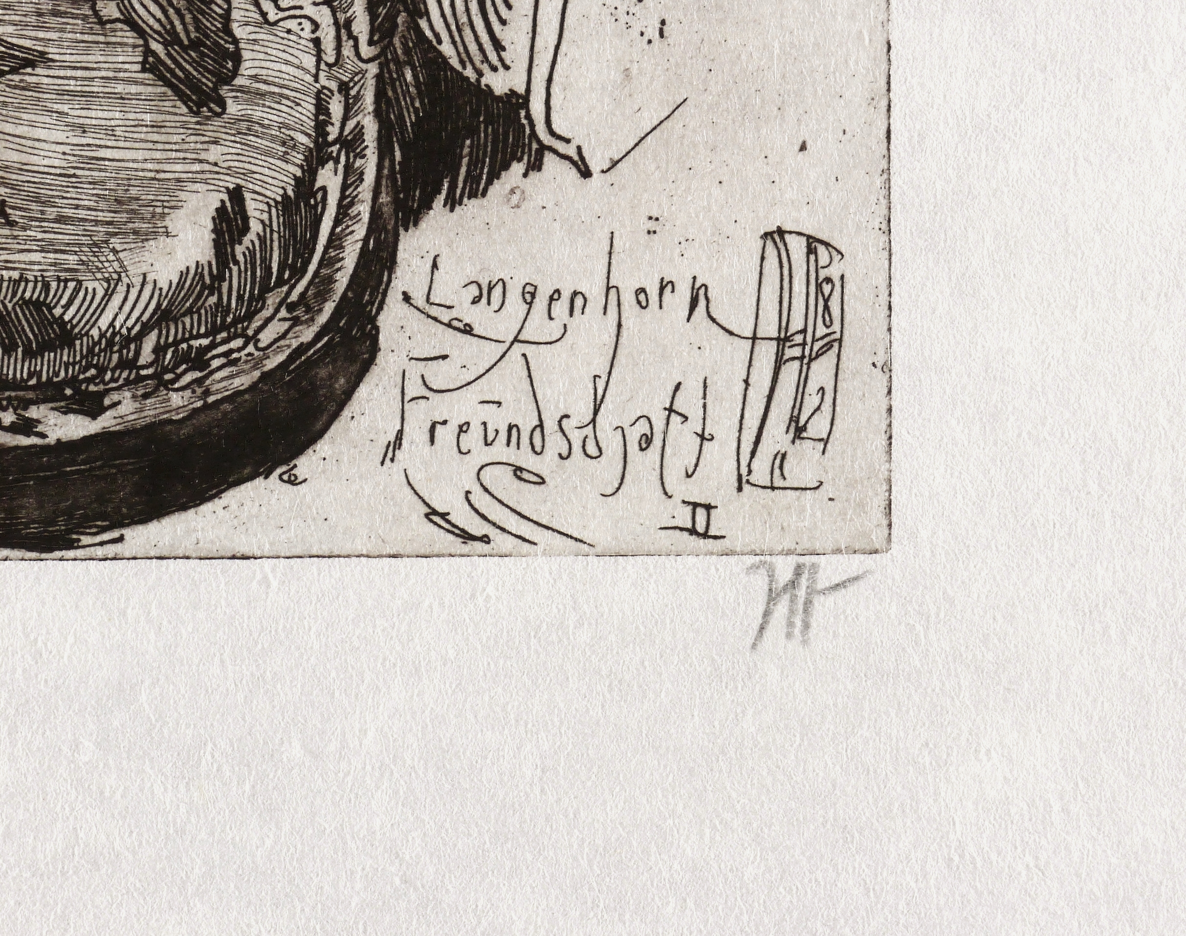 Kruglewsky 63. Griffelkunst 228 C3. – Rechts unten in Bleistift signiert: ″Janssen″. Rechts unten in der Platte bezeichnet, monogrammiert und datiert: ″Langenhorn Freundschaft II / JH 82″. Rechts oben flächig nochmals Namenszug: ″Janssen″. – Edition der Griffelkunst. – Originalrandiges unbeschnittenes Blatt. Sehr guter Zustand.