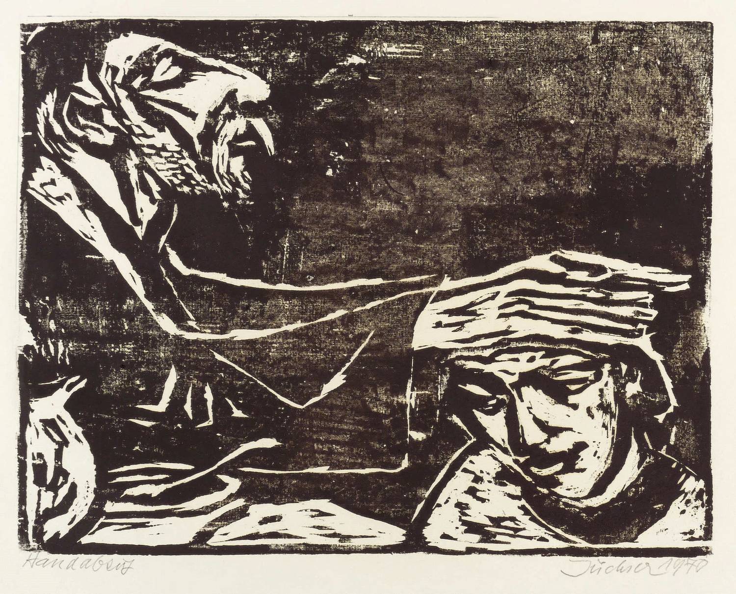 1970. Holzschnitt, in Schwarz, auf hellgelbem Achatpapier. – Originale Künstlergrafik, von Hans Jüchser. – 30,2 x 39,1 cm (Darstellung / Druckstock), 48 x 63,5 cm (Blatt).