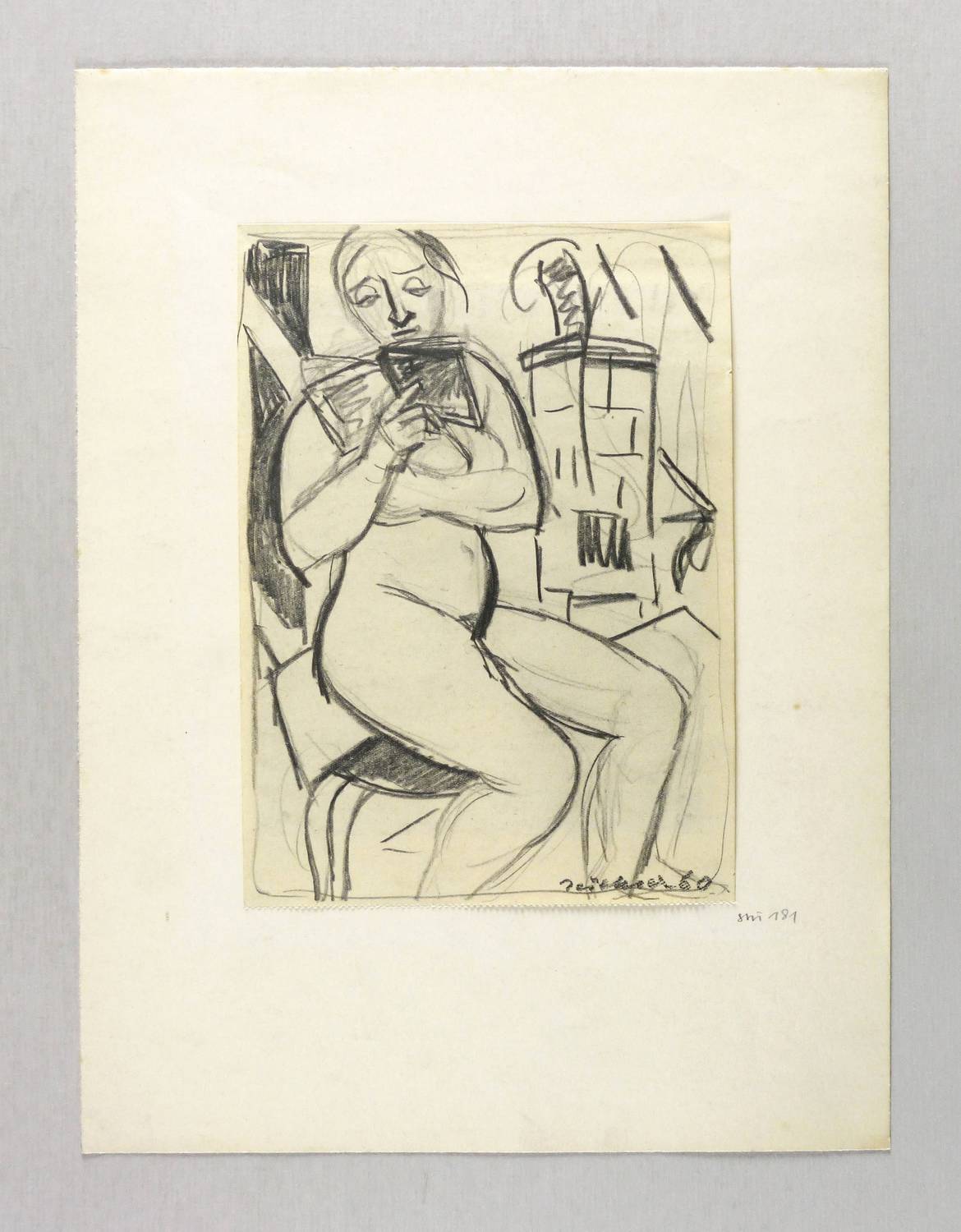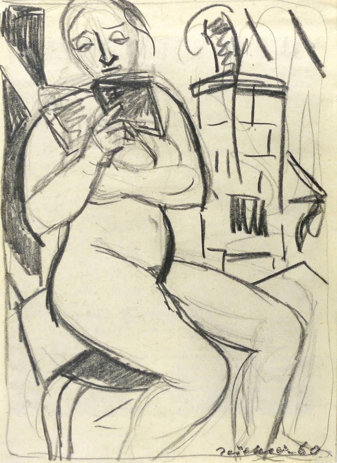 1960. Zeichnung / Graphit, auf leichtem gelblichem Maschinenpapier. – Originale Künstlergrafik, von Hans Jüchser. – Unikat. – 20,3 x 14,6 cm (Darstellung / Blatt), 32 x 24 cm (Trägerkarton).