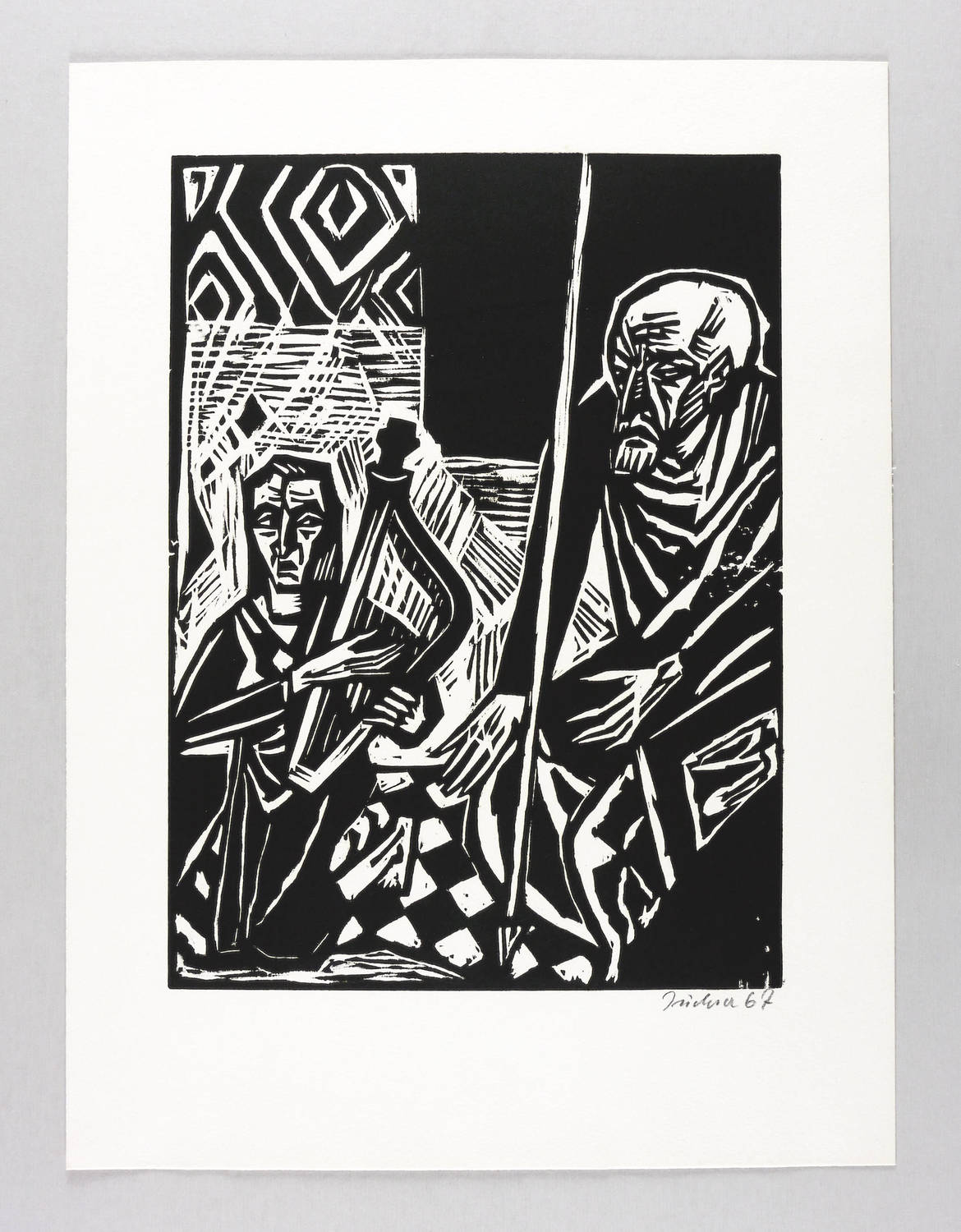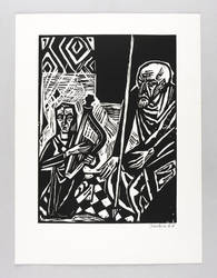 Rechts unten in Bleistift signiert und datiert: ″Jüchser 67″. Verso Auflagenbezeichnung. – Zur Bibelstelle: ″Des andern Tages geriet der böse Geist von Gott über Saul, und er raste daheim in seinem Hause; David aber spielte auf den Saiten mit seiner Hand, wie er täglich pflegte. Und Saul hatte einen Spieß in der Hand und er schoß ihn und gedachte: Ich will David an die Wand spießen. David aber wandte sich zweimal von ihm.″ (1. Samuel 18:10-11). – Tadelloses Exemplar. Sehr guter Zustand.