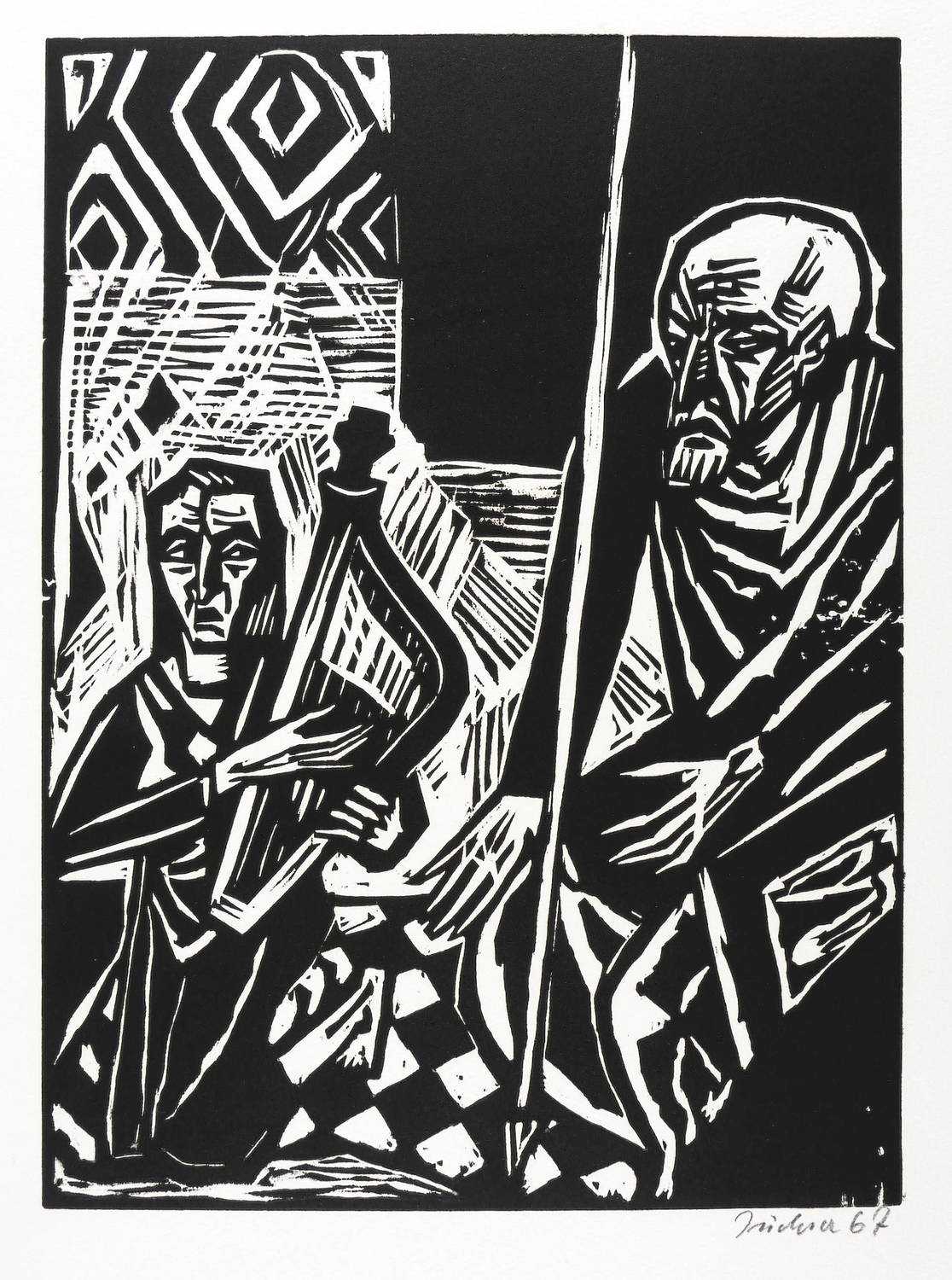 1967. Holzschnitt, in Schwarz, auf hellchamois Weißenborn. – Originale Künstlergrafik, von Hans Jüchser. – Auflage Exemplar Nr. 42/82. – 38,0 x 27,8 cm (Darstellung / Druckstock), 50 x 38 cm (Blatt).