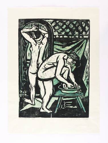1957/1969. Farbholzschnitt, in 4 Farben, auf rauem weißlichem Japanbütten. – Originale Künstlergrafik, von Hans Jüchser. – Auflage Exemplar Nr. 7/8. – 35,0 x 25,5 cm (Darstellung / Druckstock), 42,5 x 30,5 cm (Blatt).