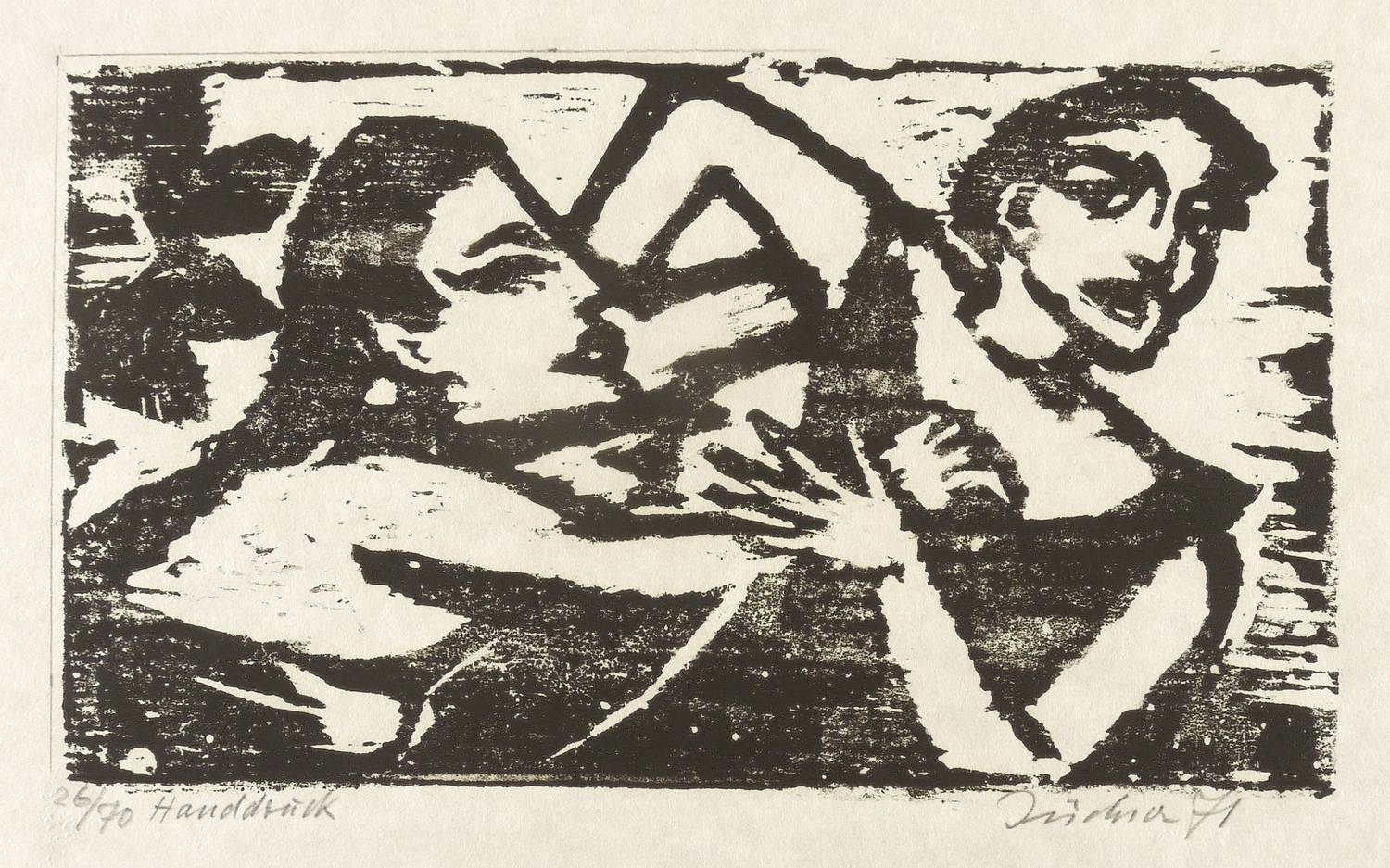 1971. Holzschnitt, in Schwarz, auf wolkigem hellchamois Similijapan. – Originale Künstlergrafik, von Hans Jüchser. – Auflage Exemplar Nr. 26/70. – 16,1 x 27,5 cm (Darstellung / Druckstock), 41 x 42 cm (Blatt).