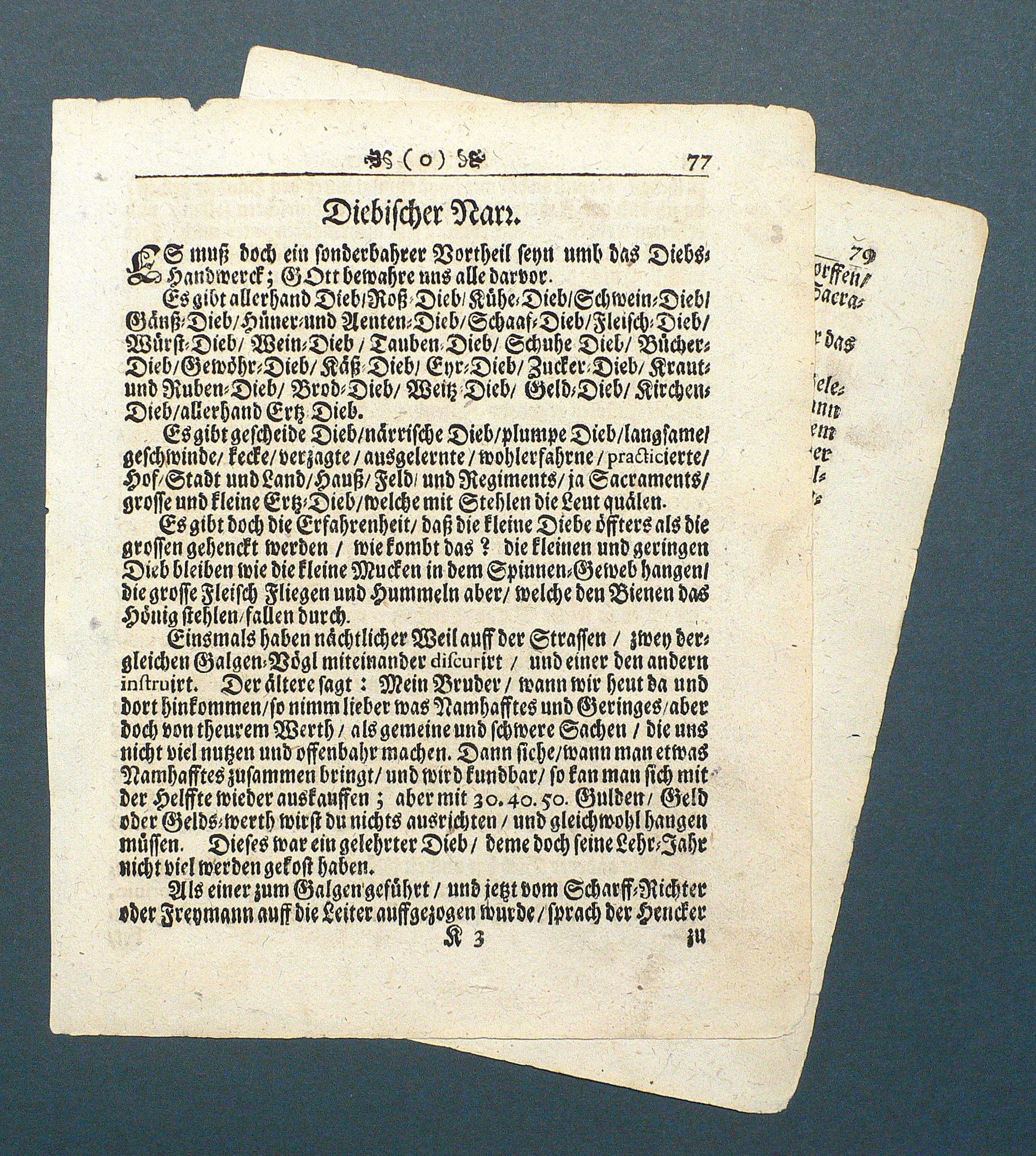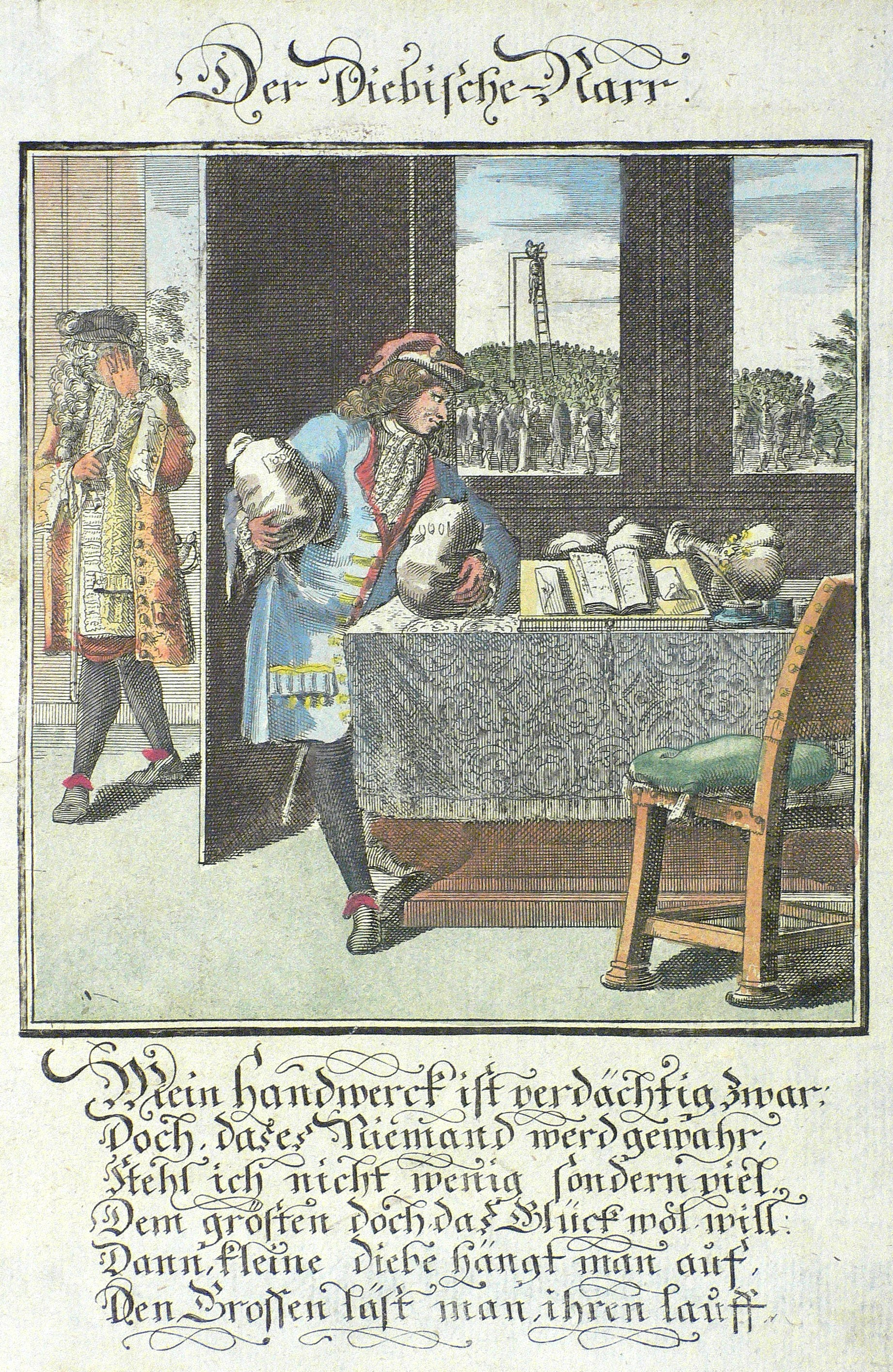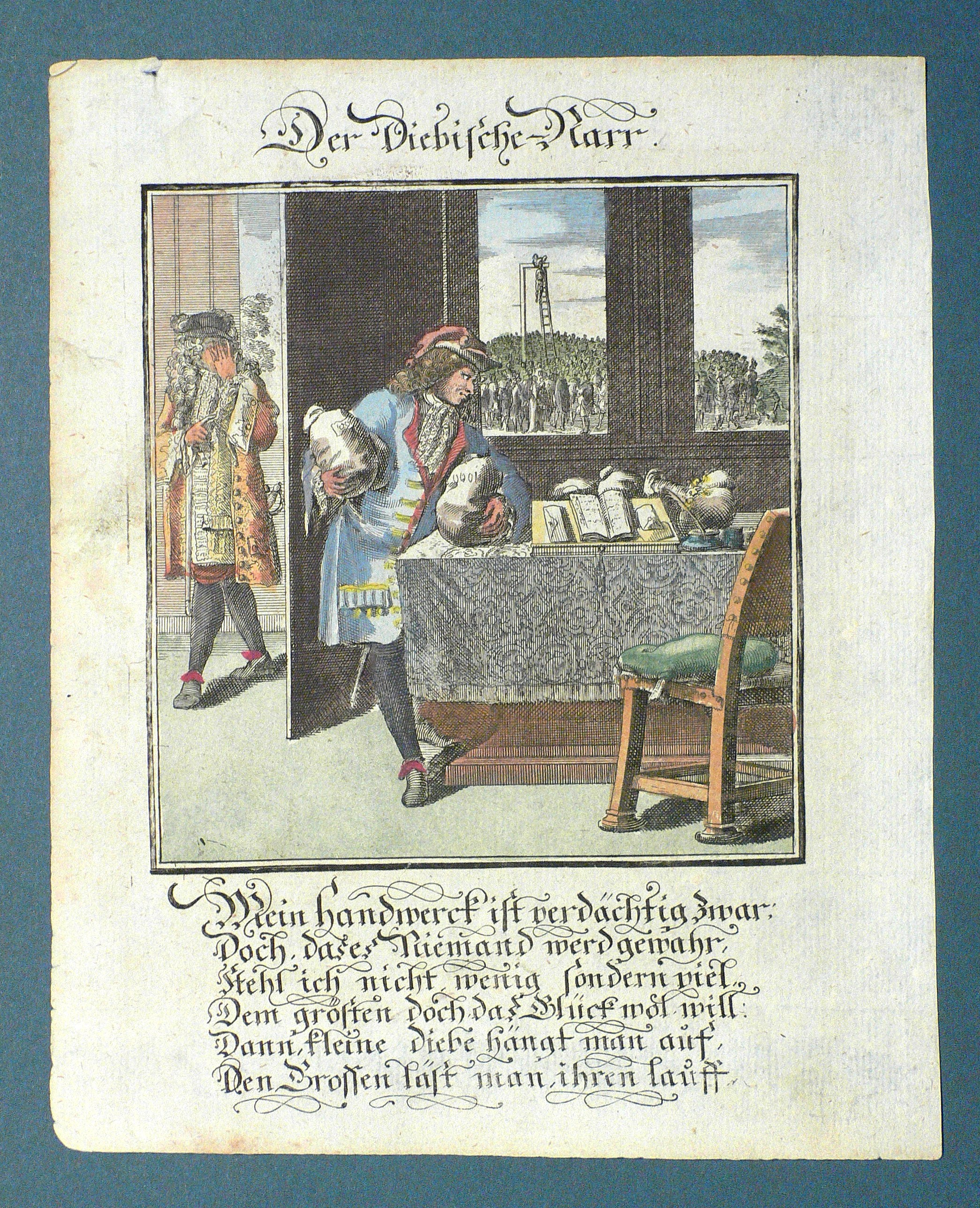Aus: Abraham a Sancta Clara, Centi-Folium Stultorum In Quarto Oder Hundert Ausbündige Narren, In Folio (Nürnberg / Wien: Weigel / Lercher 1709). – Oberhalb der Darstellung betitelt. Deutsche Verse: ″Mein Handwerck ist verdächtig Zwar; Doch das es Niemand werd gewahr, Stehl ich nicht wenig sondern viel, ...″ – Die 65 enthaltenen Kupfertafeln des ″Centi- folium stultorum″ sind ursprünglich 1690 für das Werk ″Ein Schock Phantastn in einem Kasten″ von Christoph Weigel gestochen worden. - Emblematische Darstellung eines in flagranti ertappten Diebes. Den man im Gegensatz zu seinem im Hintergrund am Galgen hängenden niedrigeren Kollegen aber gewähren läßt. - Beiliegend zwei Blatt Text. – Schwache Lagerspuren. Sonst dem Alter entsprechend guter Zustand.