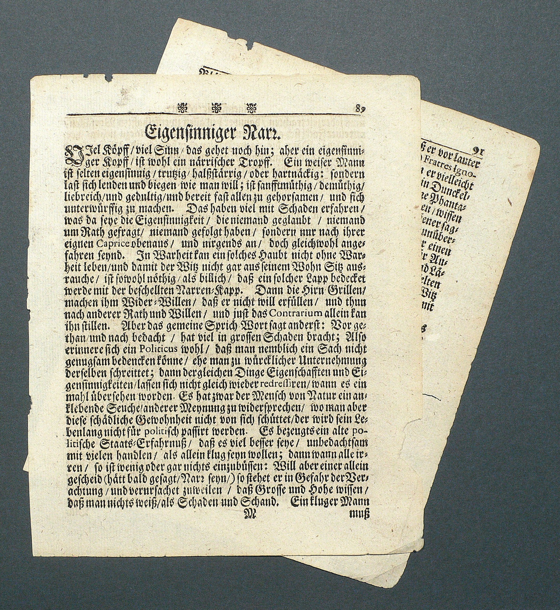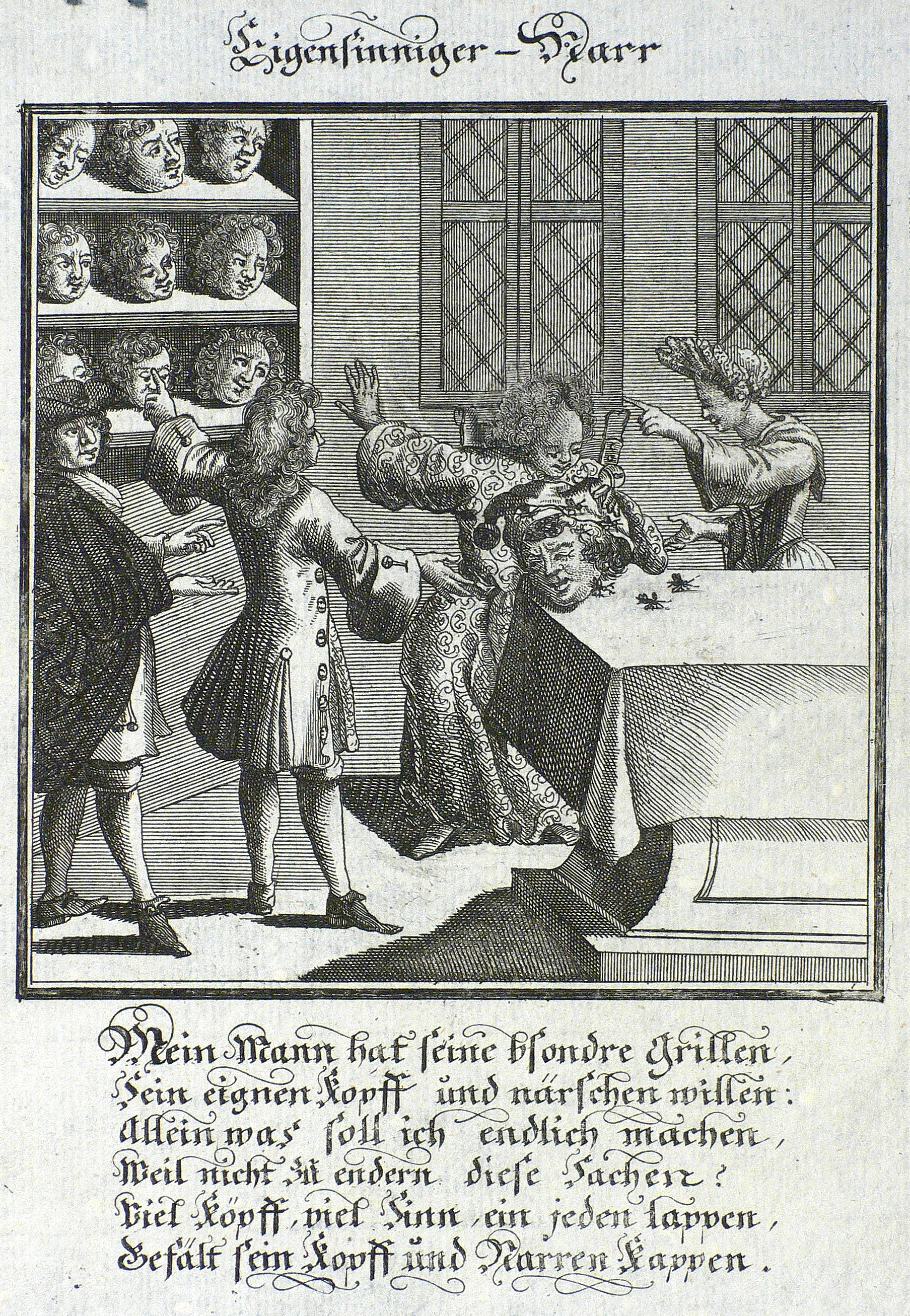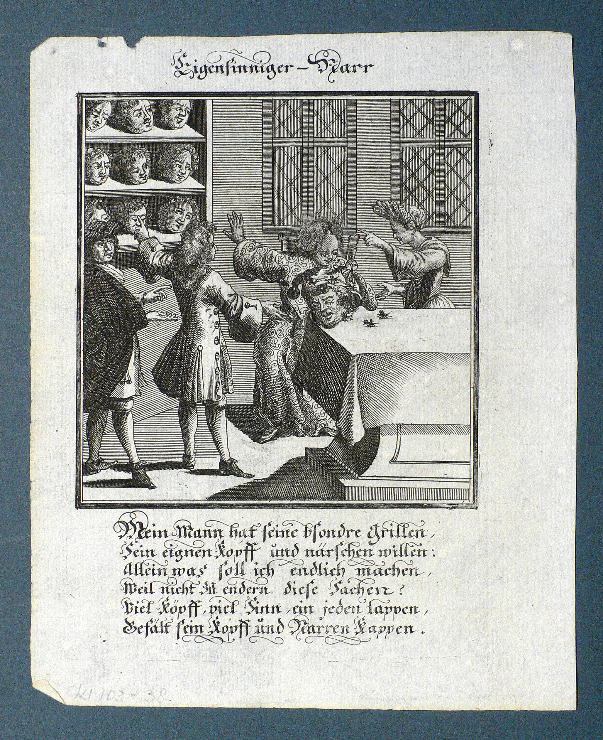 Aus: Abraham a Sancta Clara, Centi-Folium Stultorum In Quarto Oder Hundert Ausbündige Narren, In Folio (Nürnberg / Wien: Weigel / Lercher 1709). – Oberhalb der Darstellung betitelt. Darunter die deutschen Verse: ″Mein Mann hat seine bsondre Grillen, Sein eignen Kopff und närschen willen. ...″ – Die 65 enthaltenen Kupfertafeln des ″Centi- folio stultuorum″ sind ursprünglich 1690 für das Werk ″Ein Schock Phantastn in einem Kasten″ von Christoph Weigel gestochen worden. - Emblematische Darstellung einer verzweifelten Ehefrau in Gegenwart ihres eigensinnigen Gatten. Sein Eigensinn versinnbildlicht durch ein Haupt mit Narrenkappe und von Grillen (idea fixa) umgeben. - Beiliegend zwei Blatt Text. – Leichte Lagerspuren. Partiell schwach randrissig. Kleiner Ausriß im Rande des ersten Textblattes. Sonst guter Zustand.
