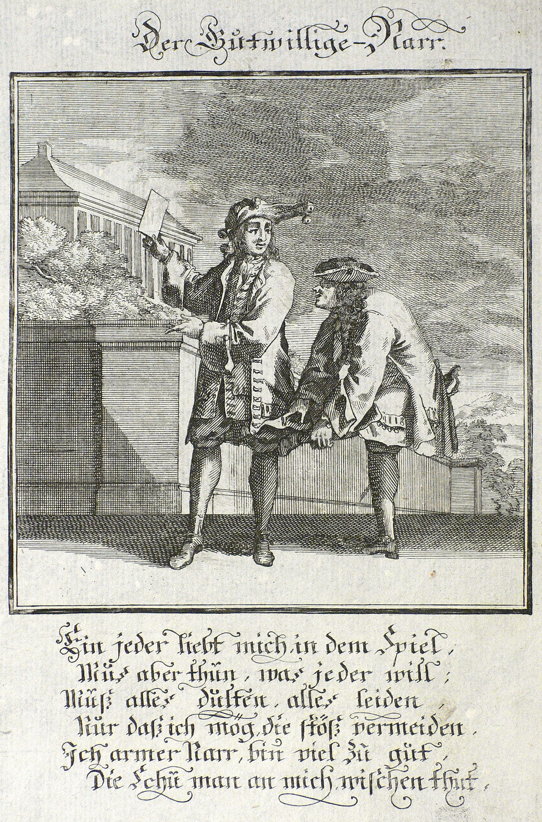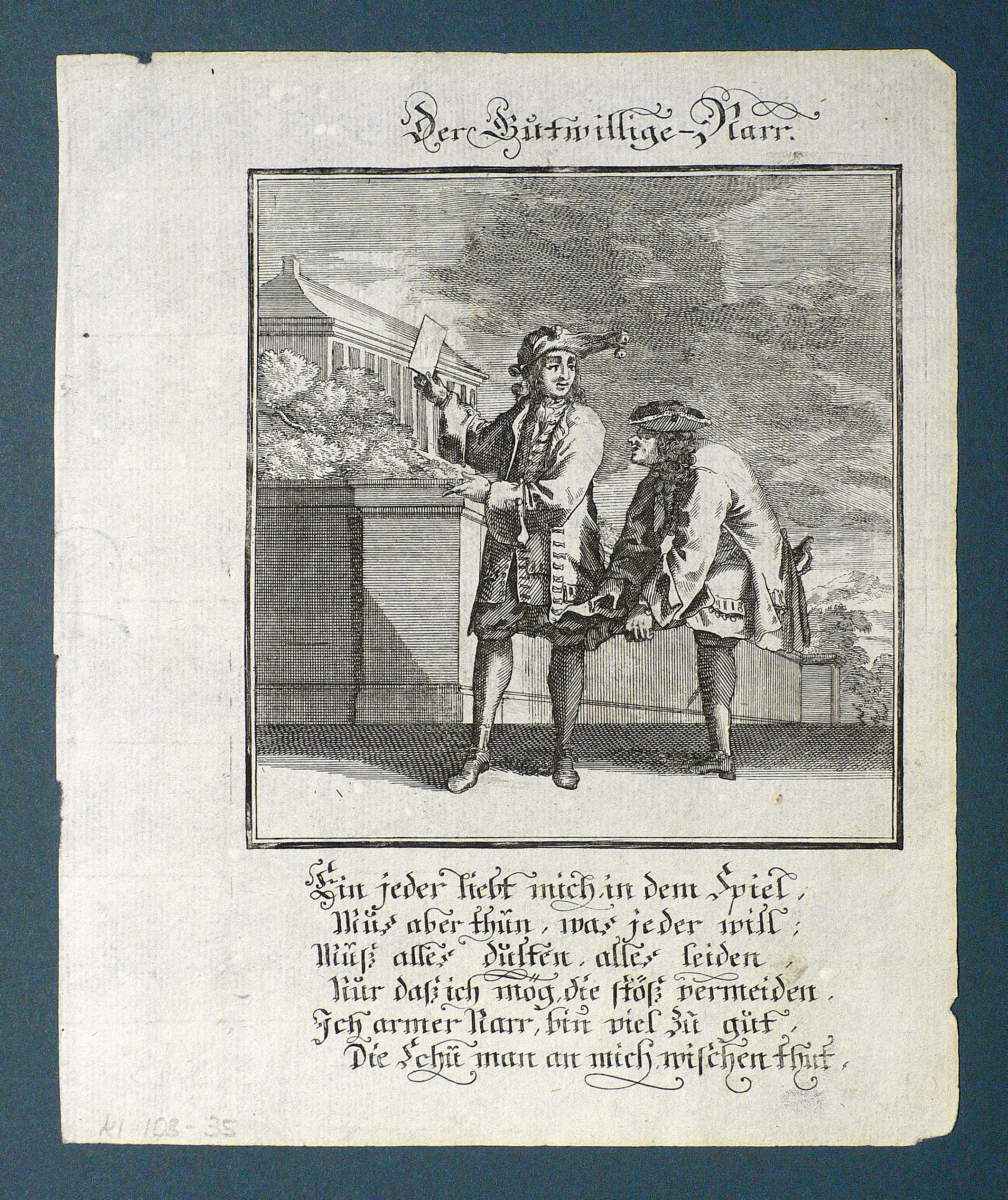 Aus: Abraham a Sancta Clara, Centi-Folium Stultorum In Quarto Oder Hundert Ausbündige Narren, In Folio (Nürnberg / Wien: Weigel / Lercher 1709). – Oberhalb der Dartsellung betitelt. Darunter die deutschen Verse: ″Ein jeder liebt mich, in dem Spiel, Mus aber thun, was jeder will ...″ – Die 65 enthaltenen Kupfertafeln des ″Centi- folium stultorum″ sind ursprünglich 1690 für das Werk ″Ein Schock Phantastn in einem Kasten″ von Christoph Weigel gestochen worden. - Emblematische Darstellung eines Mannes, der in unnatürlichem Gleichmut einem Zweiten die Stiefel an seinem Rock abputzen läßt. - Beiliegend zwei Blatt Text. – Dem Alter entsprechend guter Zustand.
