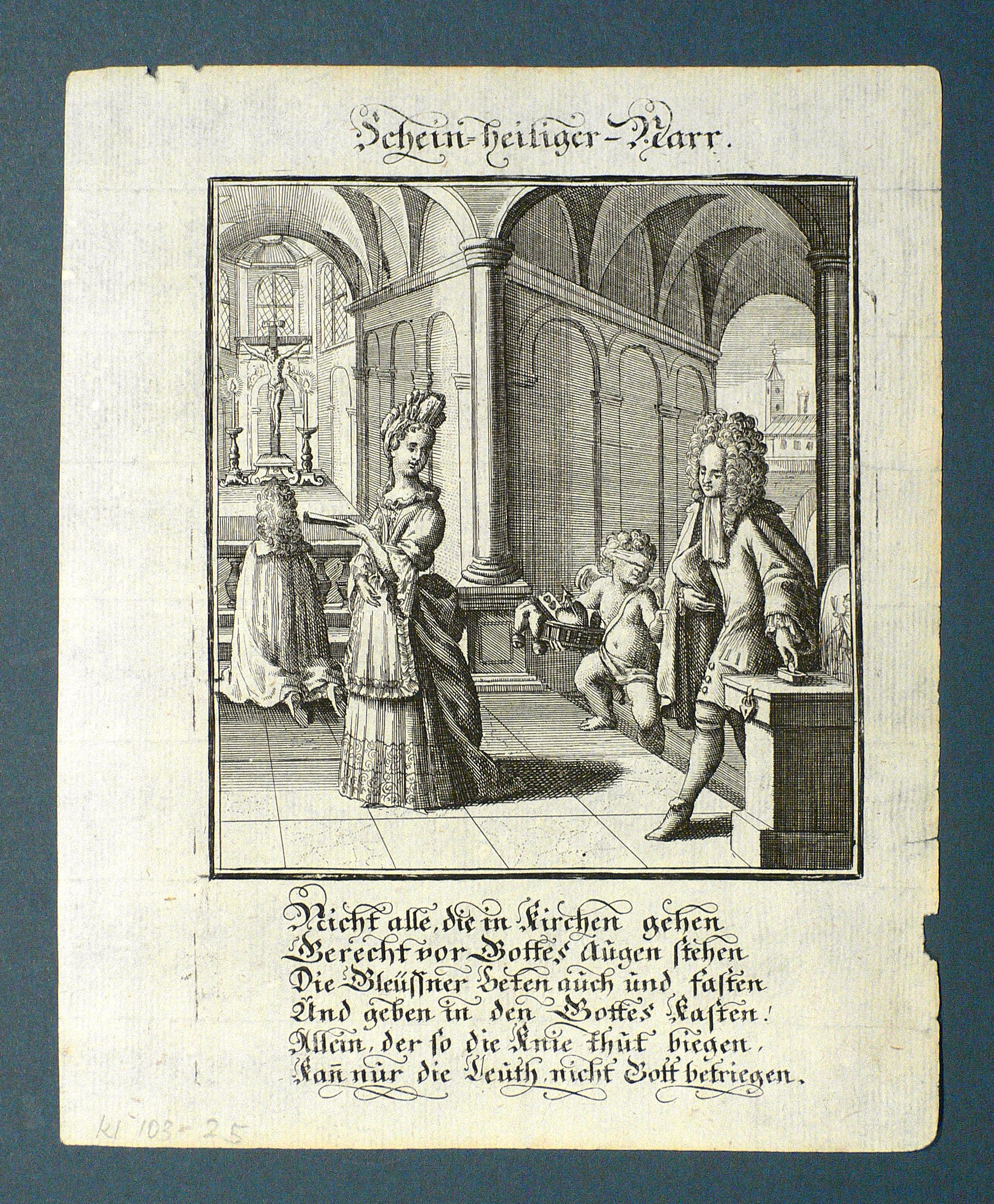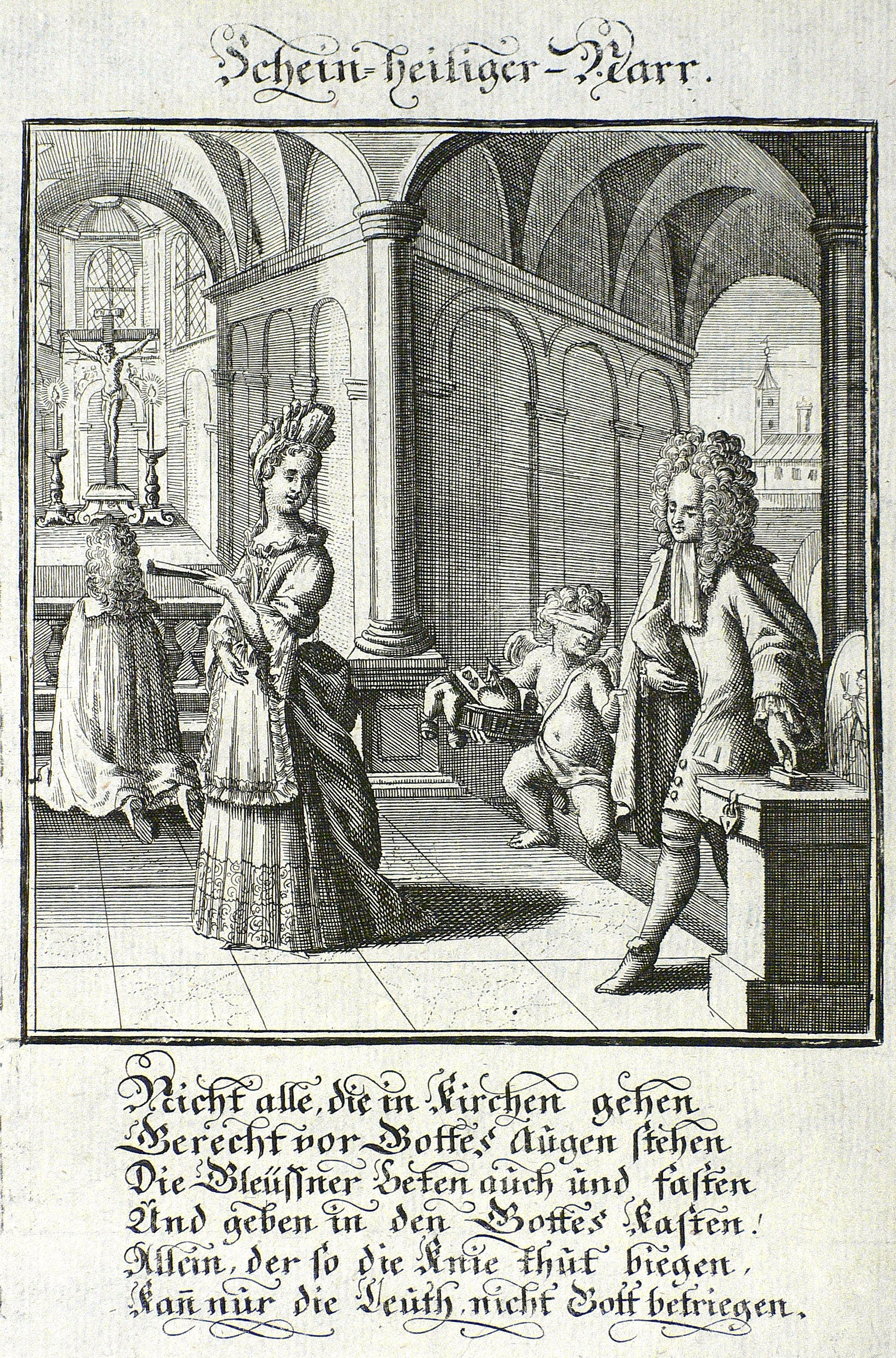 Aus: Abraham a Sancta Clara, Centi-Folium Stultorum In Quarto Oder Hundert Ausbündige Narren, In Folio (Nürnberg / Wien: Weigel / Lercher 1709). – Oberhalb der Darstellung betitelt. Darunter deutsche Subskription in gebundener Rede: ″Nicht alle, die in Kirchen gehen Gerecht vor Gottes augen stehen Die Gleussner beten auch und fasten ...″ – Die 65 enthaltenen Kupfertafeln des ″Centi- folium stultorum″ sind ursprünglich 1690 für das Werk ″Ein Schock Phantastn in einem Kasten″ von Christoph Weigel gestochen worden. - Absonderliche Gottgefälligkeit vorteuschender junger Mann am Opferstock, die fromme Weiblichkeit beeindrucken wollend. - Beiliegend zwei Blatt Text. – Partiell schwach randrissig. Sonst dem Alter entsprechend guter Zustand.