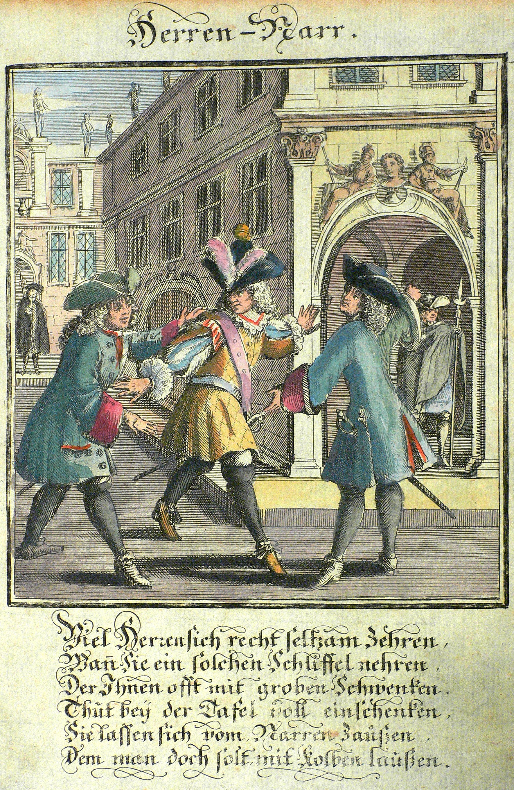 Aus: Abraham a Sancta Clara, Centi-Folium Stultorum In Quarto Oder Hundert Ausbündige Narren, In Folio (Nürnberg / Wien: Weigel / Lercher 1709). – Oberhalb der Darstellung betitelt. Darunter die Verse: ″Viel Herren sich recht seltzam zehren, / Man Sie ein solchen Schliffel nehren, / Der Ihnen offt mit groben Schwenken. / Thut bey der Tafel voll einschencken, / Sie lassen sich vom Narren Zaußen, / Dem man doch solt mit Kolben laußen.″ – Die 65 enthaltenen Kupfertafeln des ″Centi- folium stultorum″ sind ursprünglich 1690 für das Werk ″Ein Schock Phantastn in einem Kasten″ von Christoph Weigel gestochen worden. - Mit zwei Textblättern. – Papier dem Alter entsprechen leicht gebräunt. In den oberen Ecken fleckig durch alte Montierung. Darstellungsblatt mit hinterlegtem Eckausriß oben rechts. Die Darstellung selber - guter Abdruck mit wohlerhaltenem Kolorit.