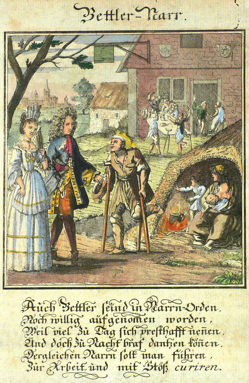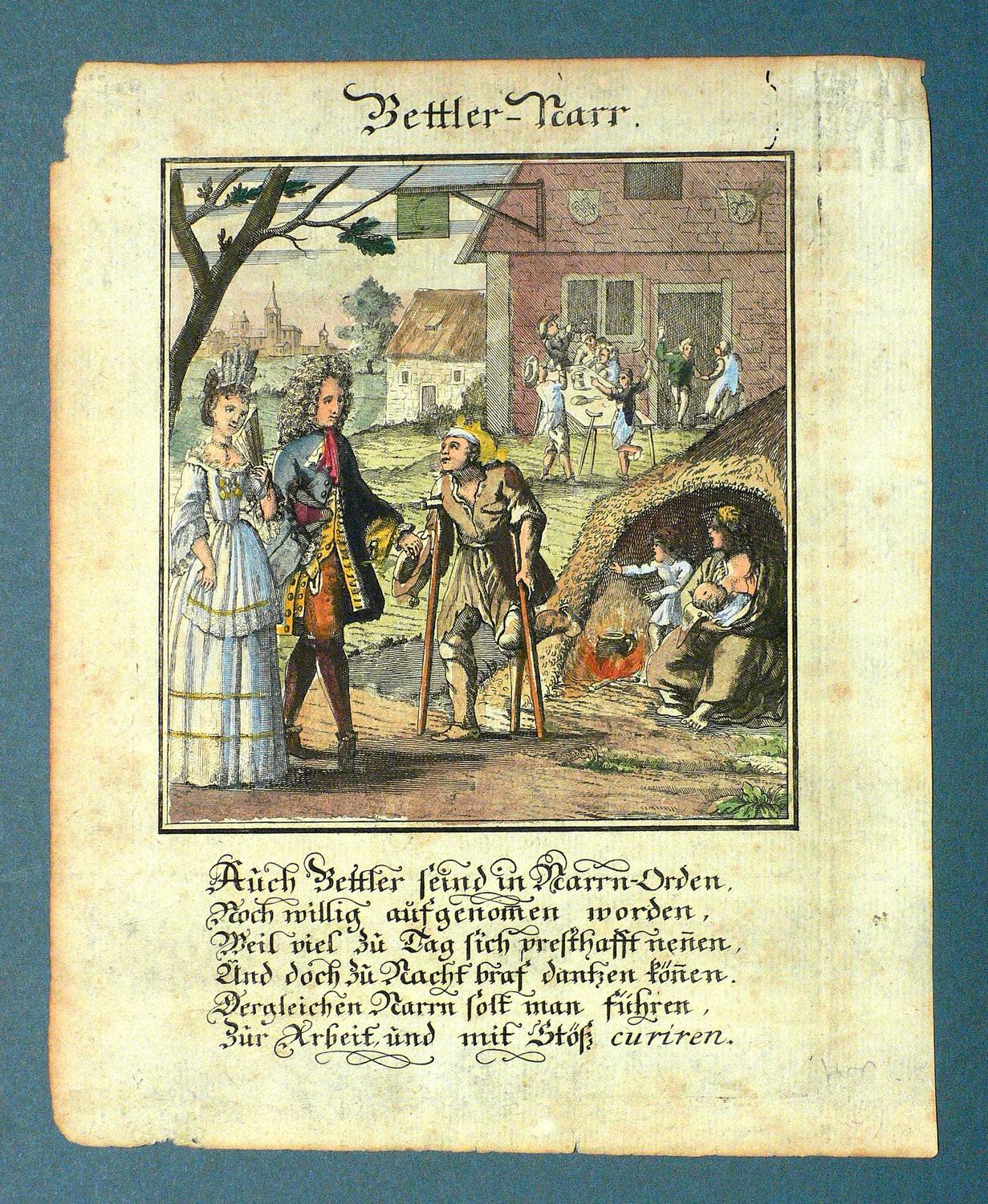 Aus: Abraham a Sancta Clara, Centi-Folium Stultorum In Quarto Oder Hundert Ausbündige Narren, In Folio (Nürnberg / Wien: Weigel / Lercher 1709). – Oberhalb der Darstellung betitelt. Darunter die Verse: ″Auch Bettler seind in Narrn-Orden, / Noch willig aufgenom[m]en worden, / Weil viel zu Tag sich presthafft nen[n]en, / Und doch zu Nacht braf dantzen kön[n]en. / Dergleichen Narrn solt man führen, / Zur Arbeit, und mit Stöß curiren.″ – Die 65 enthaltenen Kupfertafeln des ″Centi- folium stultorum″ sind ursprünglich 1690 für das Werk ″Ein Schock Phantastn in einem Kasten″ von Christoph Weigel gestochen worden. - Mit zwei Blatt Text. – Papier dem Alter entsprechend leicht gebräunt. In den oberen Ecken Reste alter Montierung. Insgesamt noch guter Zustand.