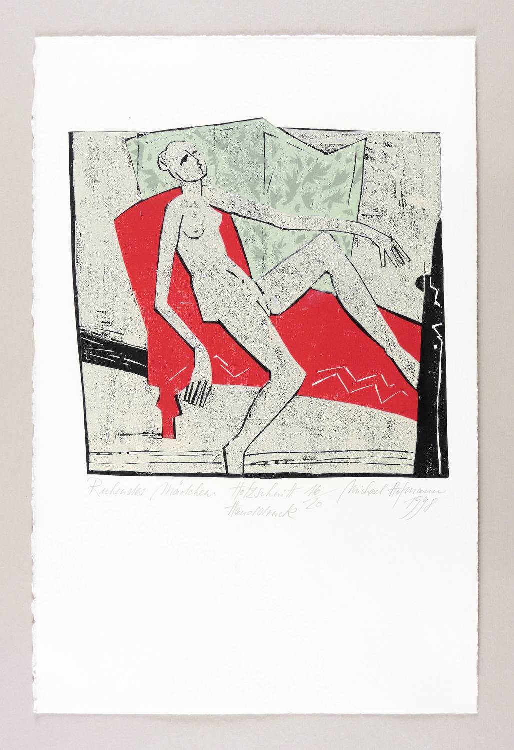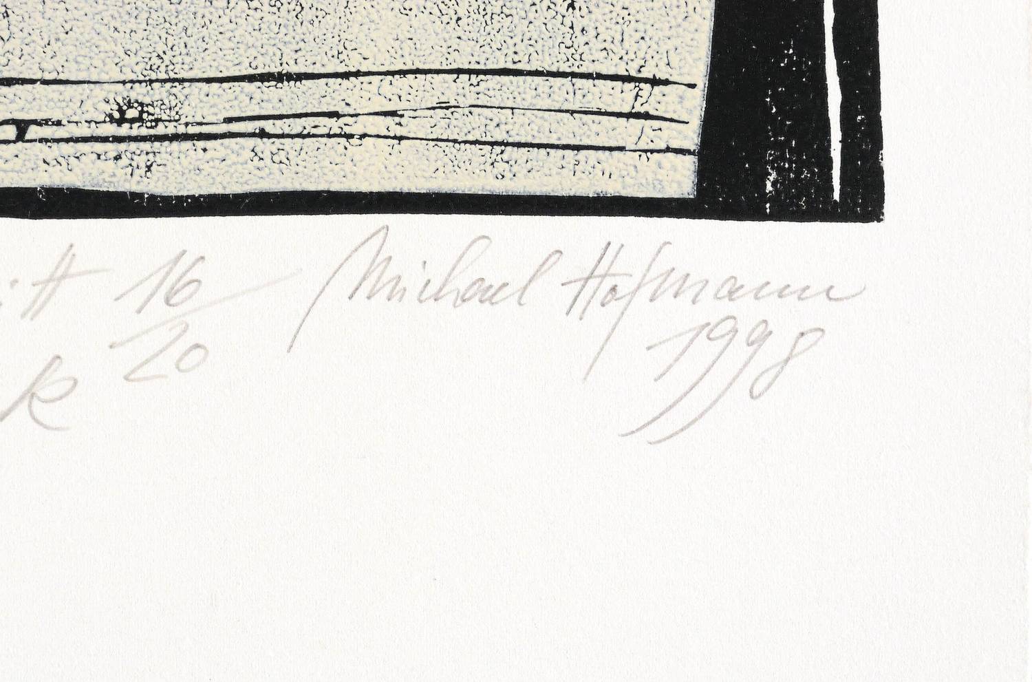 1998. Farbholzschnitt, auf Bütten. – Originale Künstlergrafik, von Michael Hofmann. – Auflage Exemplar Nr. 16/20. – 27 x 27,5 cm (Darstellung / Druckstock), 50 x 33 cm (Blatt).