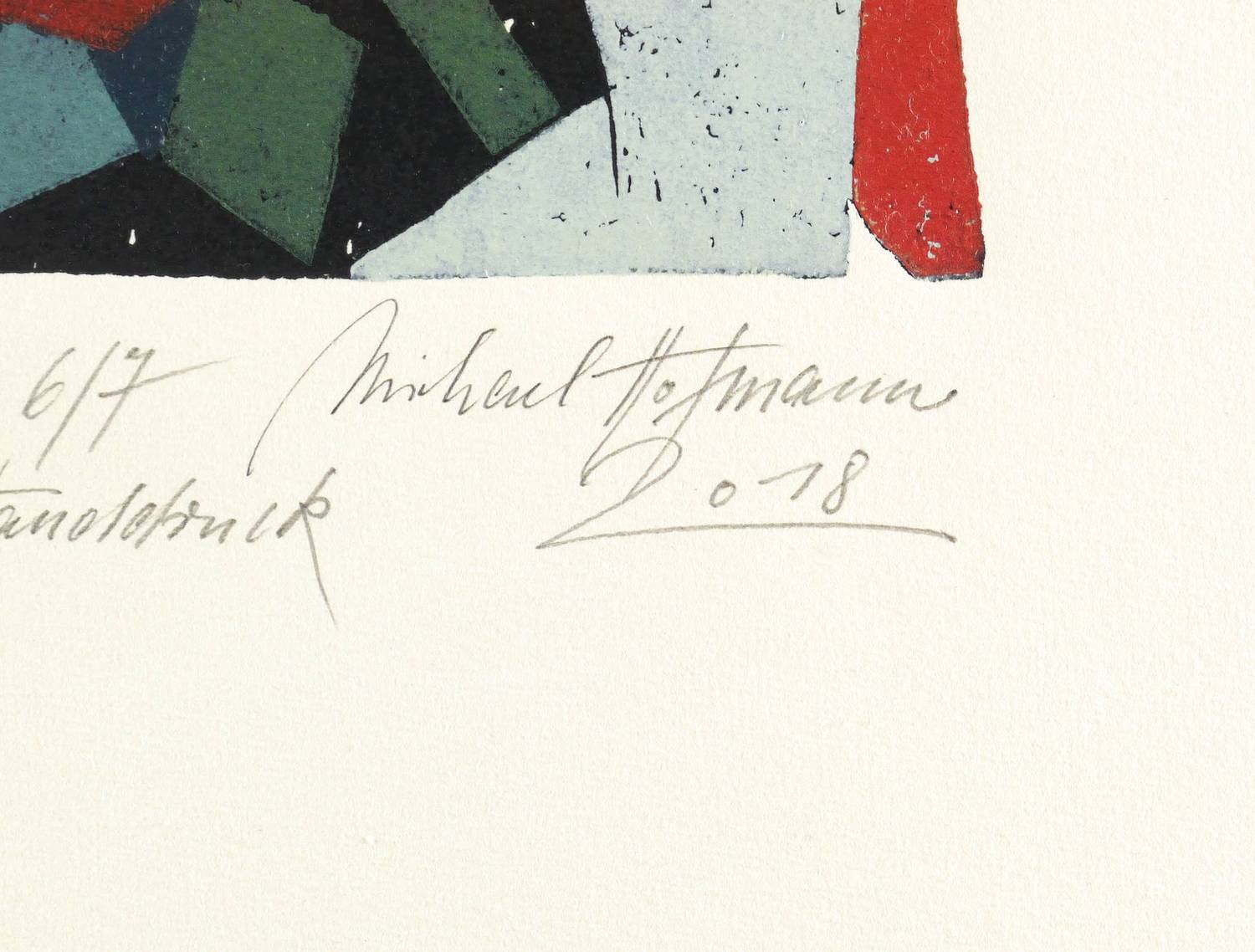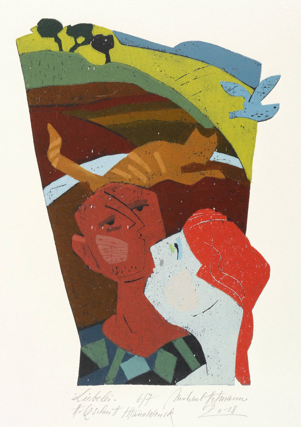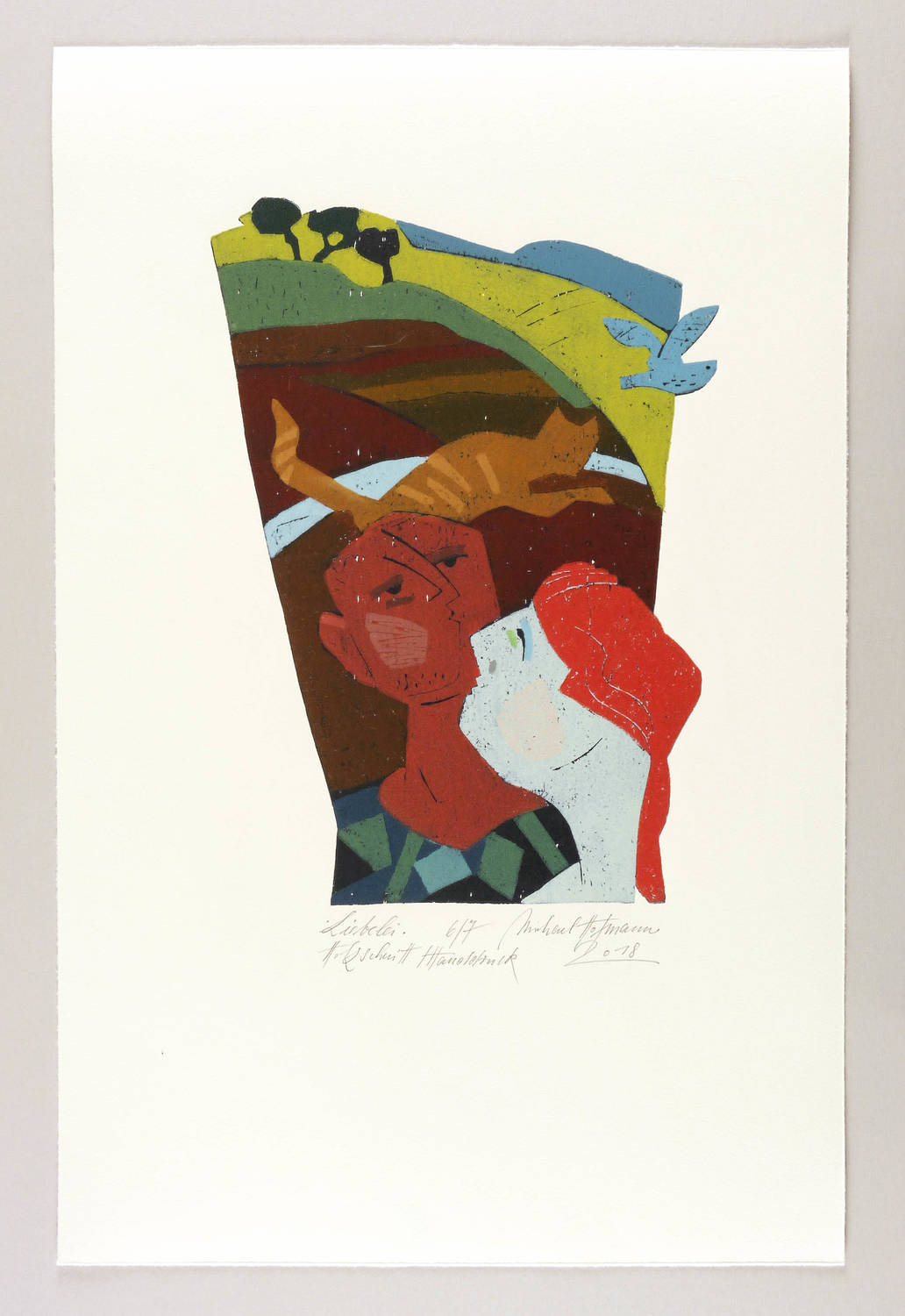 2018. Farbholzschnitt, auf Bütten. – Originale Künstlergrafik, von Michael Hofmann. – Auflage Exemplar Nr. 6/7. – 38,7 x 27,2 cm (Darstellung / Druckstock), 66,5 x 43 cm (Blatt).