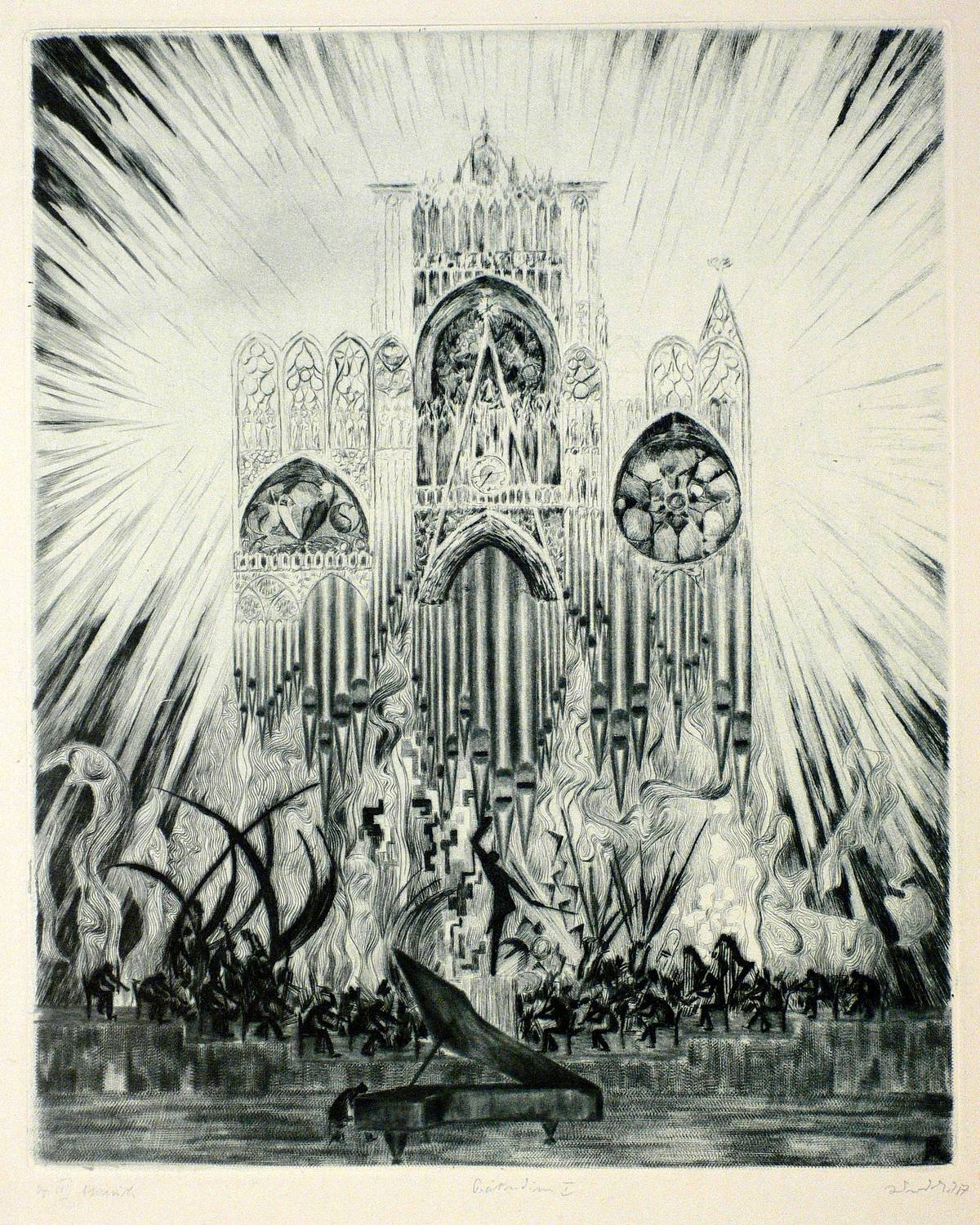 Alexander Friedrich (1895 Hamburg - 1968 Hamburg). Deutscher Radierkünstler, Holzschneider und Mosaizist des frühen Expressionismus in Hamburg. 1913-18 Schüler von Carl Otto Czeschka in Hamburg. Friedrich war Mitglied der expressionistischen Künstlergruppe "Kräfte" in Hamburg (mit Kinner von Dresler, Paul Adolf Seehaus, Andreas Luksch und Peter Luksch). Zu seinen Künstlerfreunden zählte Johannes Wüsten, der ihn porträtierte und ihm seine Erzählung "Ywon - Eine Geschichte vom doppelten Leben" widmete. Seine stark dem Expressionismus verpflichteten Bilderfindungen bewegen sich zwischen realistischer Naturschilderung und bizarrer Phantastik. Seine grafischen Mappenwerke (darunter Faust II, Musik, Inkarnationen, In aspectu orbis, Der Stein & Schwerindustrie) gelten aufgrund der niedrigen Auflagen als selten. In der Radierung neigte er zum experimentellen Ausweiten technischer Grenzen. Er beschäftigte sich mit Hercules Pieterszoon Seghers und der Geschichte des Tiefdrucks, wozu er das Buch "Handlung und Gestalt des Kupferstiches und der Radierung" (Essen: Fredebeul & Koenen 1931) veröffentlichte.