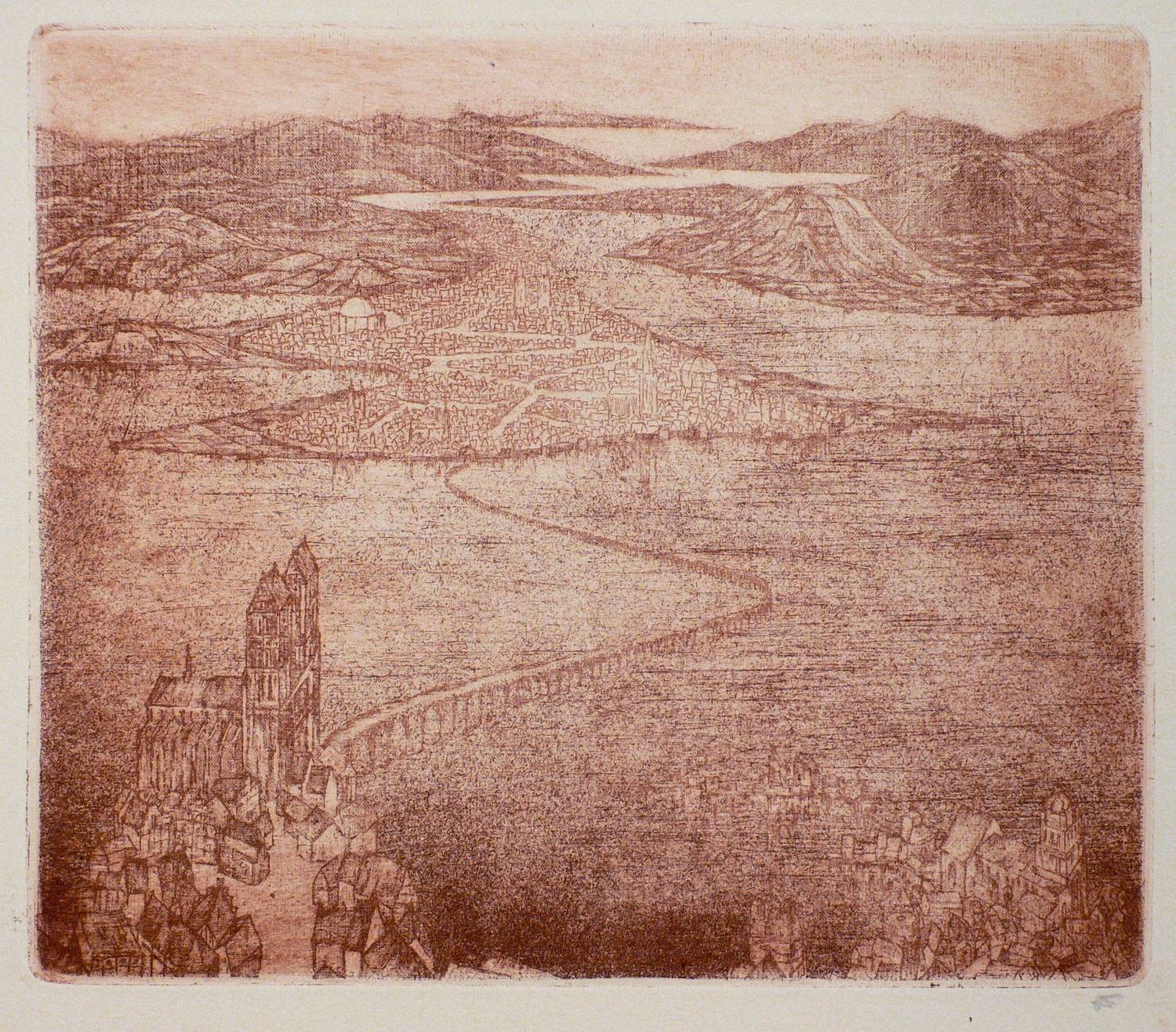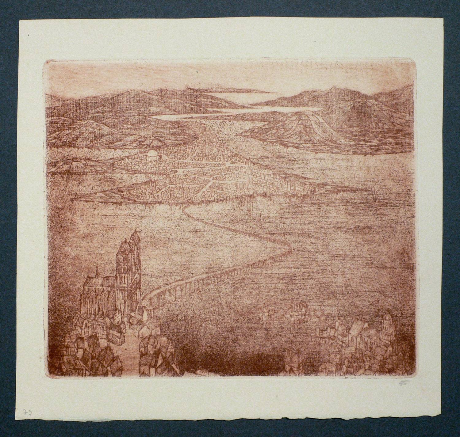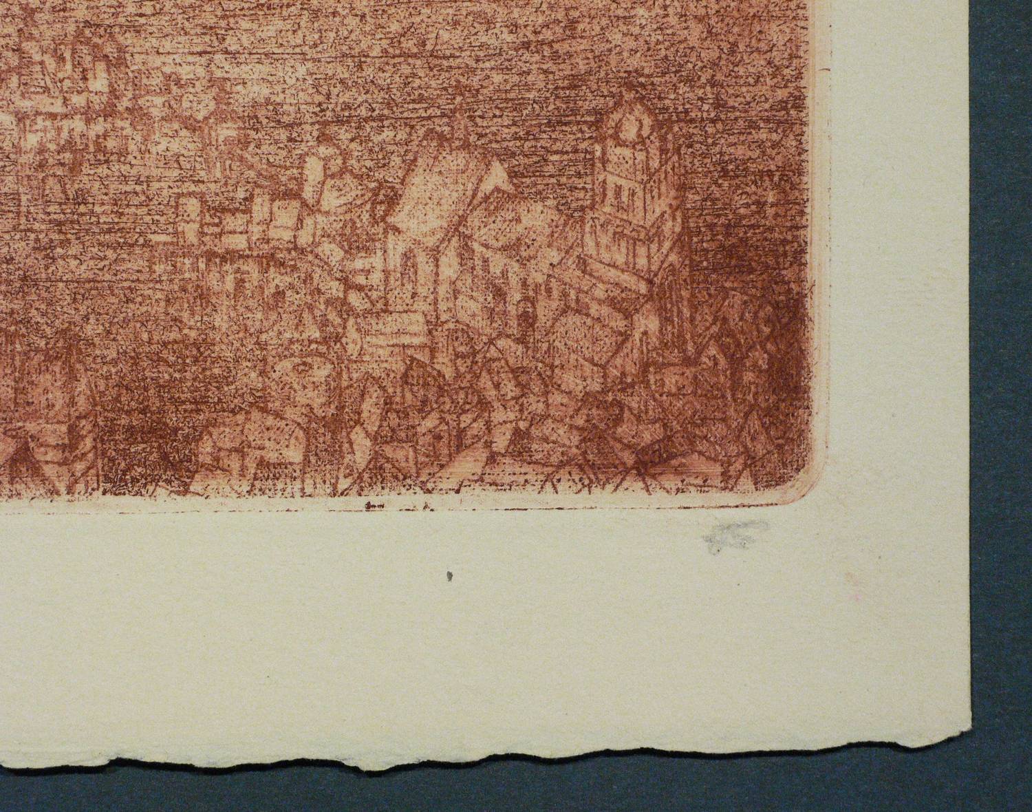 1922/1923. Radierung / Strichätzung, in Rotbraun, auf hellgelbem Büttenpapier. – Originale Künstlergrafik, von Alexander Friedrich. – 20,3 x 23,8 cm (Darstellung / Platte), 25 x 27 cm (Blatt).