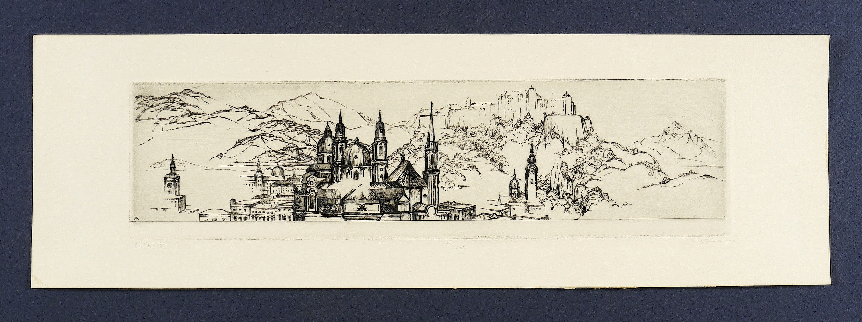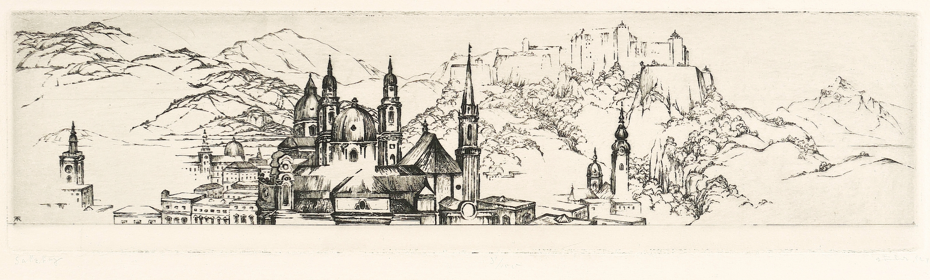 Rechts unter der Platte in Bleistift signiert und datiert, links betitelt und mittig mit eigenhändiger Auflagenbezeichnung versehen ″31/150″. – Rechts in der Darstellung die Benediktiner- Erzabtei mit der Stiftskirche St. Peter. Im Zentrum die Franziskanerkirche, die Kollegienkirche und der Salzburger Dom. Im Hintergrund die Festung Hohensalzburg. – Sehr gut erhaltenes Exemplar.