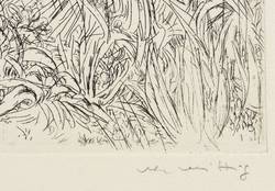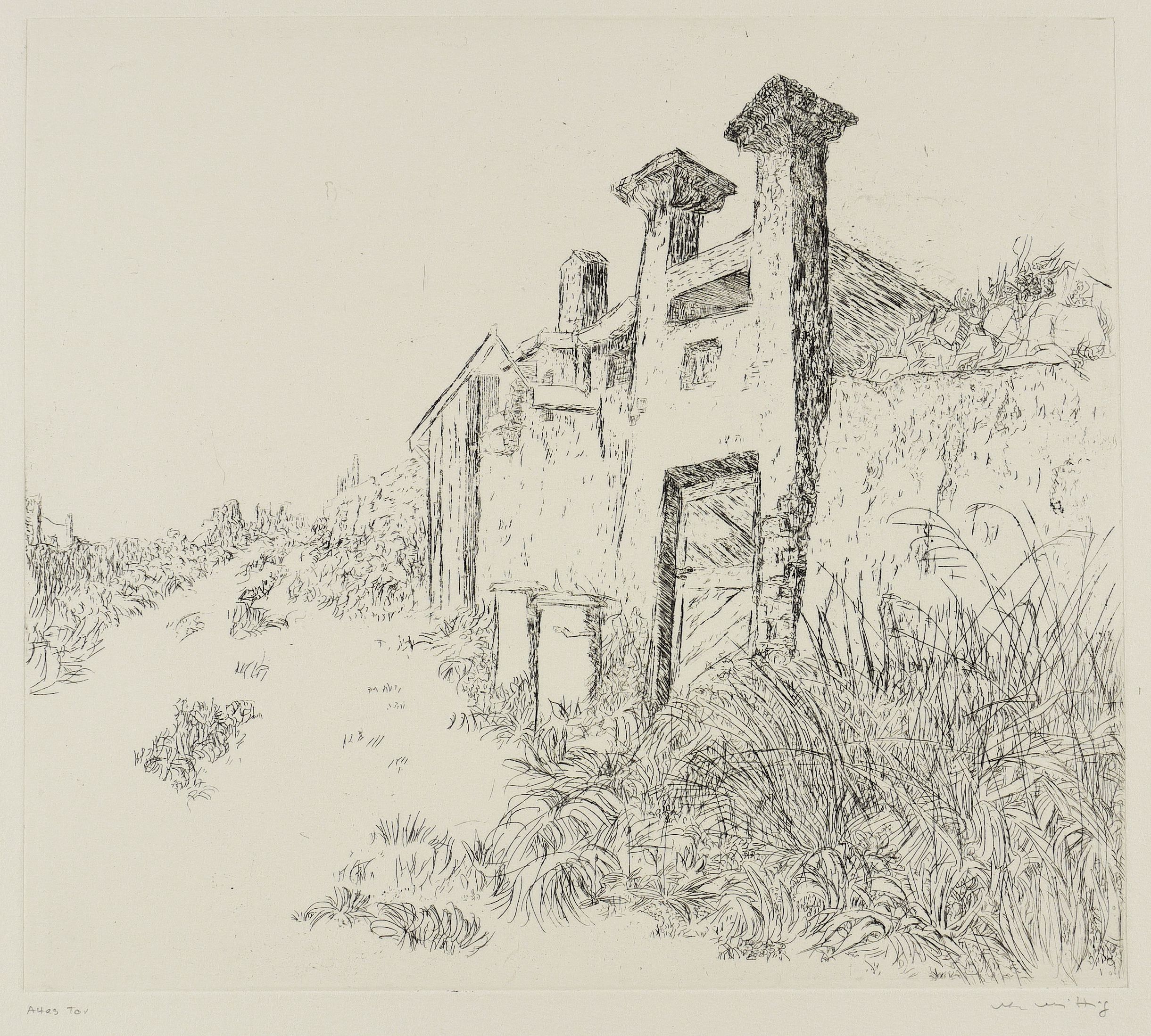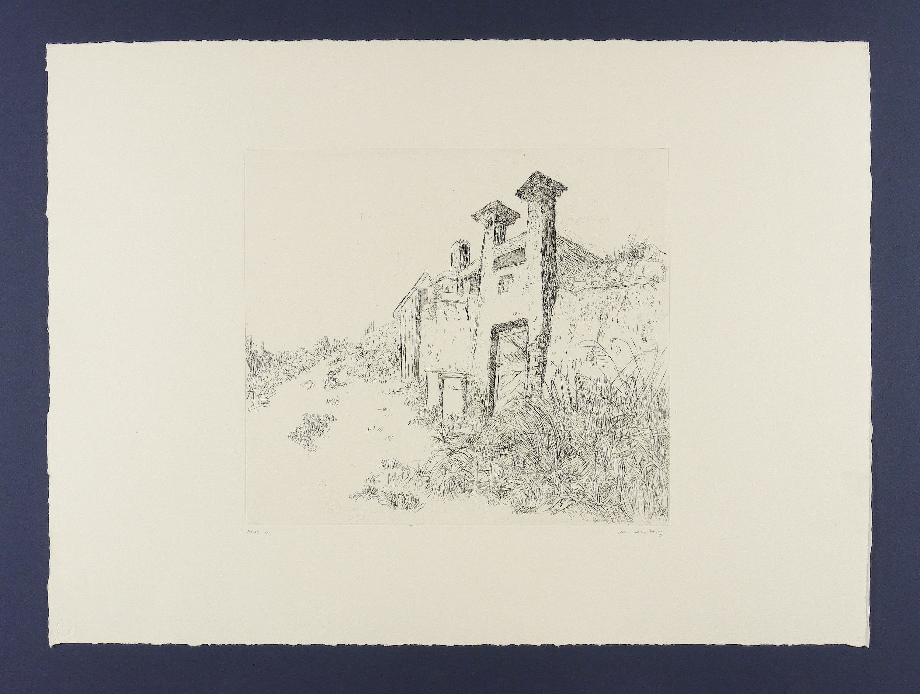 Um 1989. Radierung / Strichätzung, in Schwarz, auf gelblichem Büttenpapier. – Originale Künstlergrafik, von Ute Wittig. – 24,5 x 27,5 cm (Darstellung / Platte), 39 x 54 cm (Blatt).