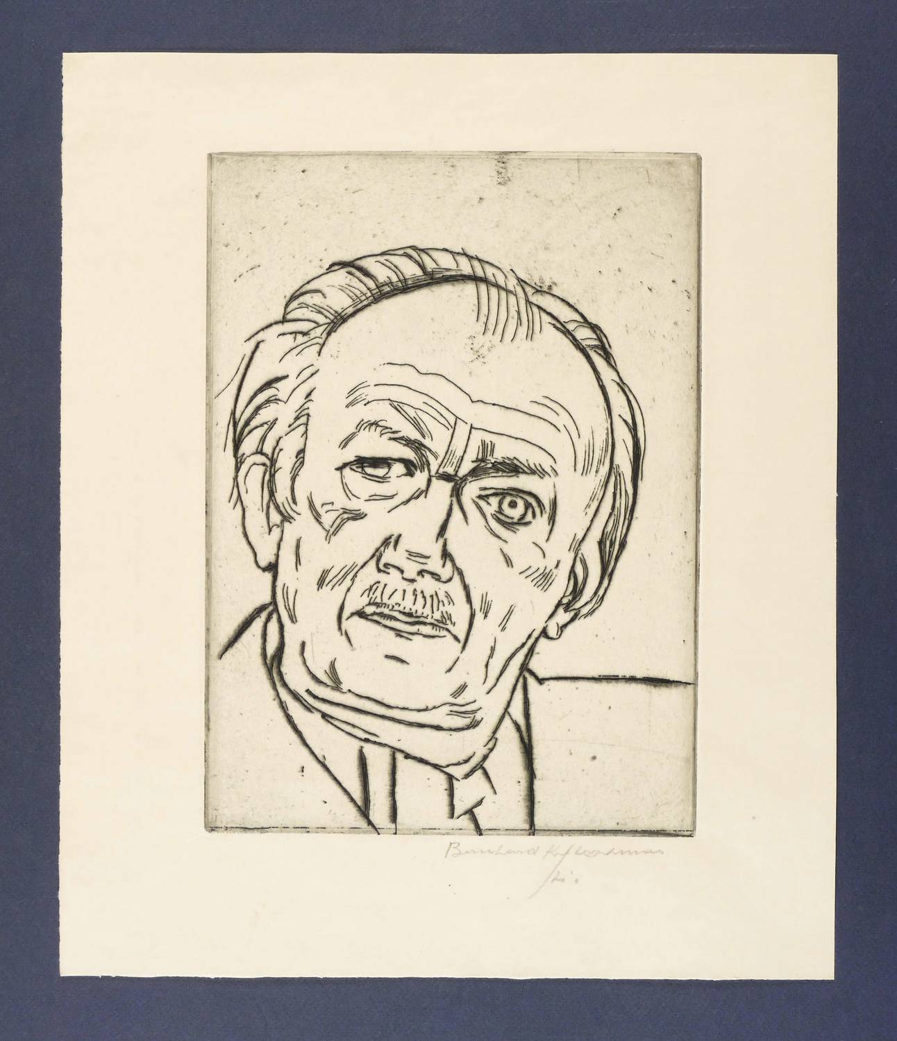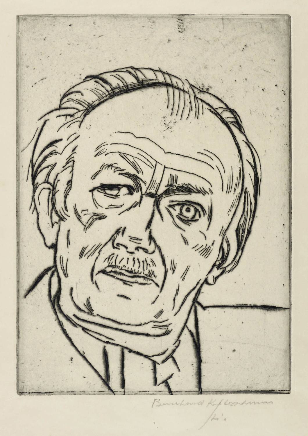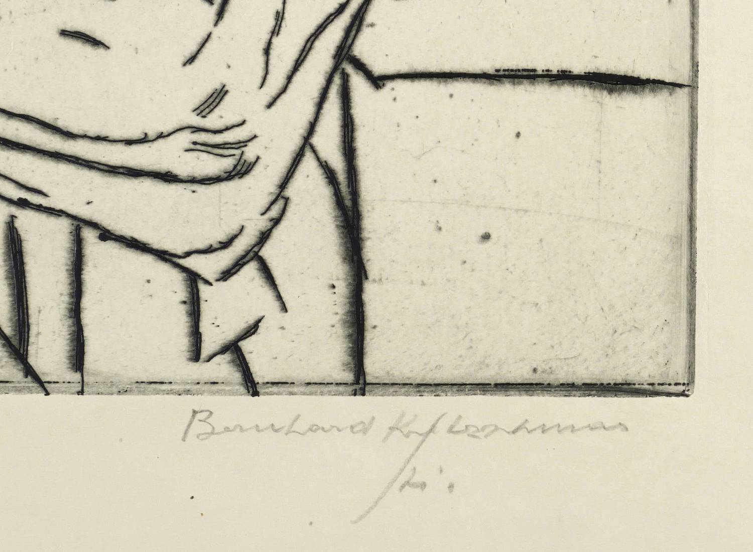 Um 1950. Radierung / Strichätzung, mit Plattenton, in Schwarz, auf gelblichem Kupferdruckkarton. – Originale Künstlergrafik, von Bernhard Kretzschmar. – 30,3 x 22,0 cm (Darstellung / Platte), 41 x 35 cm (Blatt).