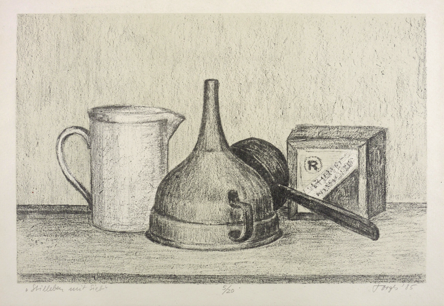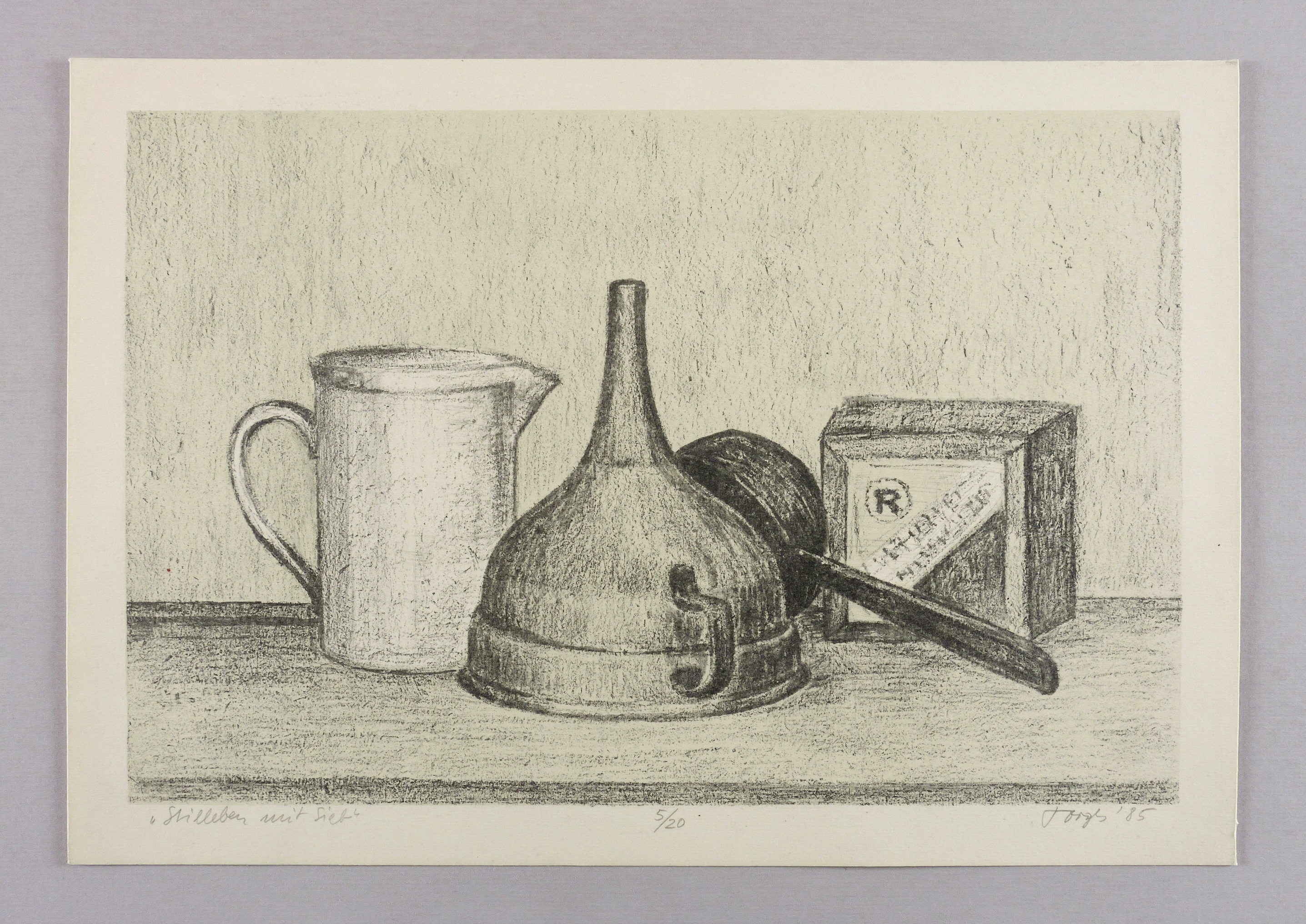 Rechts unten in Bleistift signiert und datiert: ″Torges 85″. Links Titel: ″Stilleben mit Sieb″. Mittig Auflagenbezeichnung: ″5/20″. – Sehr guter Zustand.