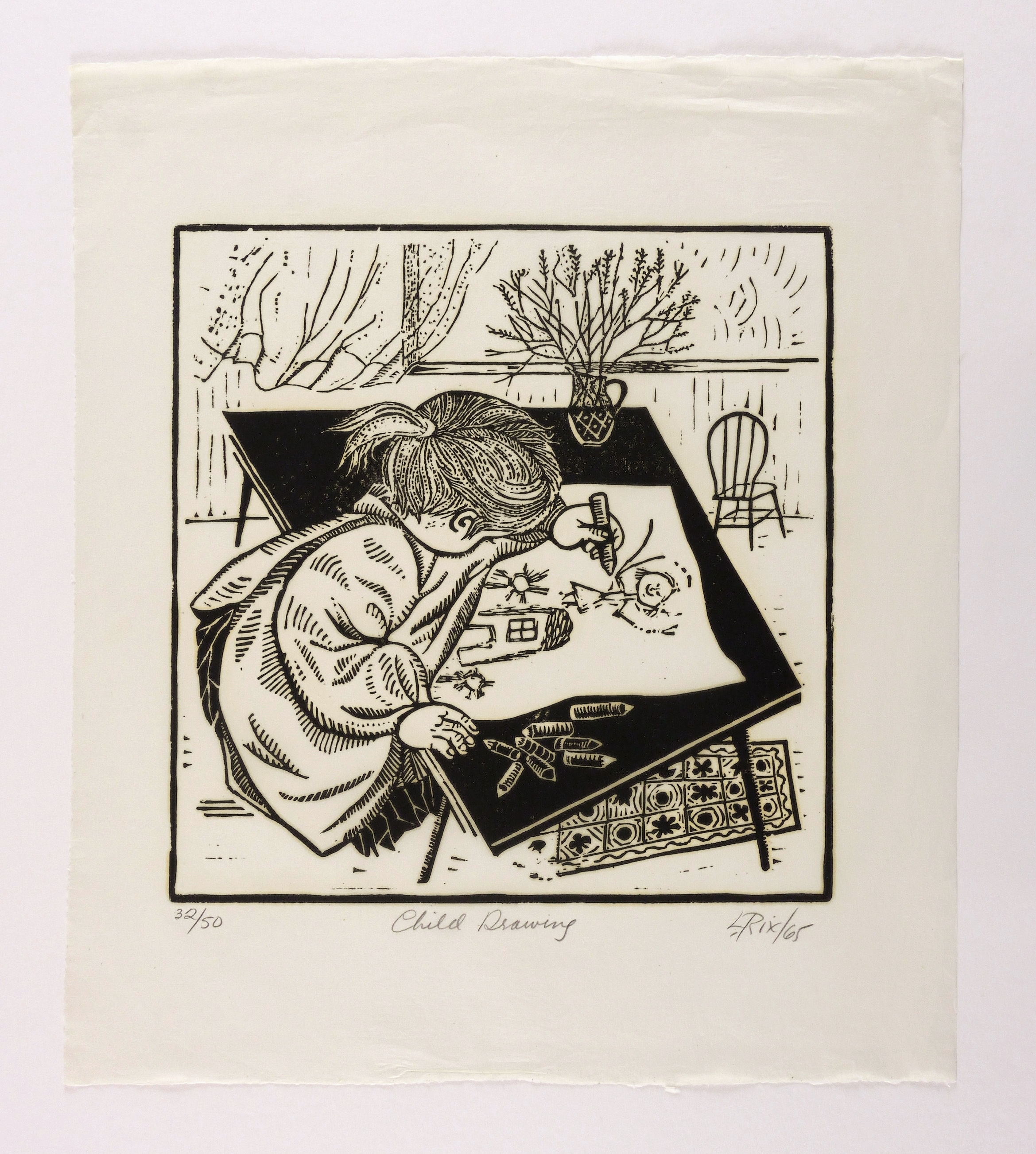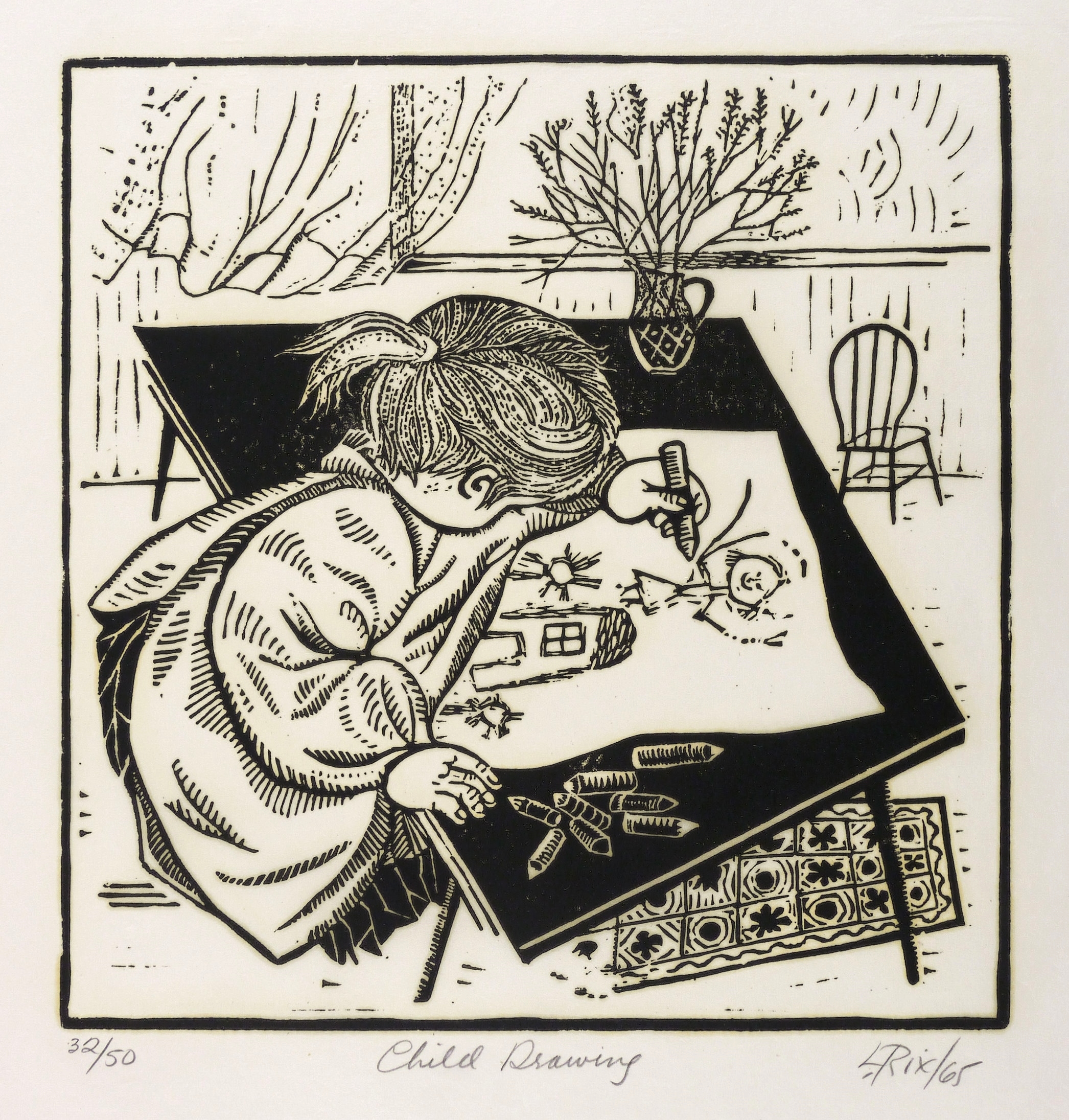Rechts unten in Bleistift signiert und datiert: ″L. Rix 65″. Links Auflagenbezeichnung: ″32/50″. Mittig Titel: ″Child Drawing″. – Sehr guter Zustand.