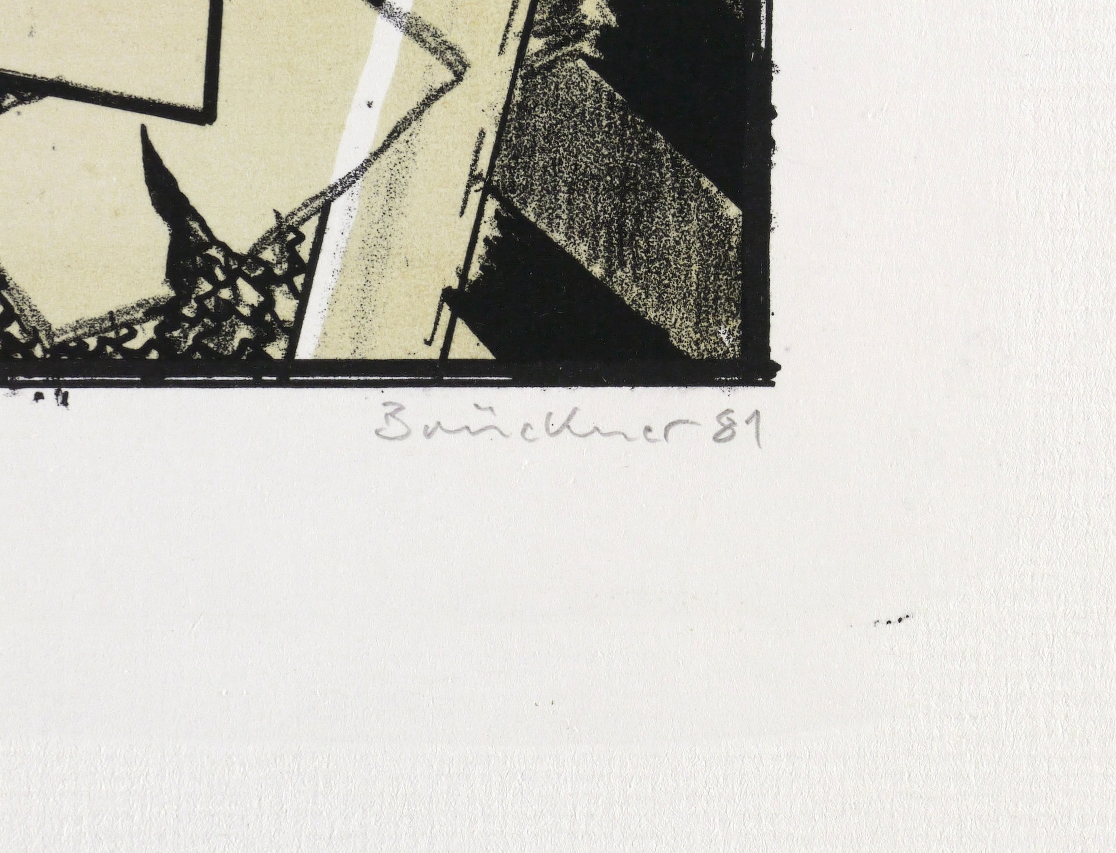 Rechts unten in Bleistift signiert und datiert: ″Brückner 81″. Links Auflagenbezeichnung: ″30/35″. Mittig Titel: ″'Von Größe und Elend / Vom Verfall zum Triumph' für J.R. Becher″. – Sehr guter Zustand.