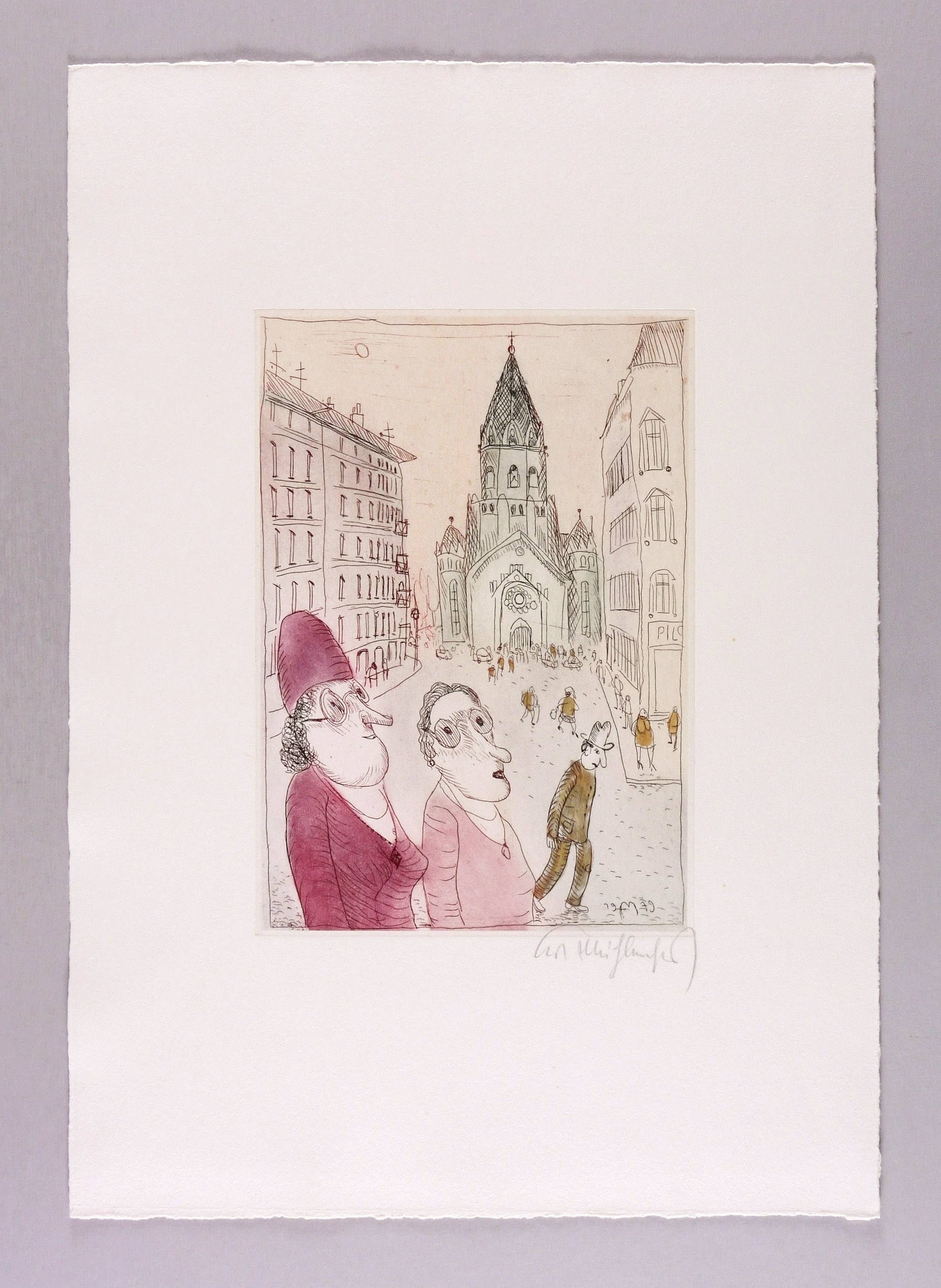 1979. Farbradierung / Strichätzung, in 4 Farben, auf schwerem hellchamois Büttenkarton. – Originale Künstlergrafik, von Kurt Mühlenhaupt. – 29,2 x 20,7 cm (Darstellung / Platte), 54 x 38 cm (Blatt).