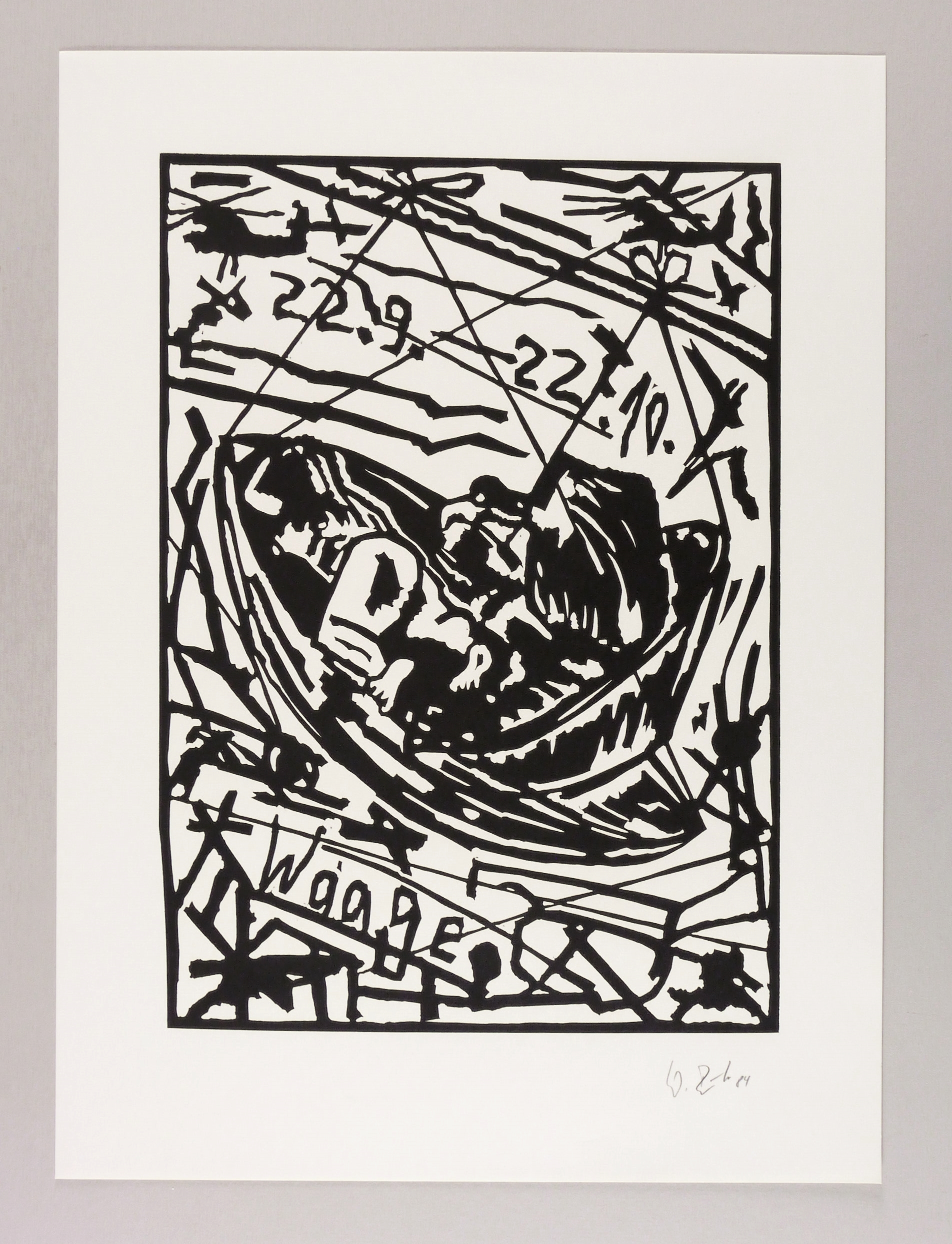 Griffelkunst 235 B4. – Rechts unten in Bleistift signiert und datiert: ″W. Büttner 84″. Im Druckstock Inschrift: ″22.9.-22.10. // Waage″. – Sehr guter Zustand.