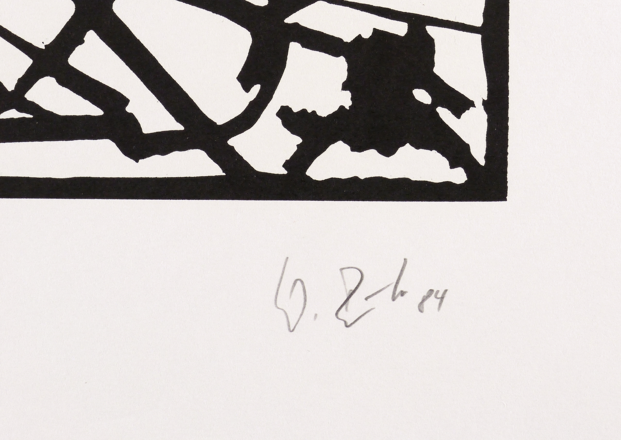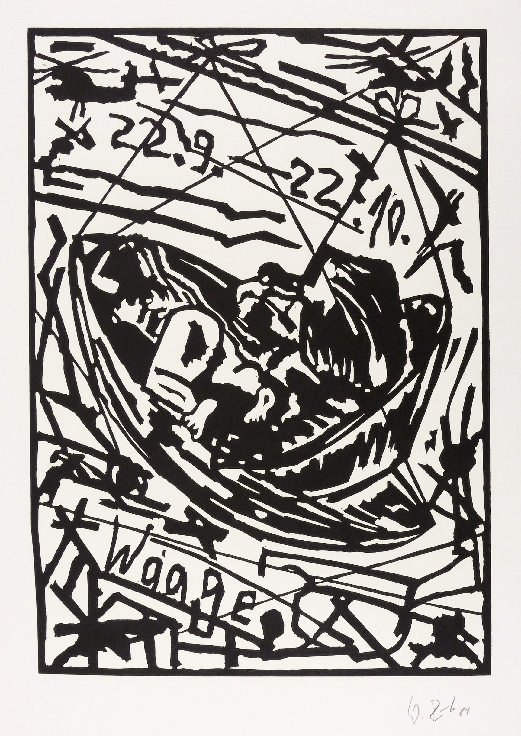 1984. Linolschnitt, in Schwarz, auf weißem Werkdruck. – Originale Künstlergrafik, von Werner Büttner. – 42,4 x 30,1 cm (Darstellung / Druckbild), 55 x 40 cm (Blatt).