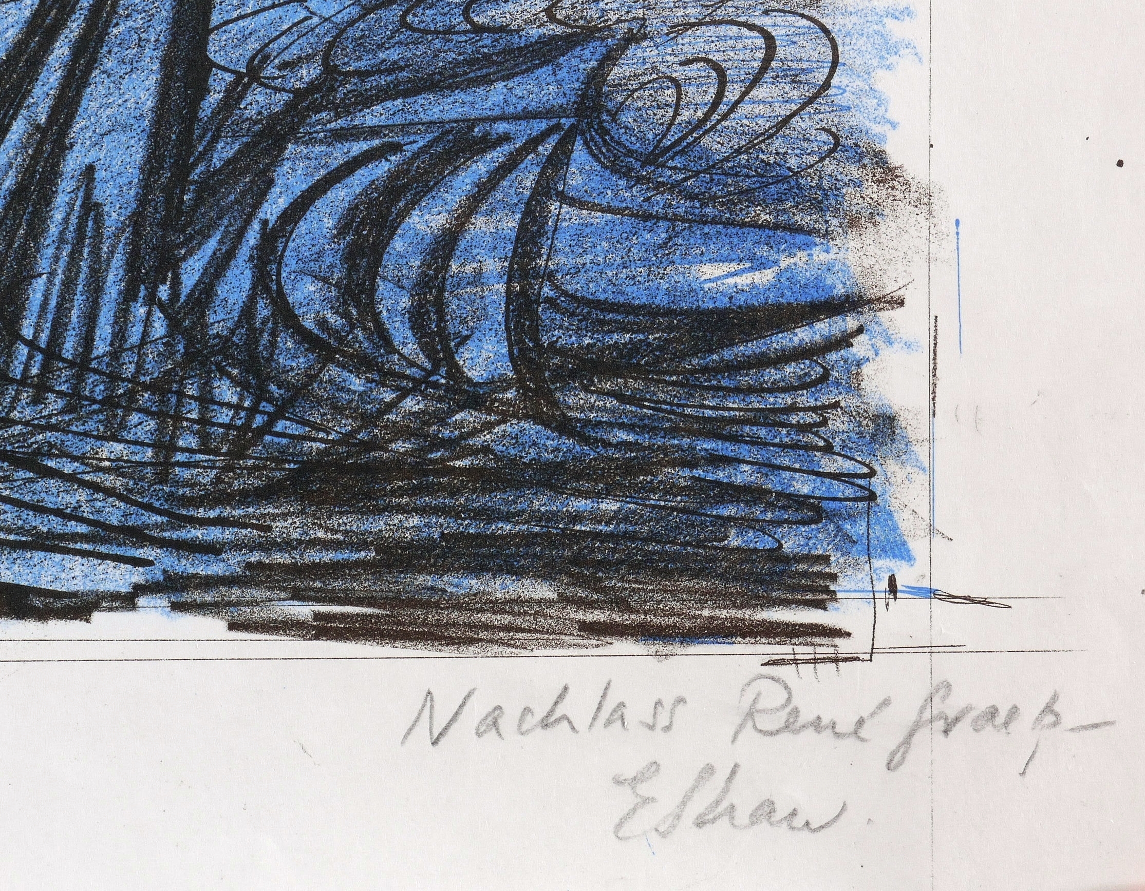 1974. Farblithografie / Kreide- & Pinsellithografie, in Blau & Schwarz, auf leichtem hellgelbem Werkdruck. – Originale Künstlergrafik, von René Graetz. – 54 x 65 cm (Blatt), 46,5 x 57,5 cm (Darstellung / Druckbild).