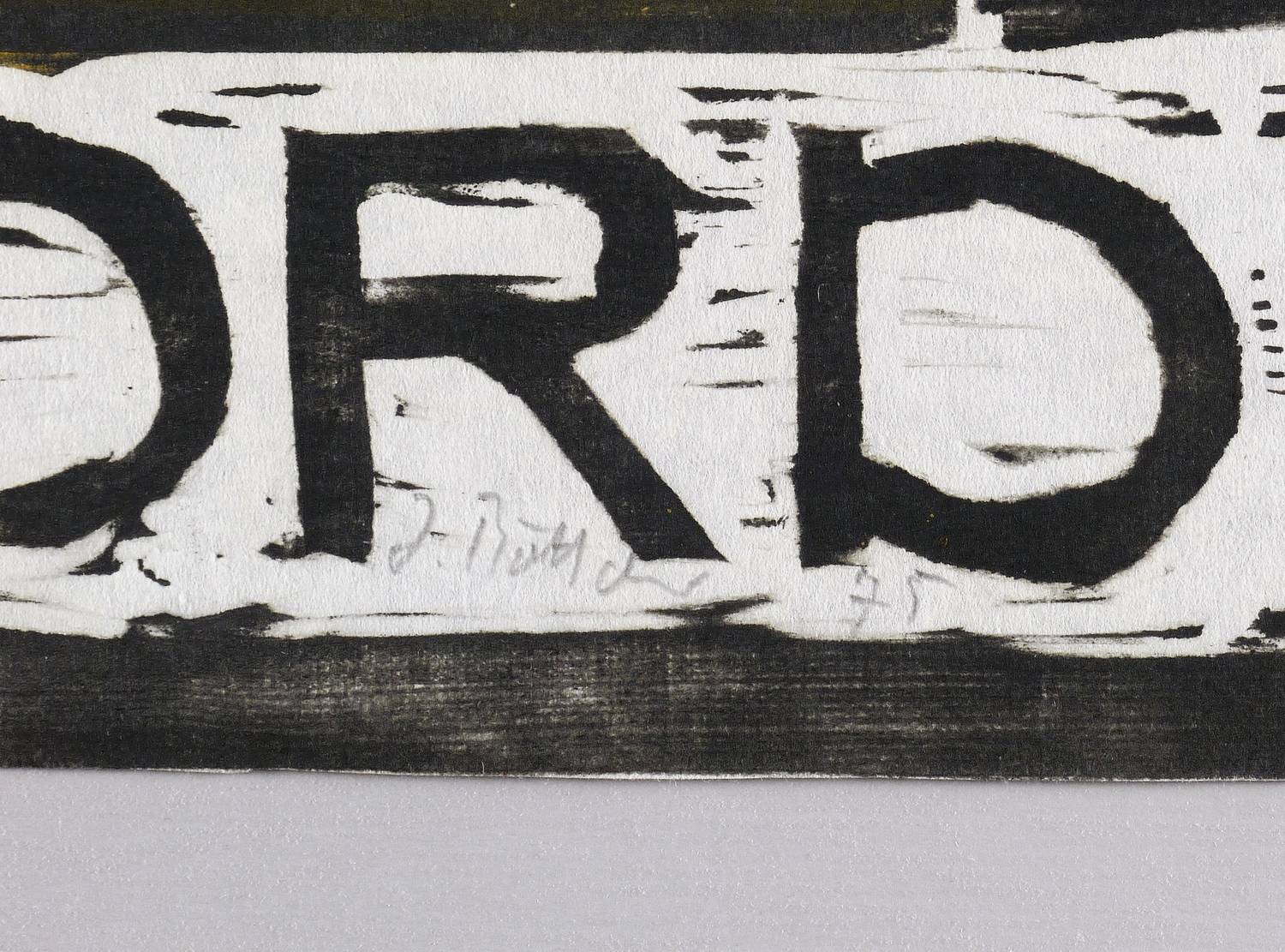 Rechts unten in Bleistift signiert und datiert: ″J. Böttcher 75″. Im Druckstock diverse Inschrift. – Originalgrafisches Künstlerplakat zur Ausstellung ″Joachim Böttcher. Aquarelle, Zeichnungen″ in der Galerie Nord in Dresden Februar-März 1975. – Kleine Randrisse hinterlegt. Guter Zustand.