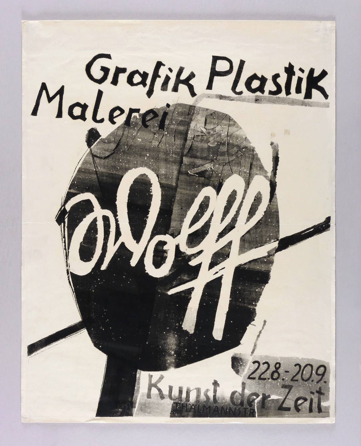 Rechts unten in schwarzer Feder signiert und datiert: ″Wolff 65″. – Unikates (!) originalgrafisches Künstlerplakat zur Personalausstellung ″Willy Wolff. Grafik, Plastik. Malerei″ vom 22.8.-20.9.1968 in der Genossenschaftsgalerie Kunst der Zeit in Dresden. – Nach einer Besichtigung durch Funktionäre, darunter Lea Grundig und der Direktor des stadtgeschichtlichen Museums Rudolf Förster, wurde die Ausstellung verboten. Trotzdem wurde die Ausstellung zum Erfolg, da die nur halbherzig gesperrte Ausstellung nun umso mehr Besucher anzog. – Papier durchgehend knickspurig. Drei hinterlegte winzige Randrisse. In den Blattecken Reißzwecklöchlein. Eine horizontale Falte weitgehend ausgelegen. Mäßig guter Zustand.