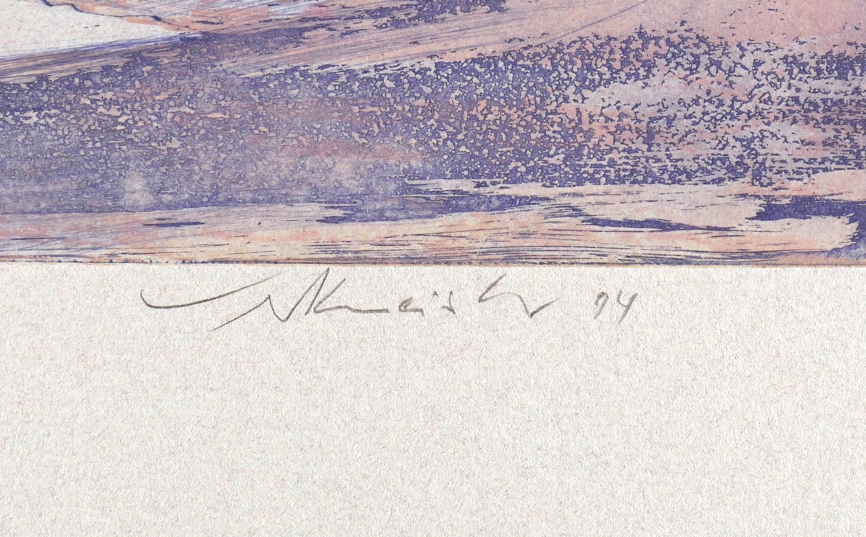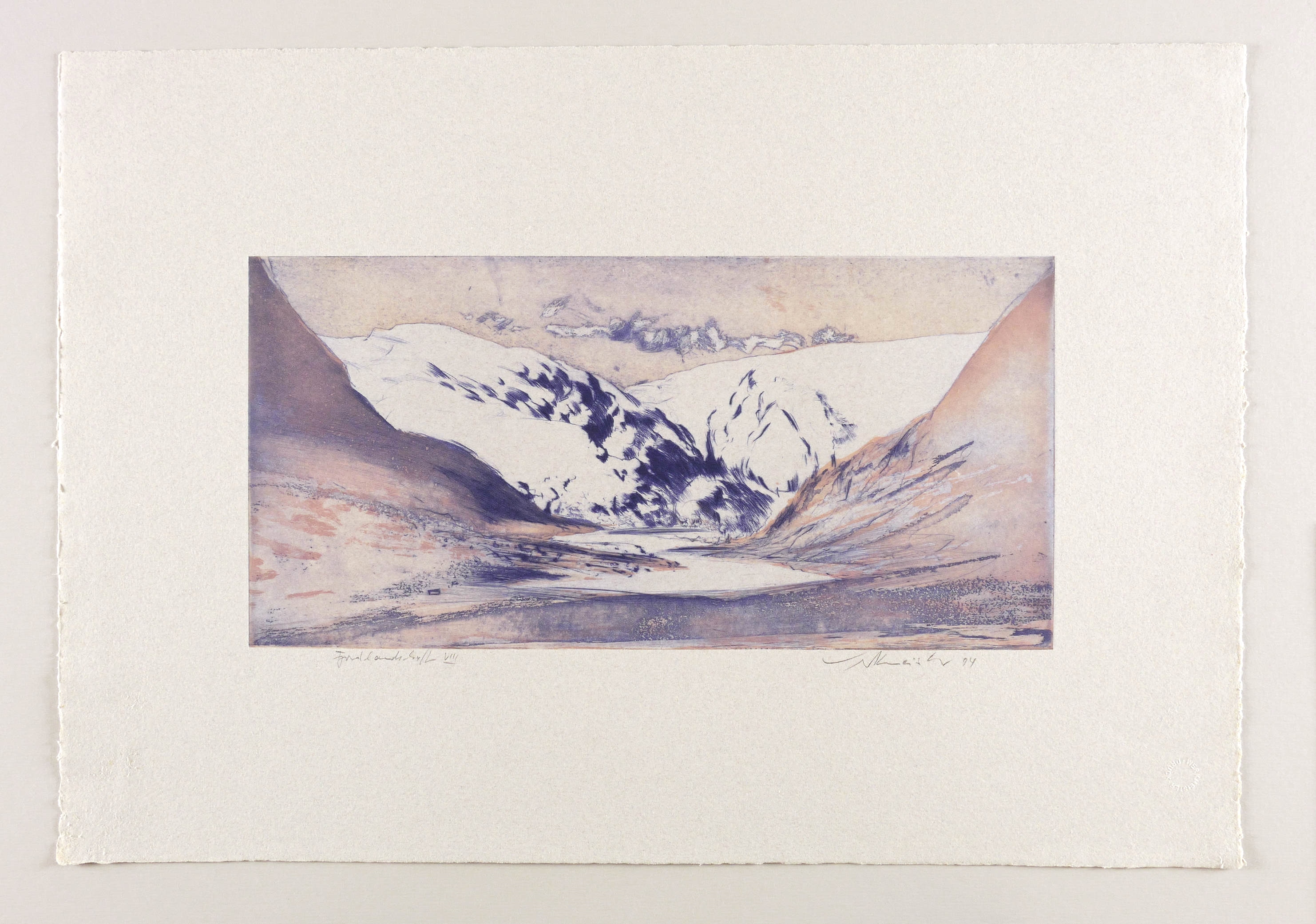 WVZ 434. – Rechts unten in Bleistift signiert und datiert: ″Werkmeister 94″. Links Titel. In der Blattecke rechts unten Trockenstempel: ″WERKMEISTER DRUCK″. – Kombinationsdruck unter Verwendung der 1986 radierten Platte ″Fjordlandschaft VIII″ (WVZ 337) und einer 1994 neu ratierten Tonplatte als Farbradierung gedruckt. Es existieren nur 6 Probedrucke. – Tadellos. Sehr guter Zustand.