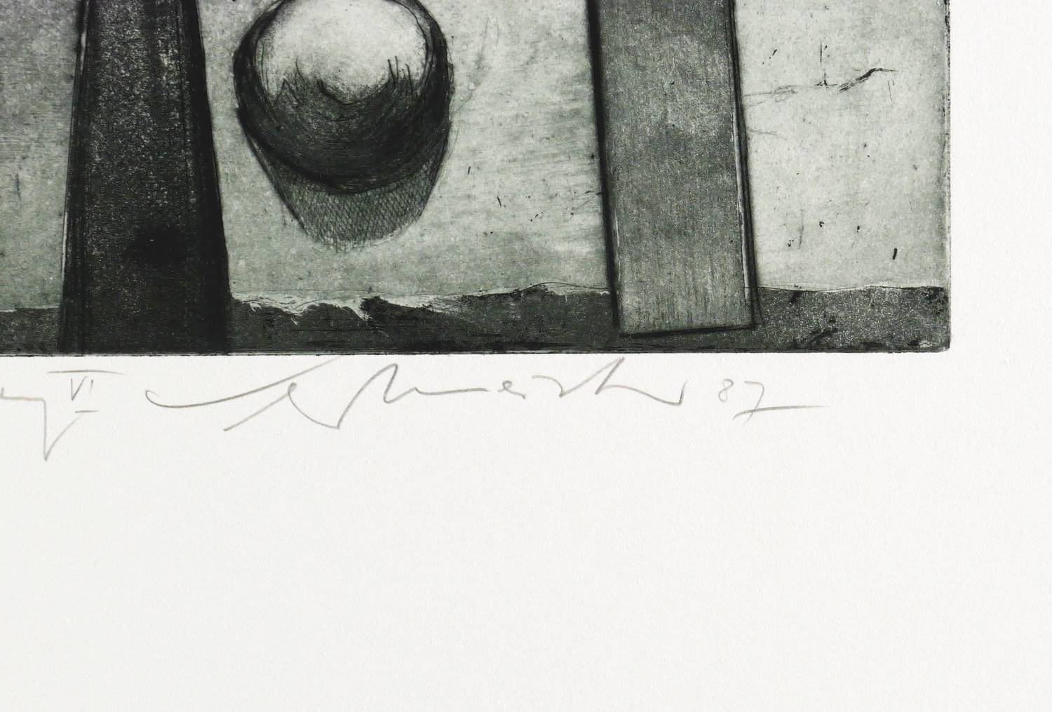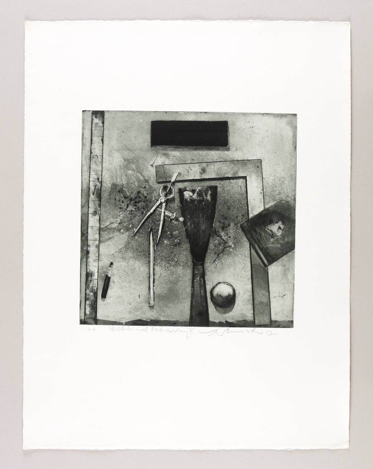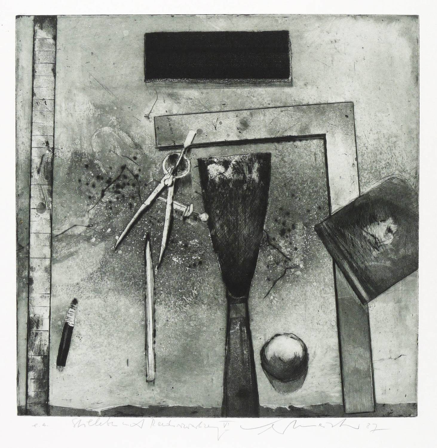 1987. Radierung / Aquatinta, Reservage, Strichätzung & Kaltnadel, in Schwarzgrün, auf BFK-Rives-Bütten. – Originale Künstlergrafik, von Wolfgang Werkmeister. – Künstlerexemplar (e.a.). – 32,8 x 32,8 cm (Darstellung / Platte), 66 x 50 cm (Blatt).