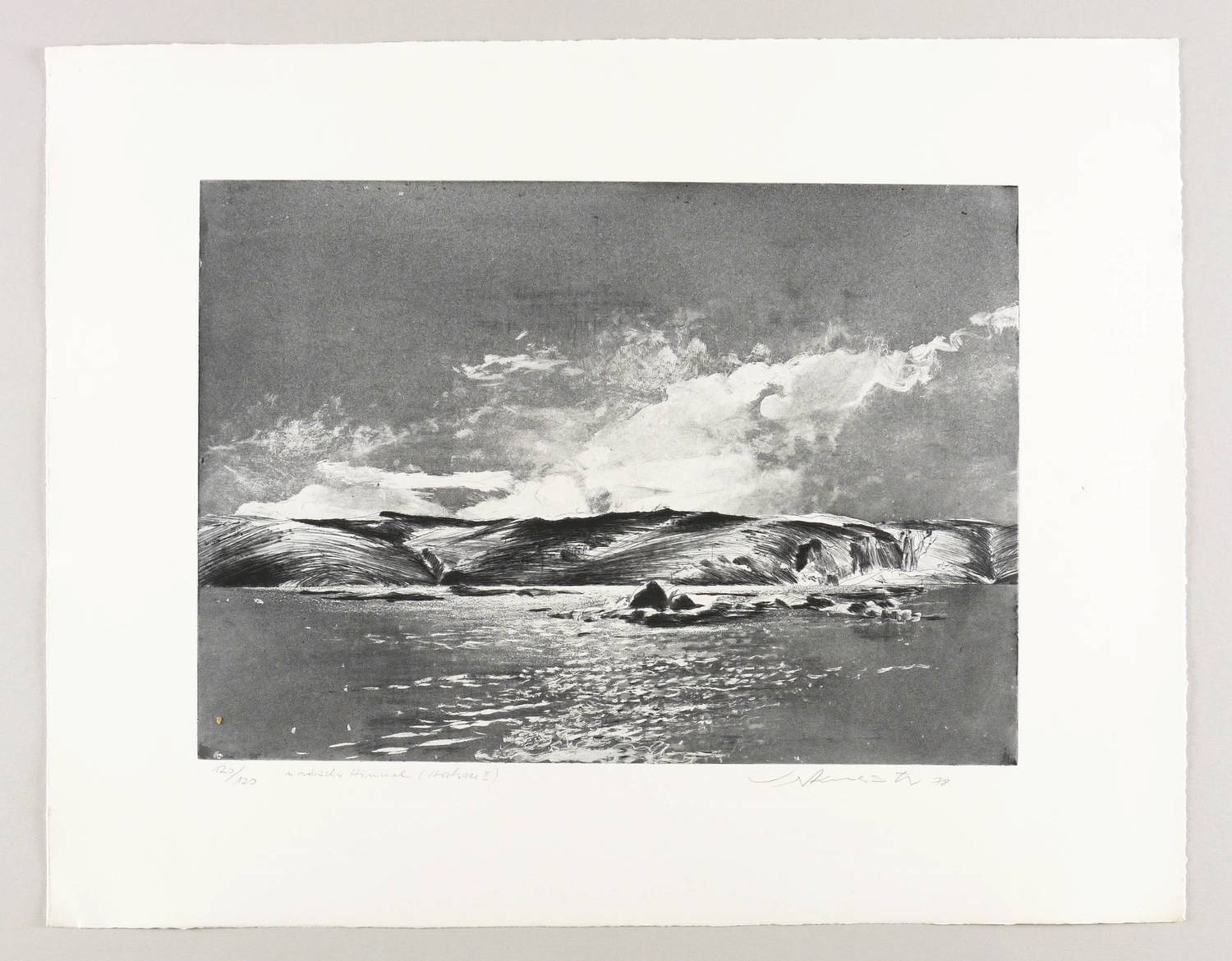 Wolfgang Werkmeister (*1941 Berlin, lebt und arbeitet in Hamburg). Deutscher Grafiker, bedeutender Vertreter der zeitgenössischen Radierkunst. 1960-64 Besuch der Akademie der Bildenden Künste Stuttgart, Fachklasse für freie Grafik und Illustration bei Gunther Böhmer. 1965 Besuch der Fachhochschule für Gestaltung Hamburg bei W. M. Busch und S. Oelke. 1966-68 tätig als Pressezeichner. 1972/73 Dozent an der Fachhochschule für Gestaltung, Hamburg. Zahlreiche Auslanfsaufenthalte und Stipendien in Marokko, USA, auf den Kanarischen Inseln, etc. 2001 Kunstpreis der Stadt Baden-Baden. Zentrales Ausdrucksmittel ist die Radierung, genauer die Aquatinta, in der er Landschaft als Hauptmotiv regelrecht zelebriert und in technisch ebenso aufwändigen wie raffinierten Blättern druckgrafisch umsetzt. Stilistisch siedelt sein Werk zwischen einem geschickt eingesetzten Fotorealismus und der lakonischen Bildsprache eines Ansel Adams.