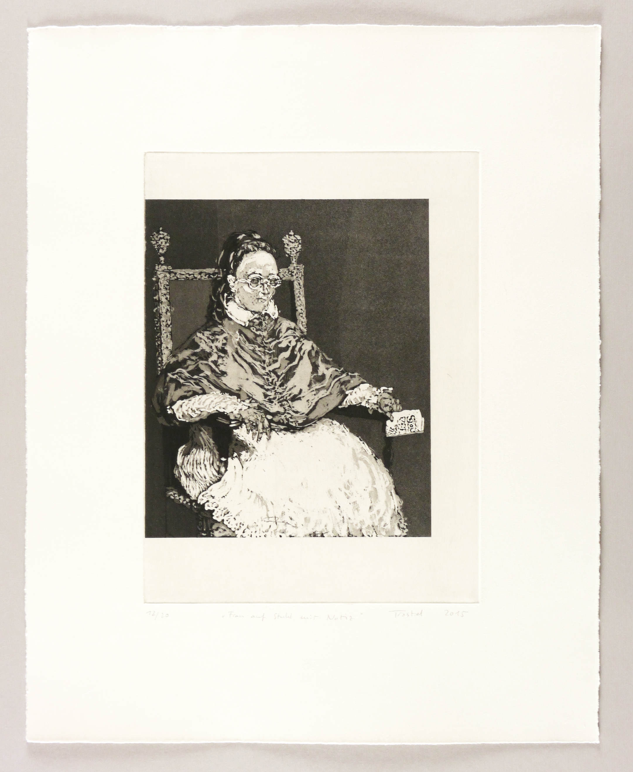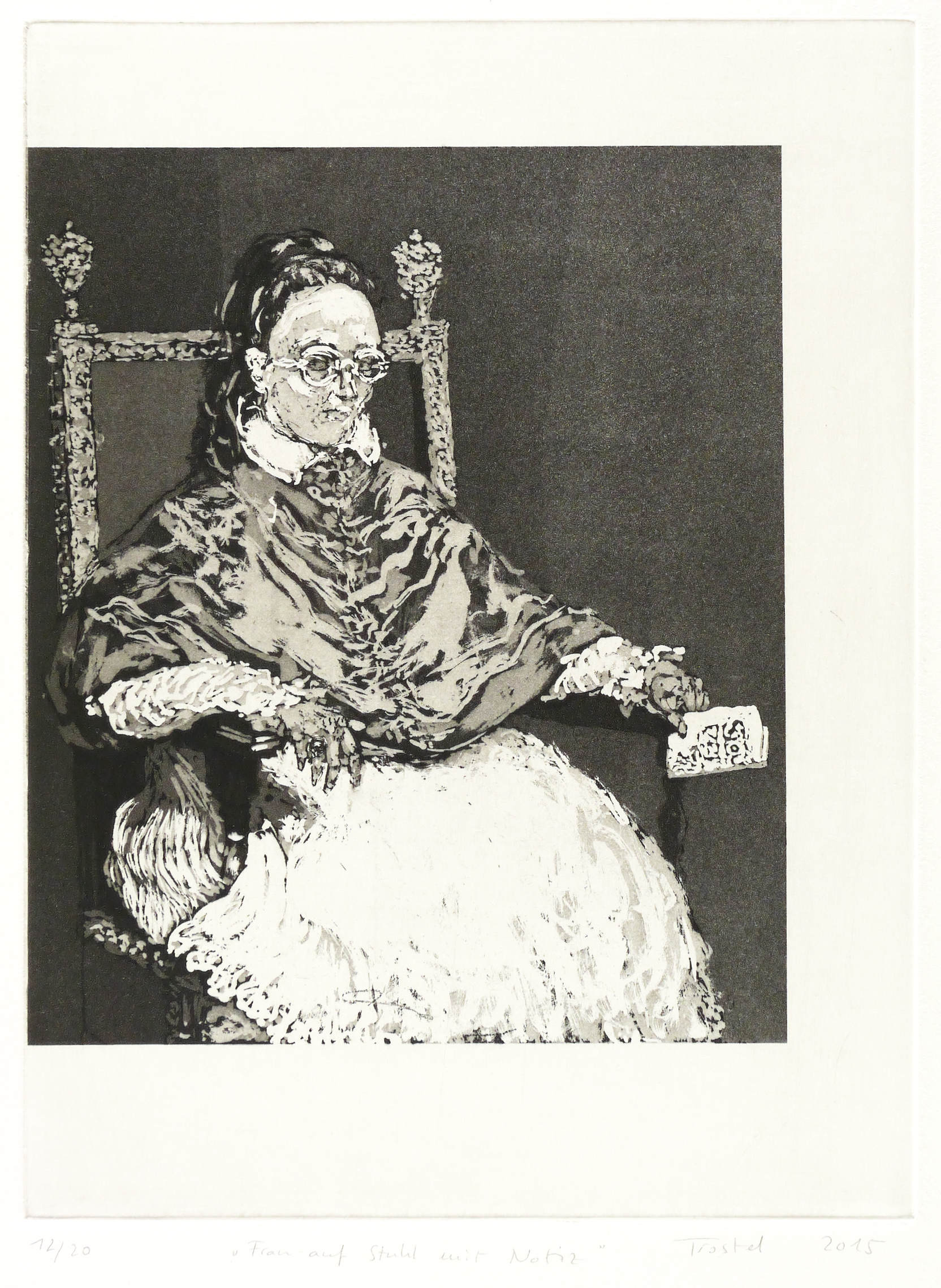 Trostel-Santander, Iris. – „Frau auf Stuhl mit Notiz”.