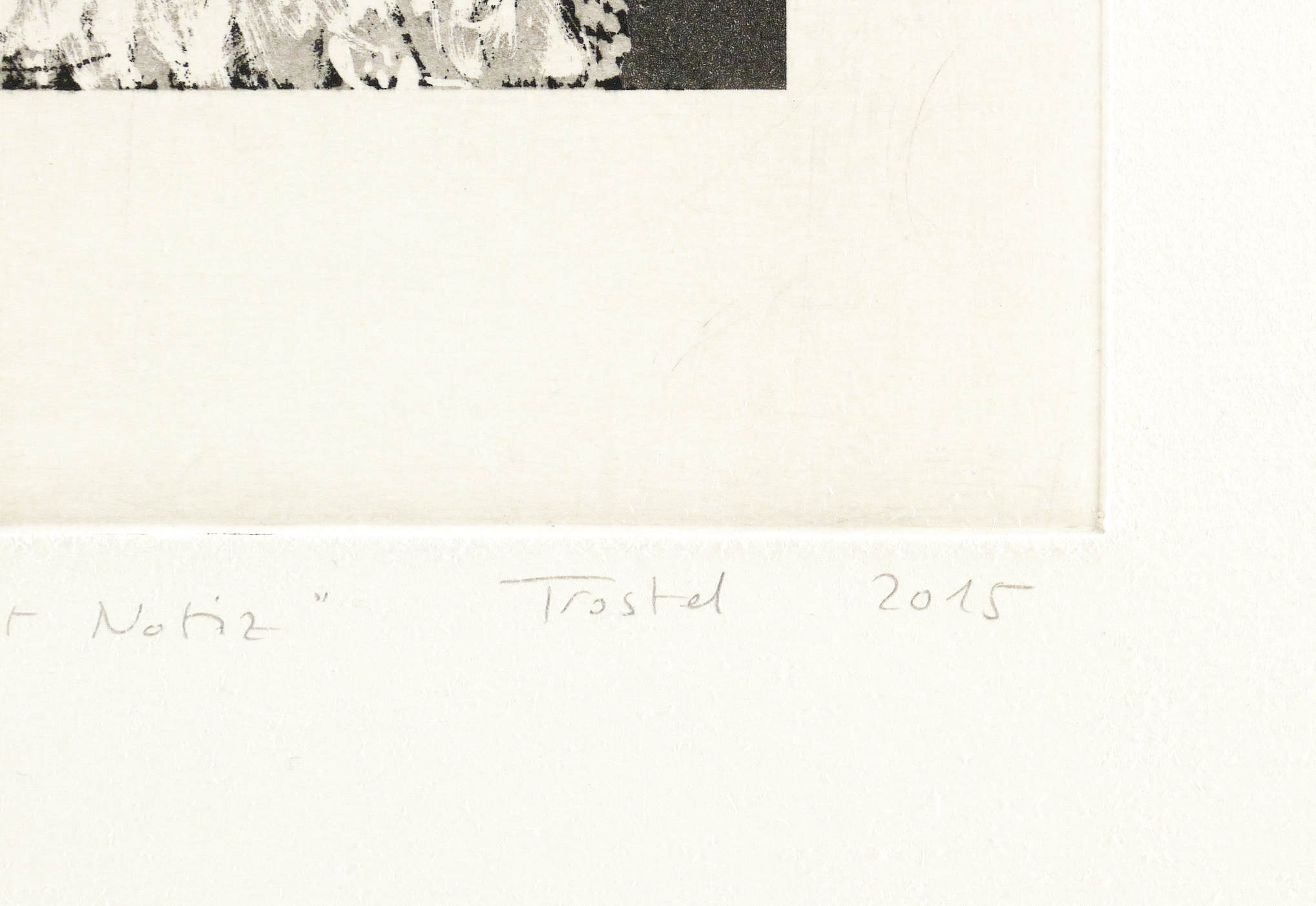 2015. Radierung / Aquatinta, in Schwarz, auf Hahnemühle-Bütten. – Originale Künstlergrafik, von Iris Trostel-Santander. – Auflage Exemplar Nr. 12/20. – 31,5 x 23,4 cm (Darstellung / Platte), 50 x 40 cm (Blatt).