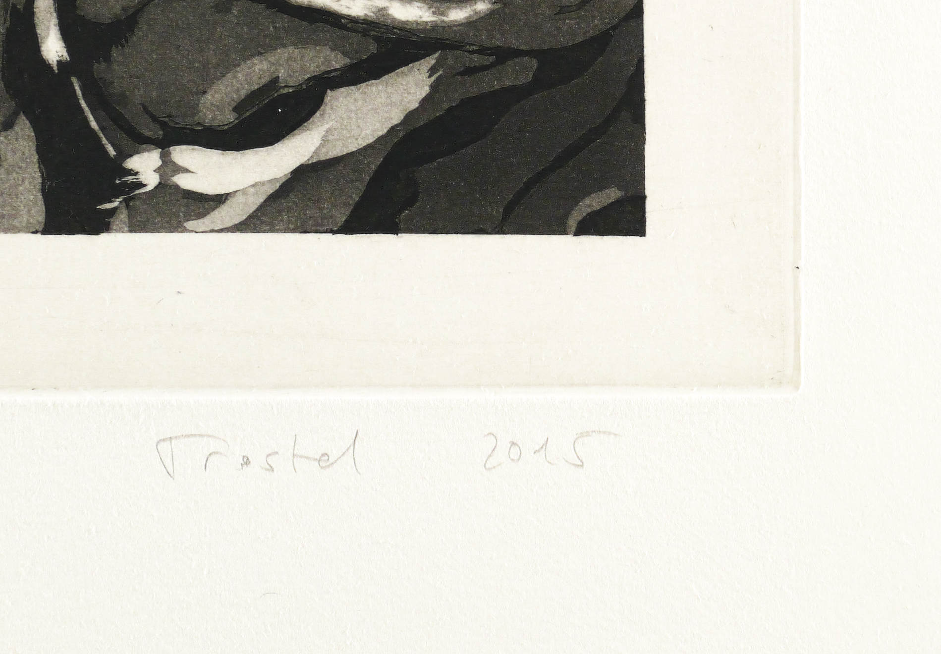 2015. Radierung / Aquatinta, in Schwarz, auf Hahnemühle-Bütten. – Originale Künstlergrafik, von Iris Trostel-Santander. – Auflage Exemplar Nr. 12/25. – 23,9 x 31,8 cm (Darstellung / Platte), 40 x 50 cm (Blatt).
