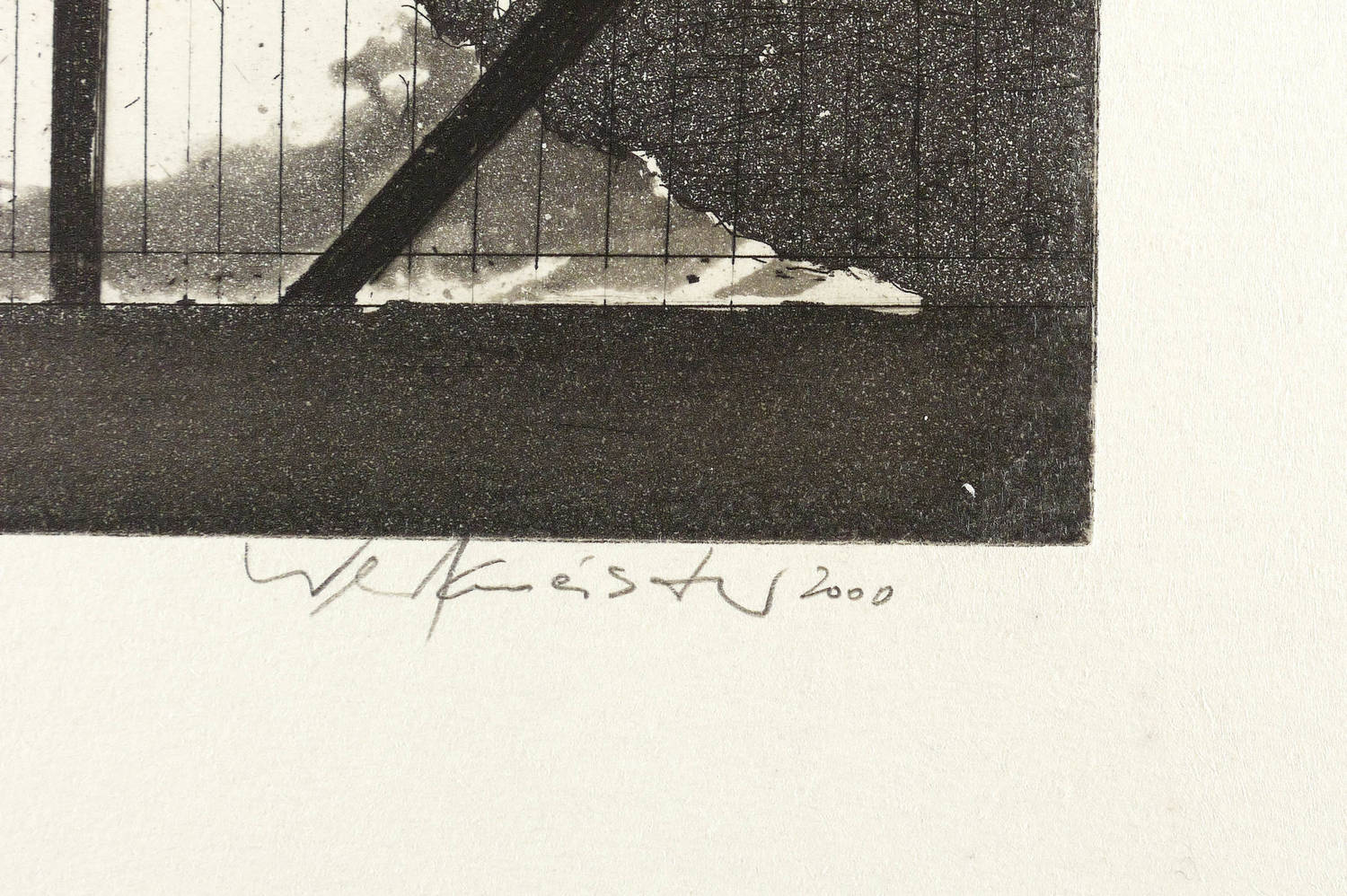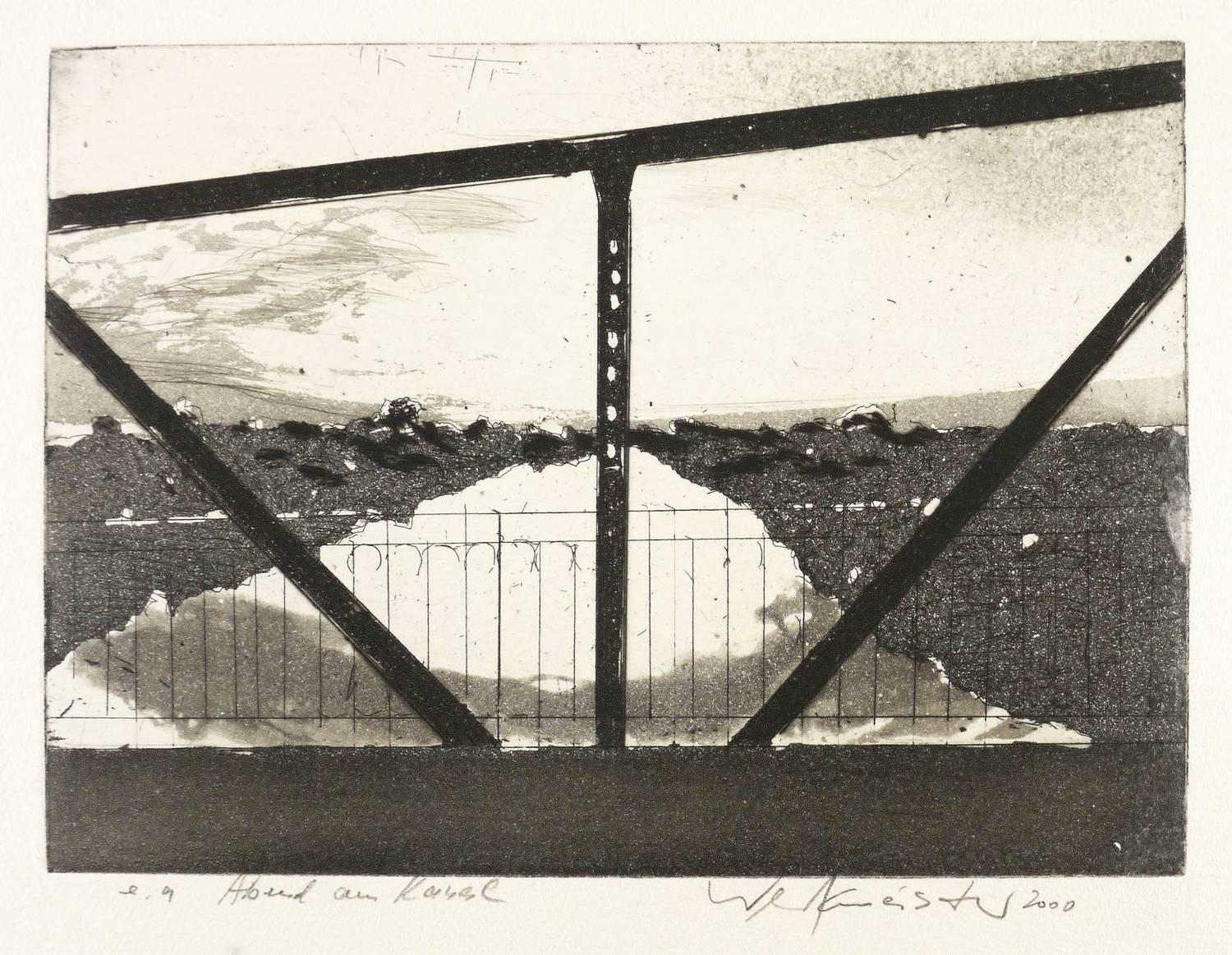 2000. Radierung / Aquatinta & Strichätzung, in Schwarz, auf hellgelbem Velin. – Von Wolfgang Werkmeister. – Künstlerexemplar (e.a.). – 14,4 x 19,7 cm (Darstellung / Platte), 28 x 36 cm (Blatt).