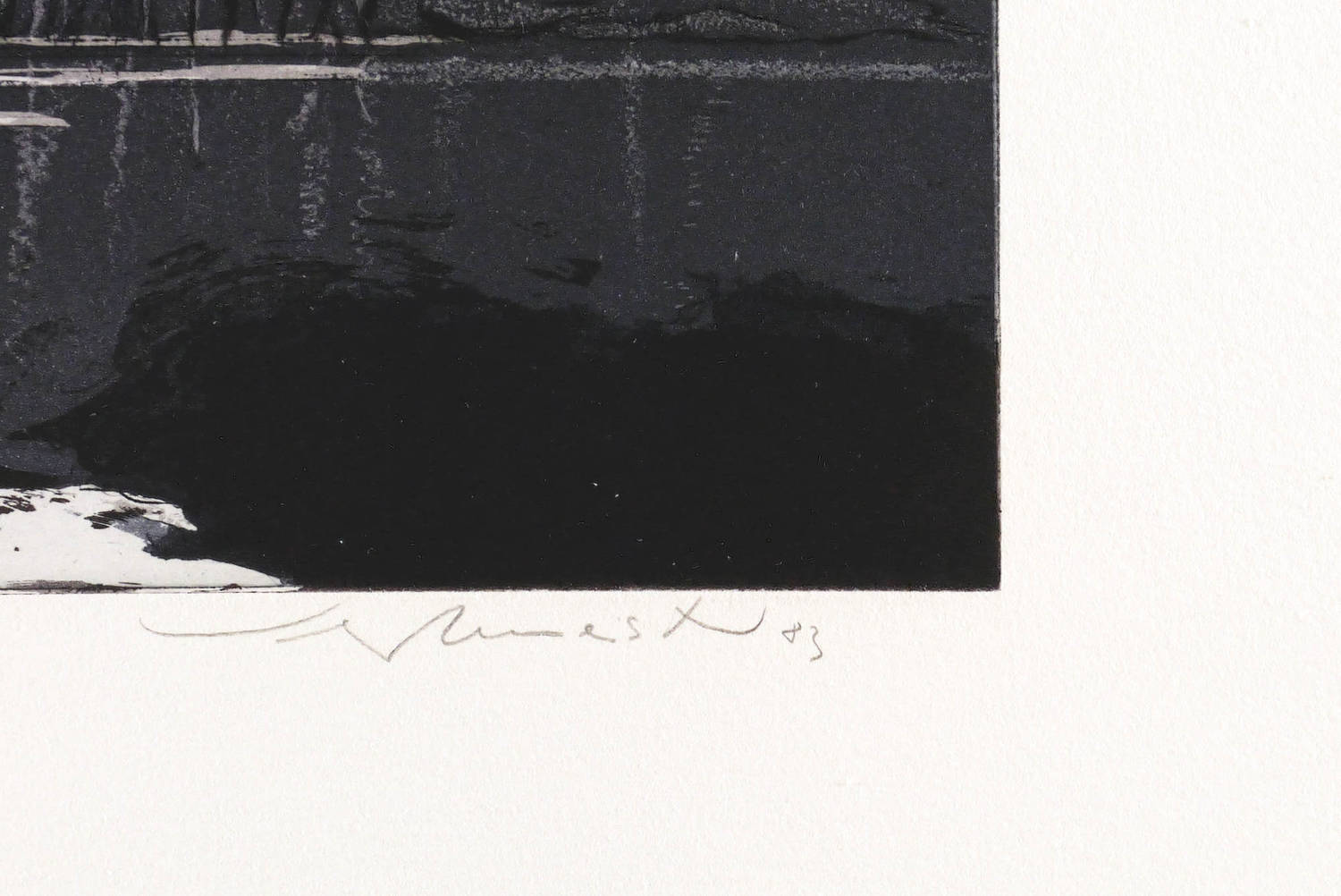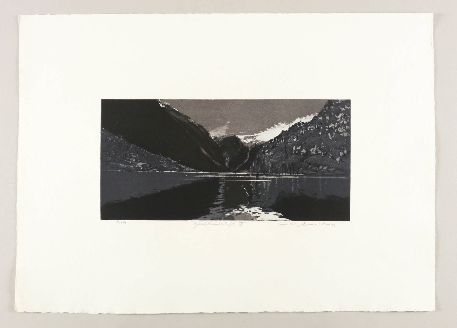 1983. Farbradierung / Farbaquatinta, von 2 Platten, in Grau & Schwarz, auf Büttenkarton. – Von Wolfgang Werkmeister. – Probedruck. – 18,9 x 38,7 cm (Darstellung / Platte), 47 x 65 cm (Blatt).