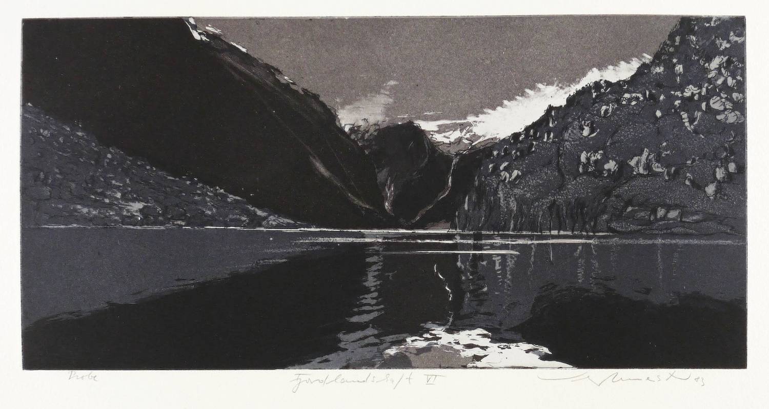 Wolfgang Werkmeister (*1941 Berlin, lebt und arbeitet in Hamburg). Deutscher Grafiker, bedeutender Vertreter der zeitgenössischen Radierkunst. 1960-64 Besuch der Akademie der Bildenden Künste Stuttgart, Fachklasse für freie Grafik und Illustration bei Gunther Böhmer. 1965 Besuch der Fachhochschule für Gestaltung Hamburg bei W. M. Busch und S. Oelke. 1966-68 tätig als Pressezeichner. 1972/73 Dozent an der Fachhochschule für Gestaltung, Hamburg. Zahlreiche Auslanfsaufenthalte und Stipendien in Marokko, USA, auf den Kanarischen Inseln, etc. 2001 Kunstpreis der Stadt Baden-Baden. Zentrales Ausdrucksmittel ist die Radierung, genauer die Aquatinta, in der er Landschaft als Hauptmotiv regelrecht zelebriert und in technisch ebenso aufwändigen wie raffinierten Blättern druckgrafisch umsetzt. Stilistisch siedelt sein Werk zwischen einem geschickt eingesetzten Fotorealismus und der lakonischen Bildsprache eines Ansel Adams.