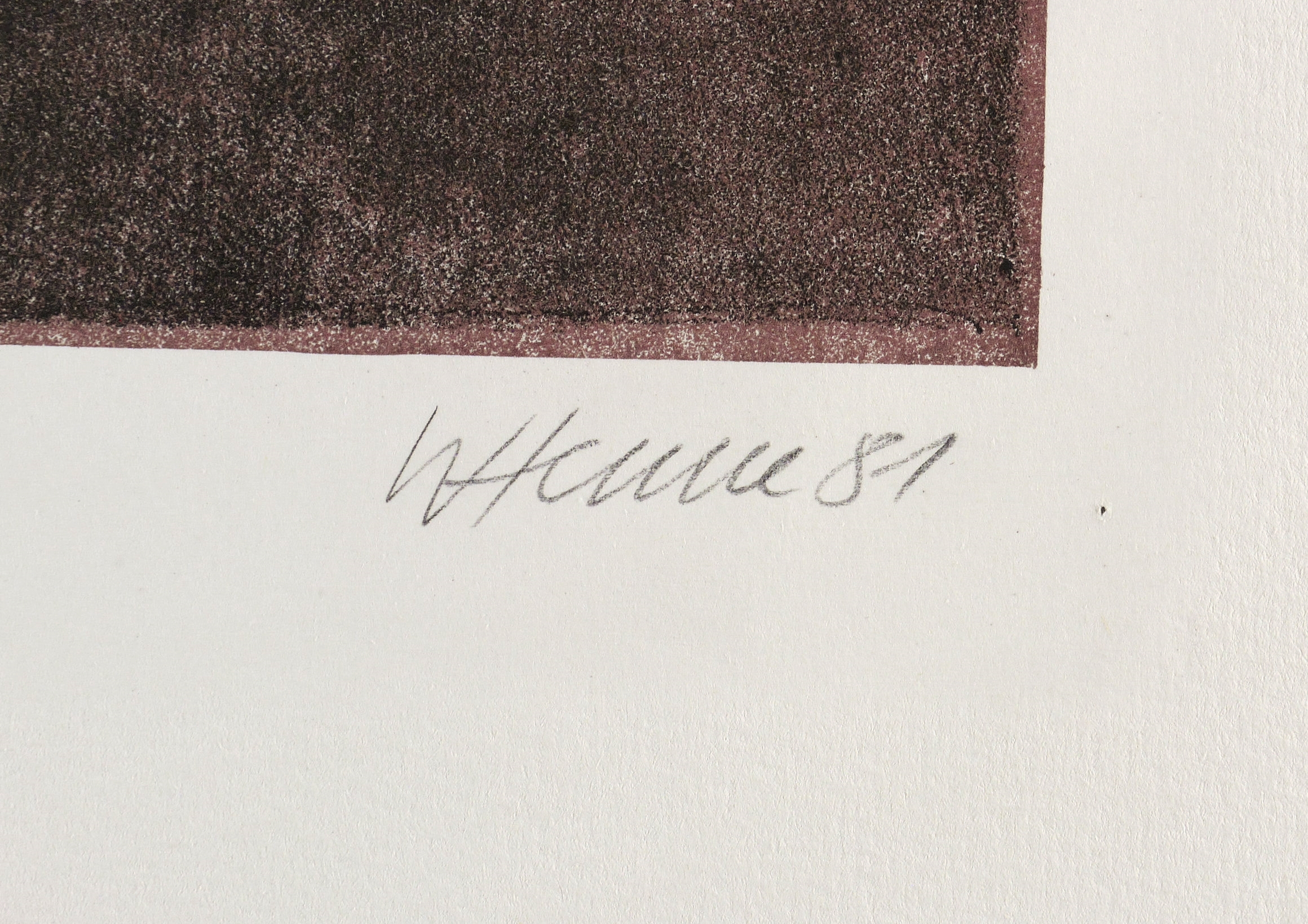 1981. Farblithografie / Pinsel- & Kreidelithografie, in Braun-Violett & Schwarz, auf hellchamois Weißenborn. – Originale Künstlergrafik, von Wolfgang Henne. – Auflage Exemplar Nr. 30/35. – 35,0 x 25,2 cm (Darstellung / Druckbild), 48 x 35 cm (Blatt).