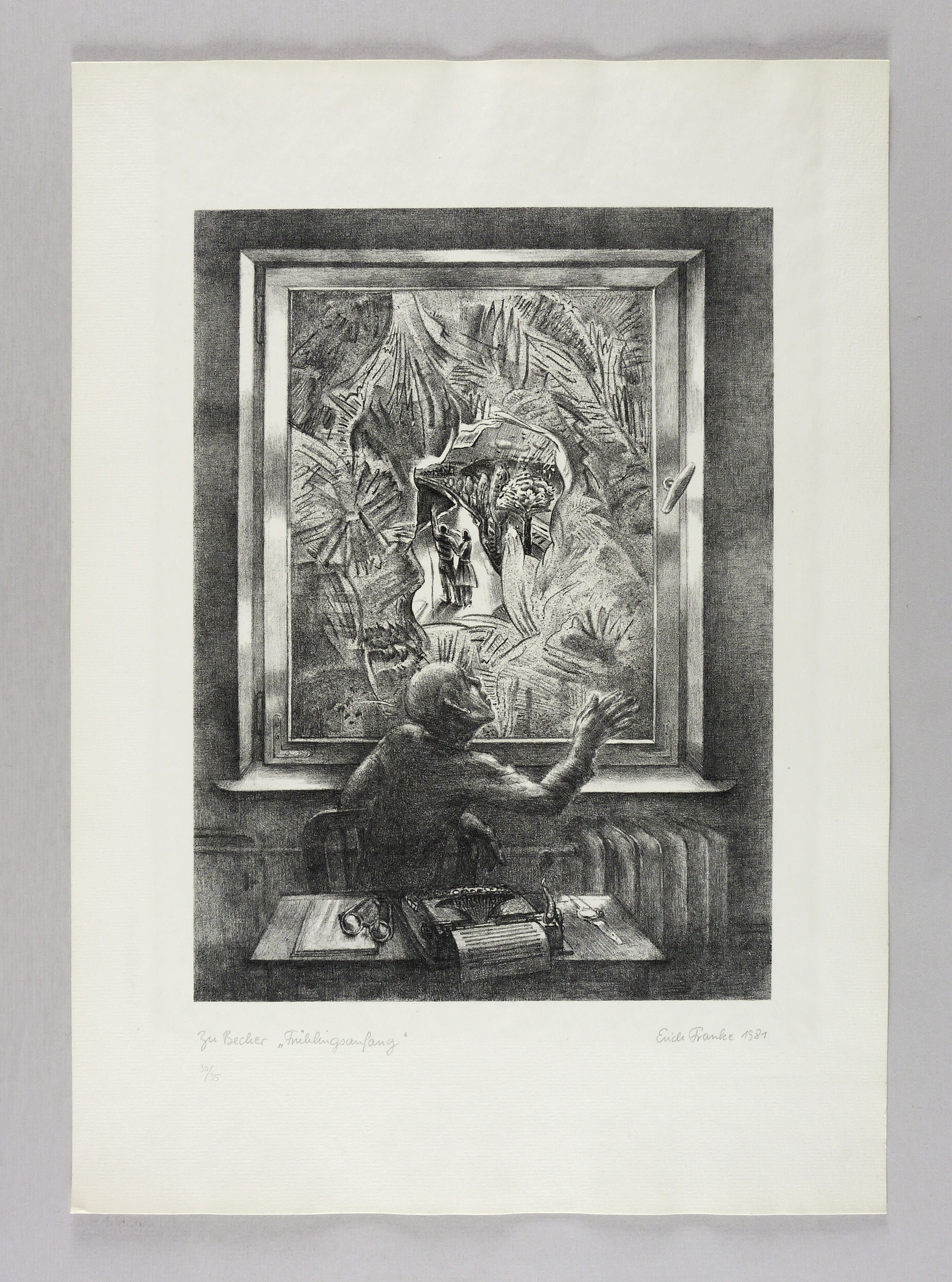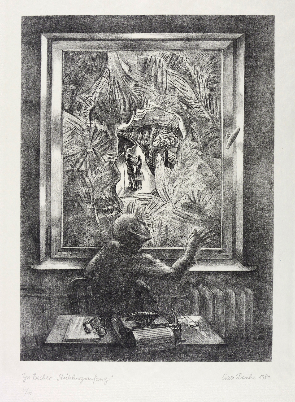 Rechts unten in Bleistift signiert und datiert: ″Erich Franke 1981″. Links Titel und Auflagenbezeichnung: ″zu Becher 'Frühlingsanfang' / 30/35″. – Sehr guter Zustand.
