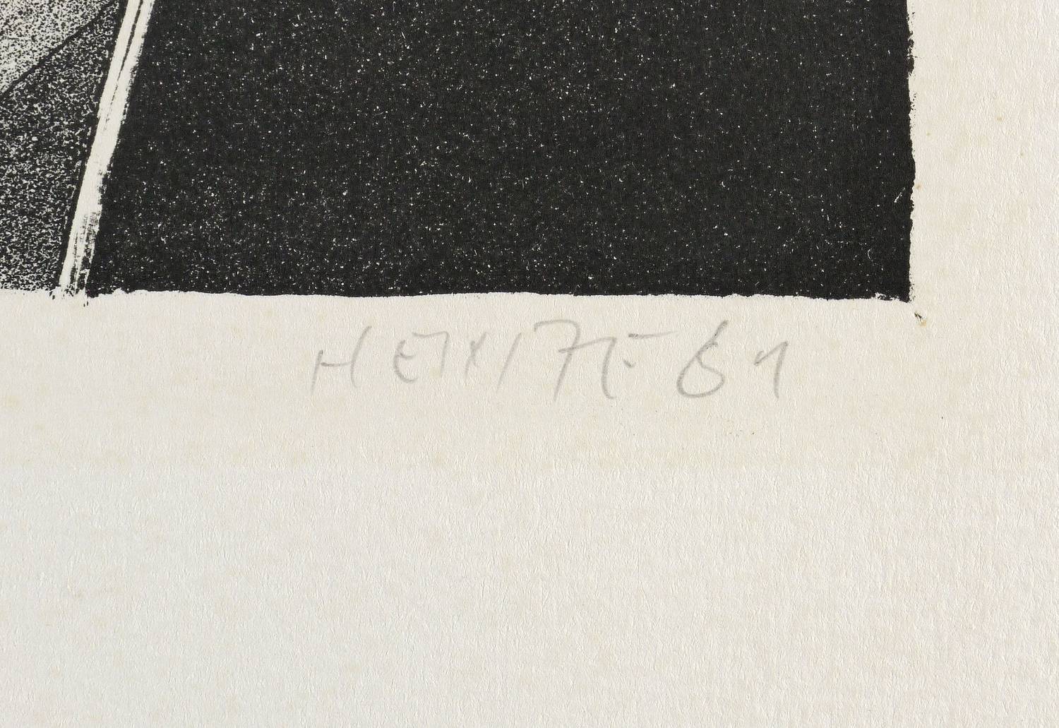 1981. Lithografie / Kreide-, Feder- & Pinsellithografie, in Schwarz, auf hartem hellgelbem Weißenborn. – Originale Künstlergrafik, von Frieder Heinze. – Auflage Exemplar Nr. 30/35. – 48 x 34 cm (Blatt), 34,3 x 27,7 cm (Darstellung / Druckbild).