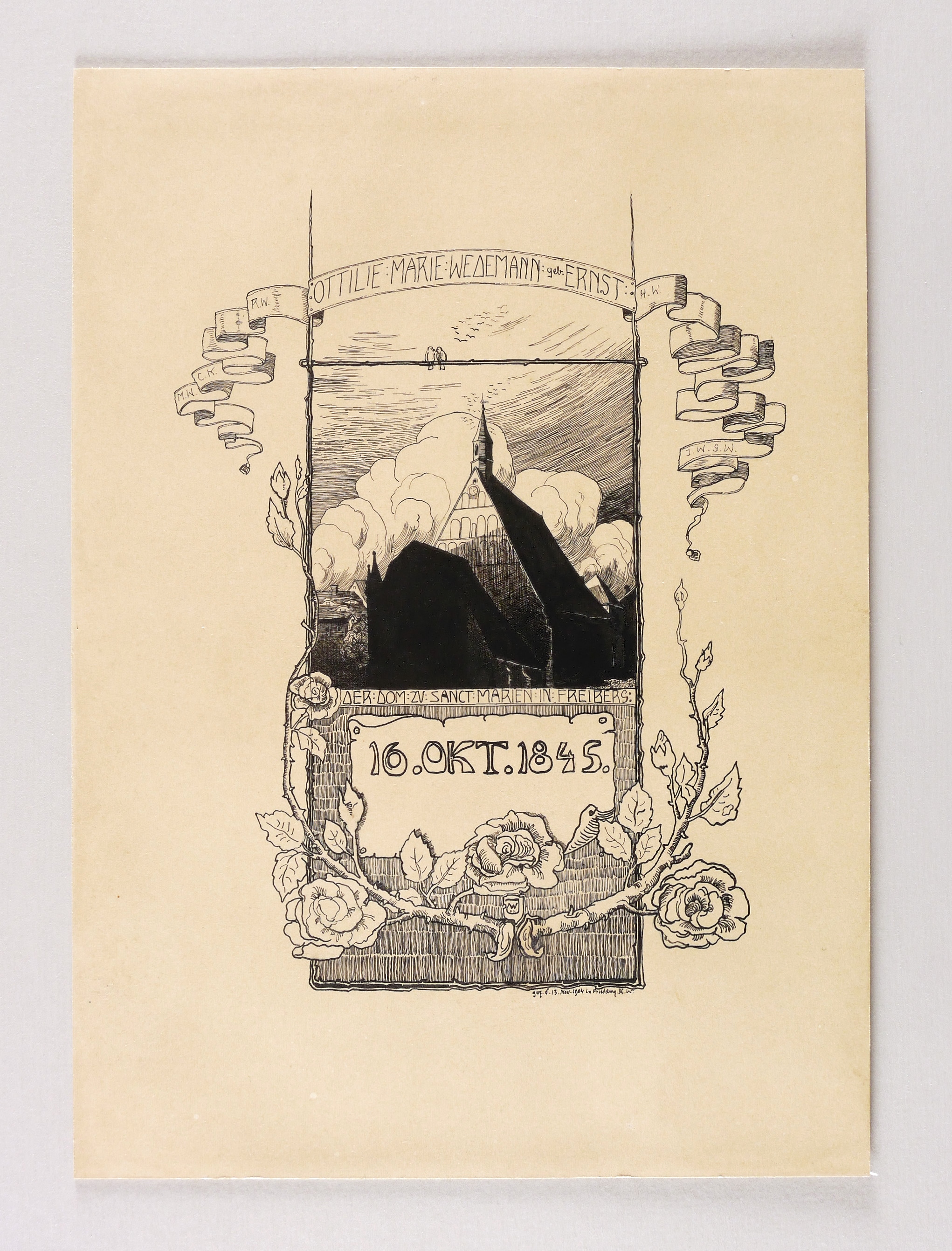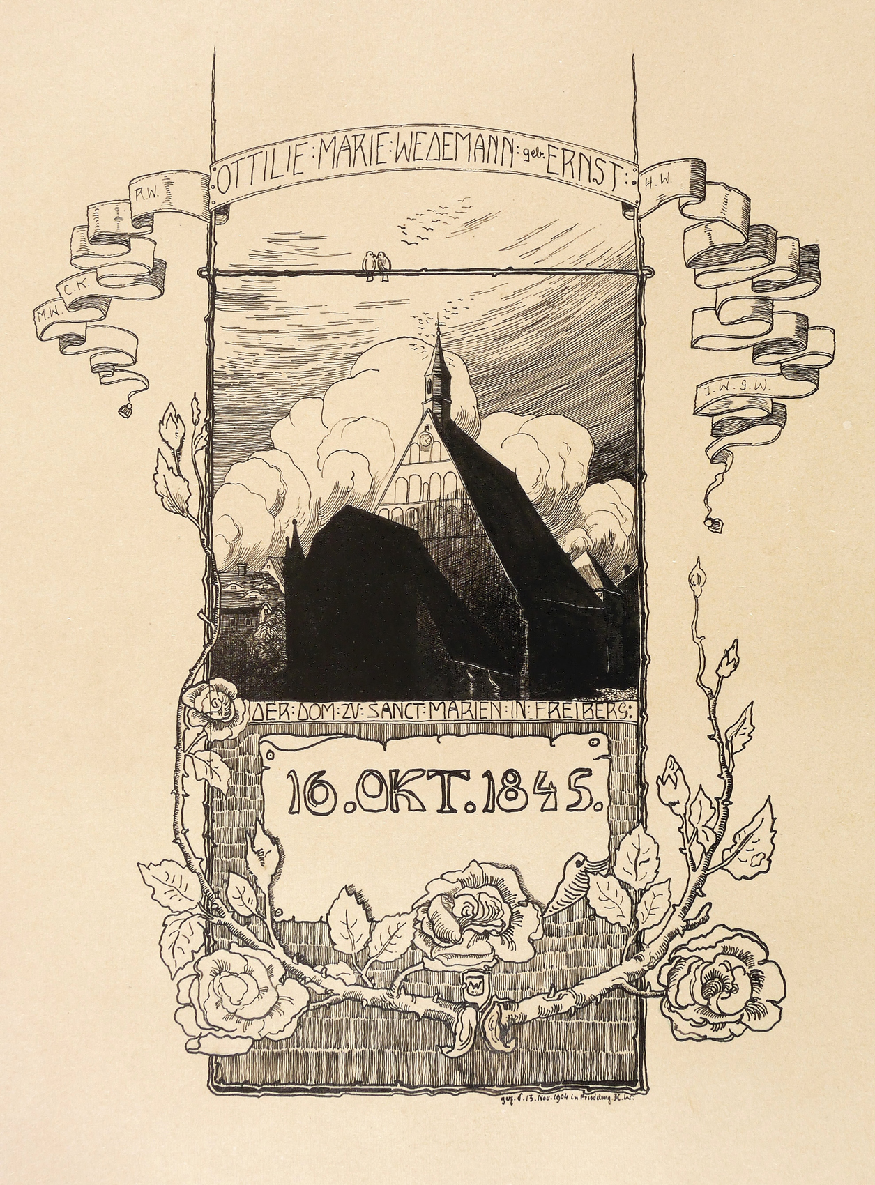 Rechts unten in schwarzer Feder signiert: ″gez. d. 13. Nov. 1904 in Friedeburg H.W.″ In der Darstellung die Inschrift: ″OTTILIE MARIE WEDEMANN geb. ERNST // DER DOM ZU SANCT MARIEN IN FREIBERG // 16. OKT. 1845″. – Glückwunschkarte mit der Ansicht des Mariendoms von Freiberg, umrankt von Rosenzweigen. – Blattkanten rückseitig verstärkt. Guter Zustand.