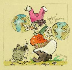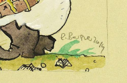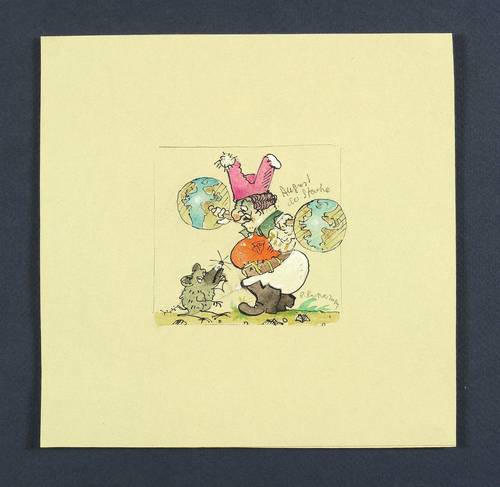 2014. Zeichnung / Tusche & Aquarell, auf gelbem Tonpapier. – Originale Künstlergrafik, von Ralf Bergner. – Unikat. – 7,2 x 7,5 cm (Darstellung), 16,5 x 16,5 cm (Blatt).