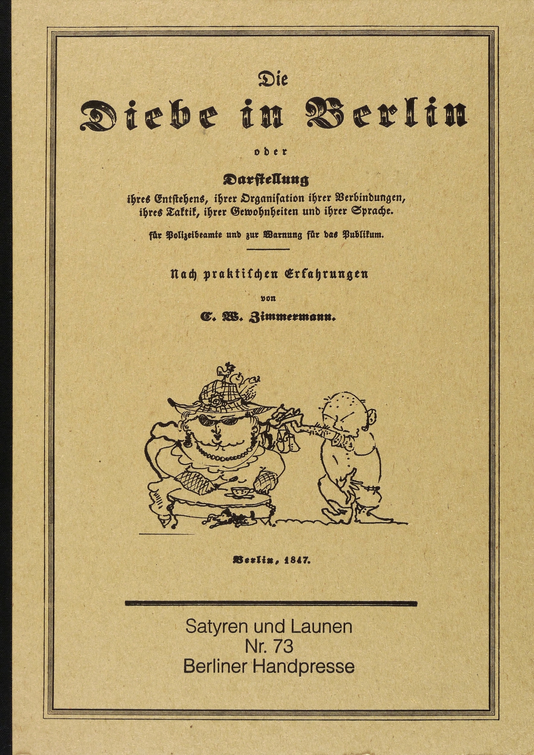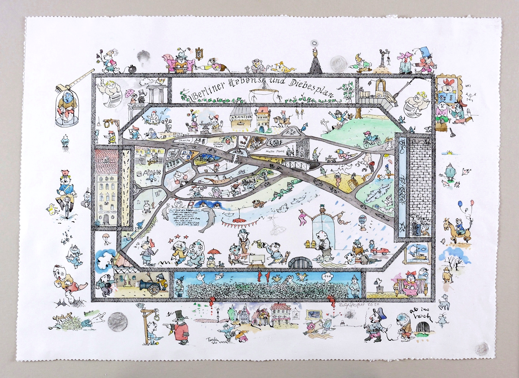 In der Darstellung rechts unten mit Bleistift signiert und datiert: ″Ralf Bergner 2020″. Oben zentral Inschrift: ″Berliner Lebens- und Diebesplan″. Diverse weitere Inschriften. – Beigegeben die satirische Broschüre mit einem Reprint von ″Die Diebe in Berlin oder Darstellung ihres Entstehens, ihrer Organisation, ihrer Verbindungen, ihrer Taktik und ihrer Sprache für Polizeibeamte und zur Warnung für das Publikum″ von C.W. Zimmermann (Berlin 1847; Berlin: Berliner Handpresse 2001), mit zahlreichen Illustrationen und einer originalen aquarellierten Titelblatt-Zeichnung. – Sehr guter Zustand.