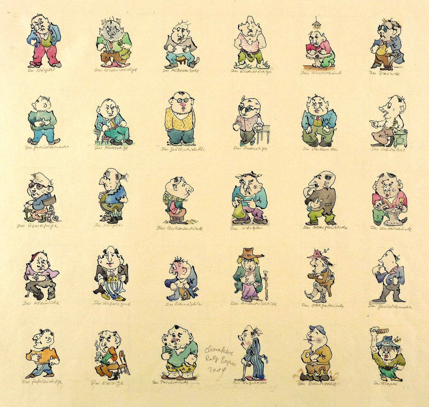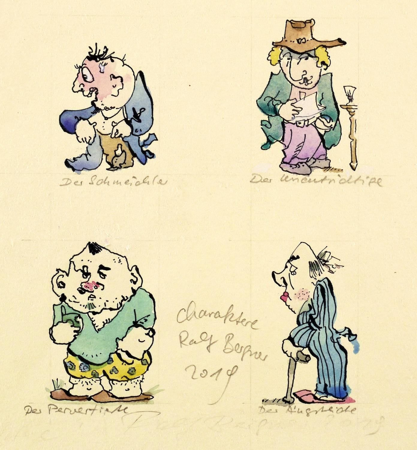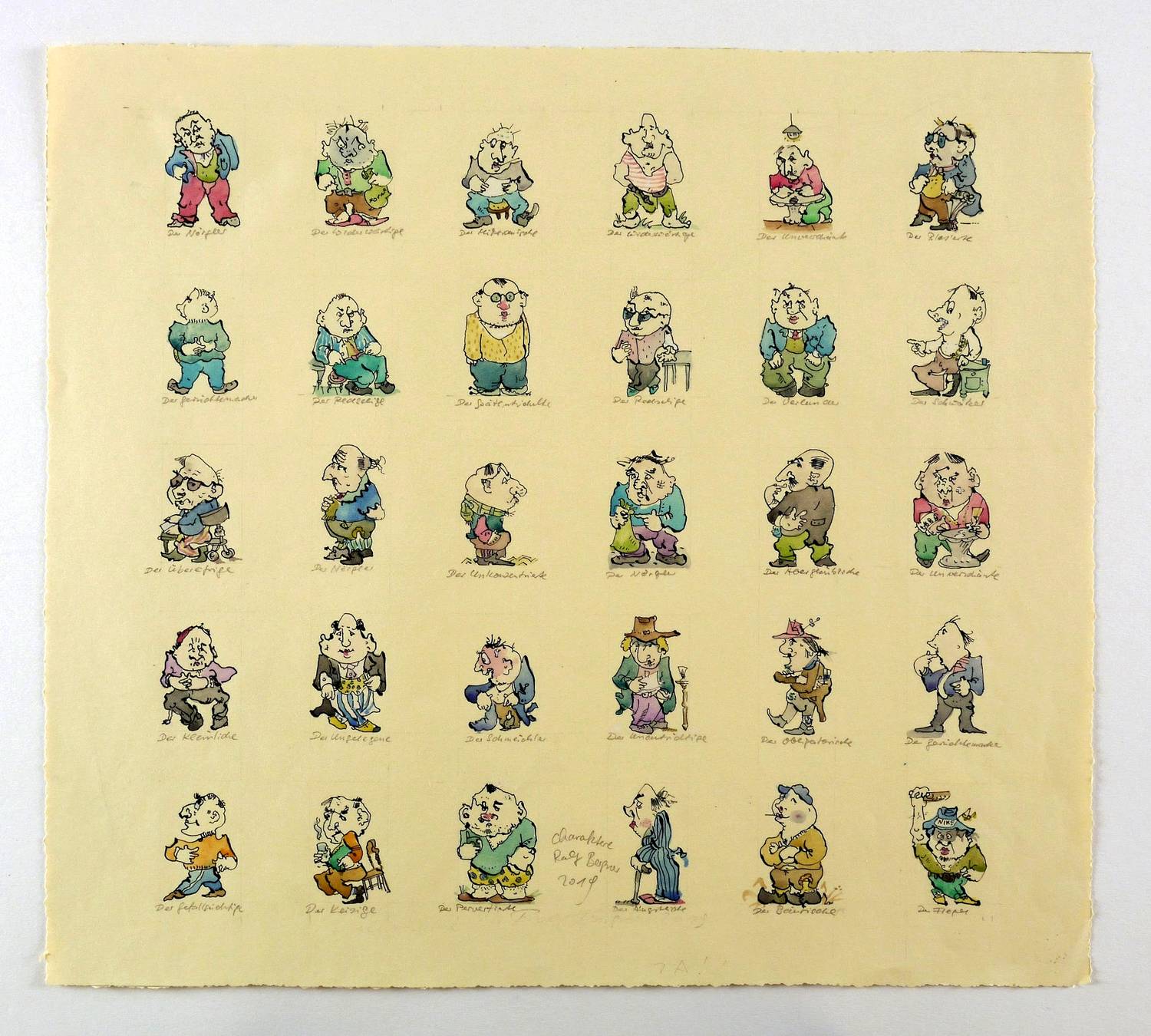 In der Darstellung unten zentral mit Bleistift betitelt, signiert und datiert: ″Charaktere Ralf Bergner 2019″. Dazu jede einzelne Darstellung bezeichnet, beginnend links oben: ″Der Nörgler / Der Widerwärtige / Der Mißtrauische...″ – Sehr guter Zustand.