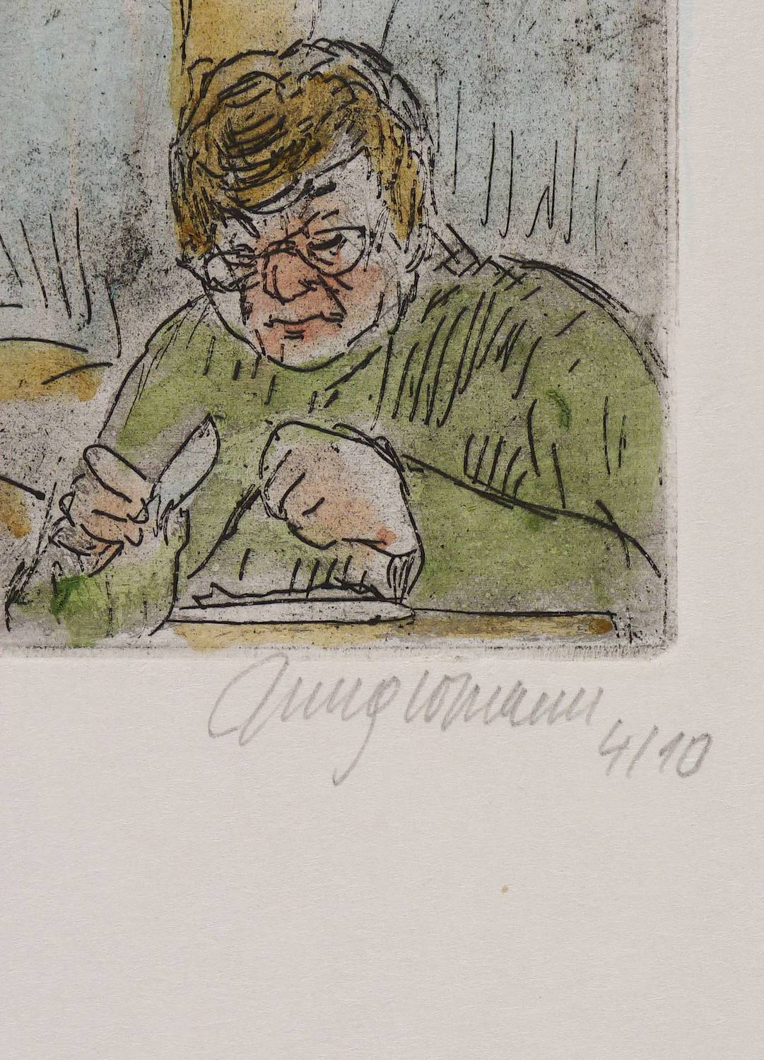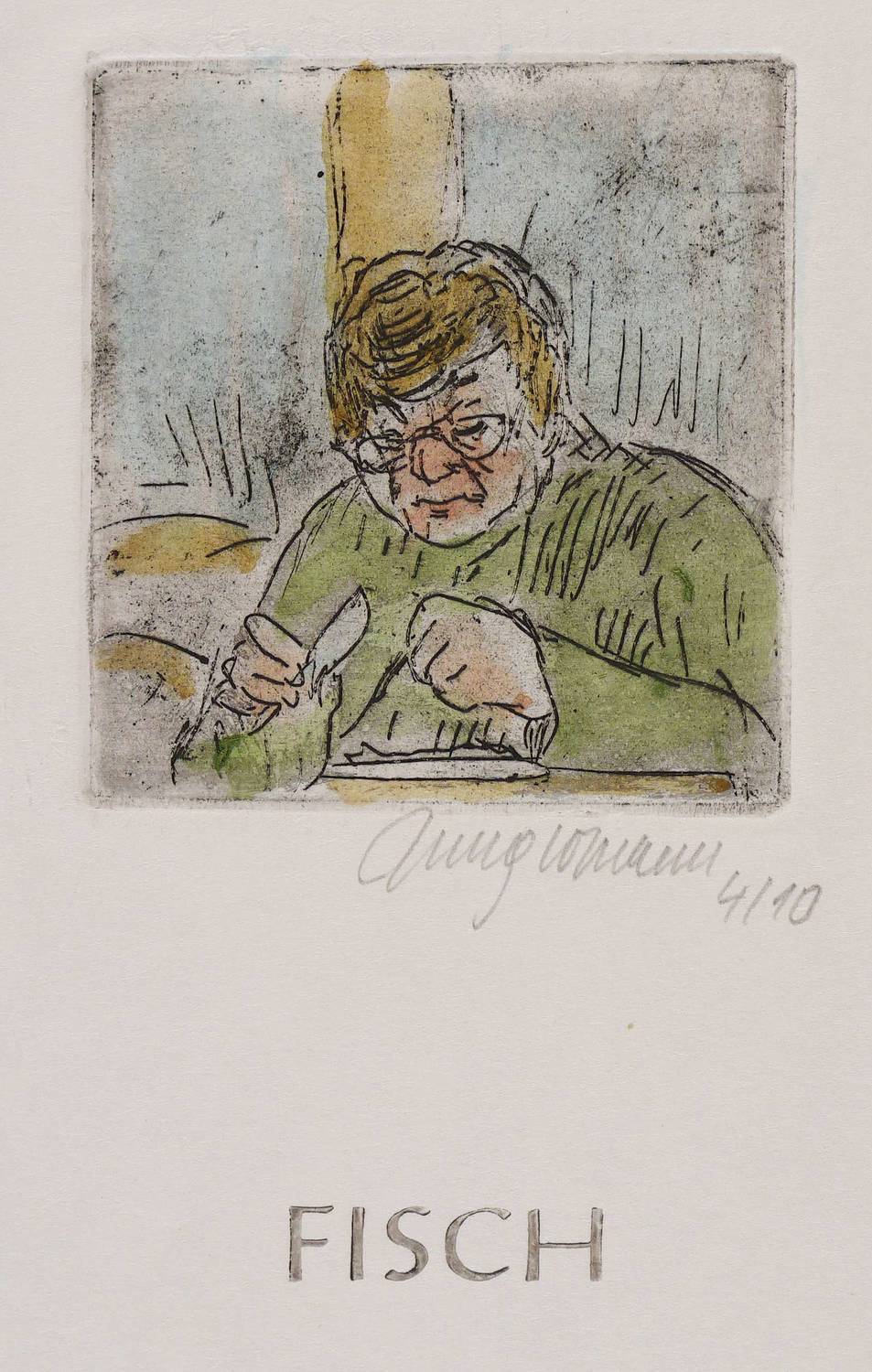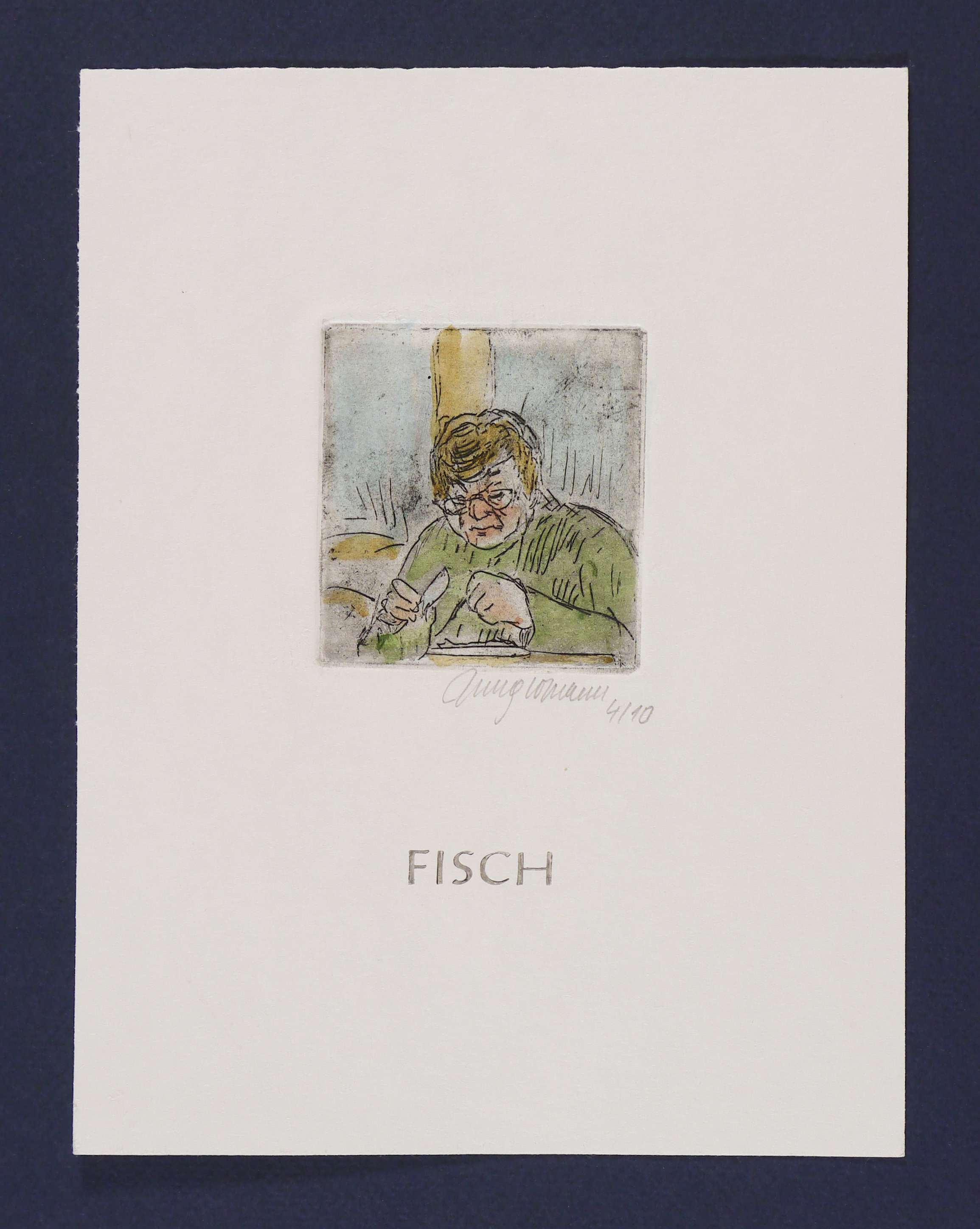 2007. Radierung / Strichätzung, in Schwarz, aquarelliert, auf Büttenkarton. – Originale Künstlergrafik, von Ulrich Jungermann. – Auflage Exemplar Nr. 4/10. – 6,2 x 5,7 cm (Darstellung / Platte), 18,3 x 14,7 cm (Blatt).