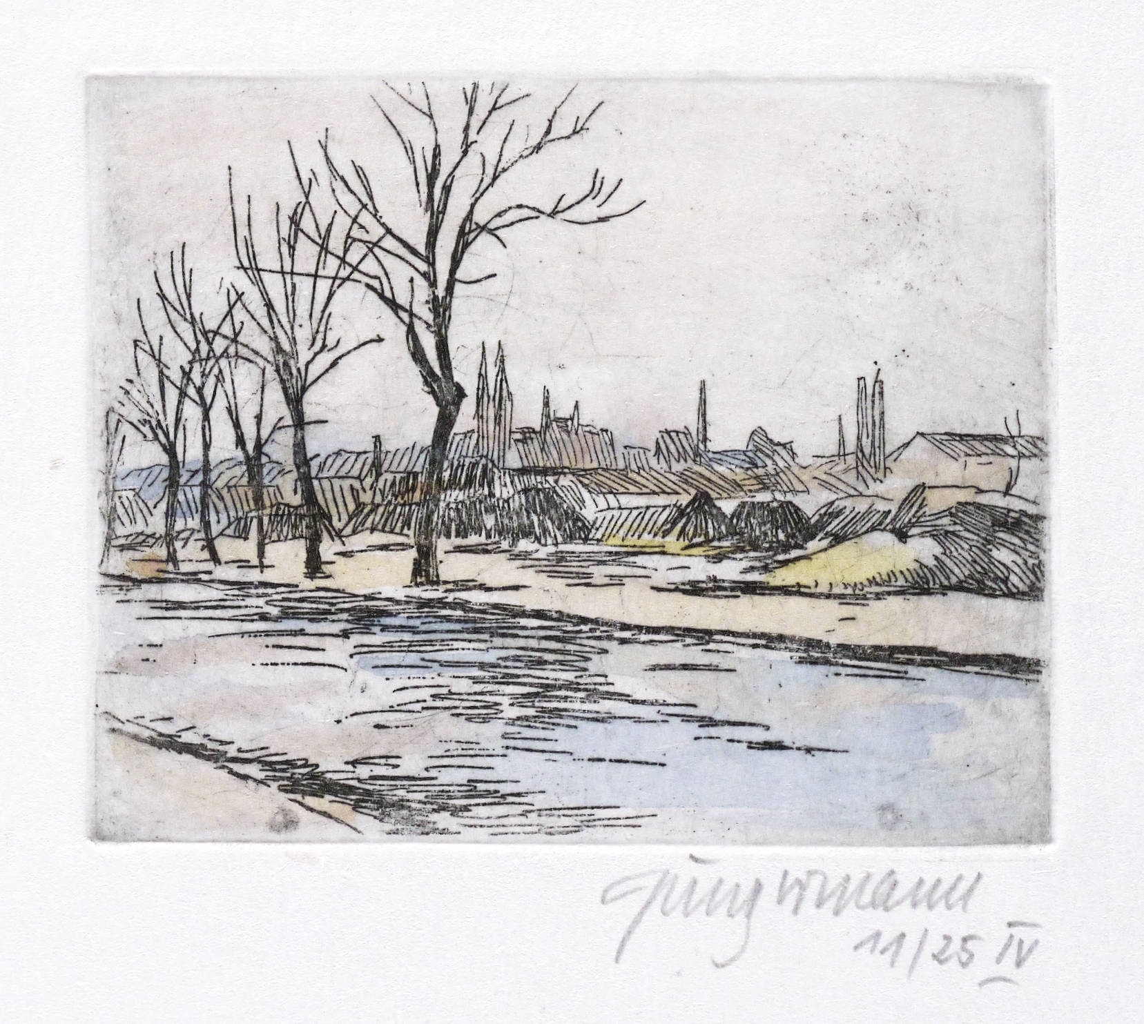 1982. Radierung / Kaltnadel, in Schwarz, aquarelliert, auf weißem Velin. – Originale Künstlergrafik, von Ulrich Jungermann. – Auflage Exemplar Nr. 11/25. – 7,0 x 8,8 cm (Darstellung / Platte), 20 x 17 cm (Blatt).