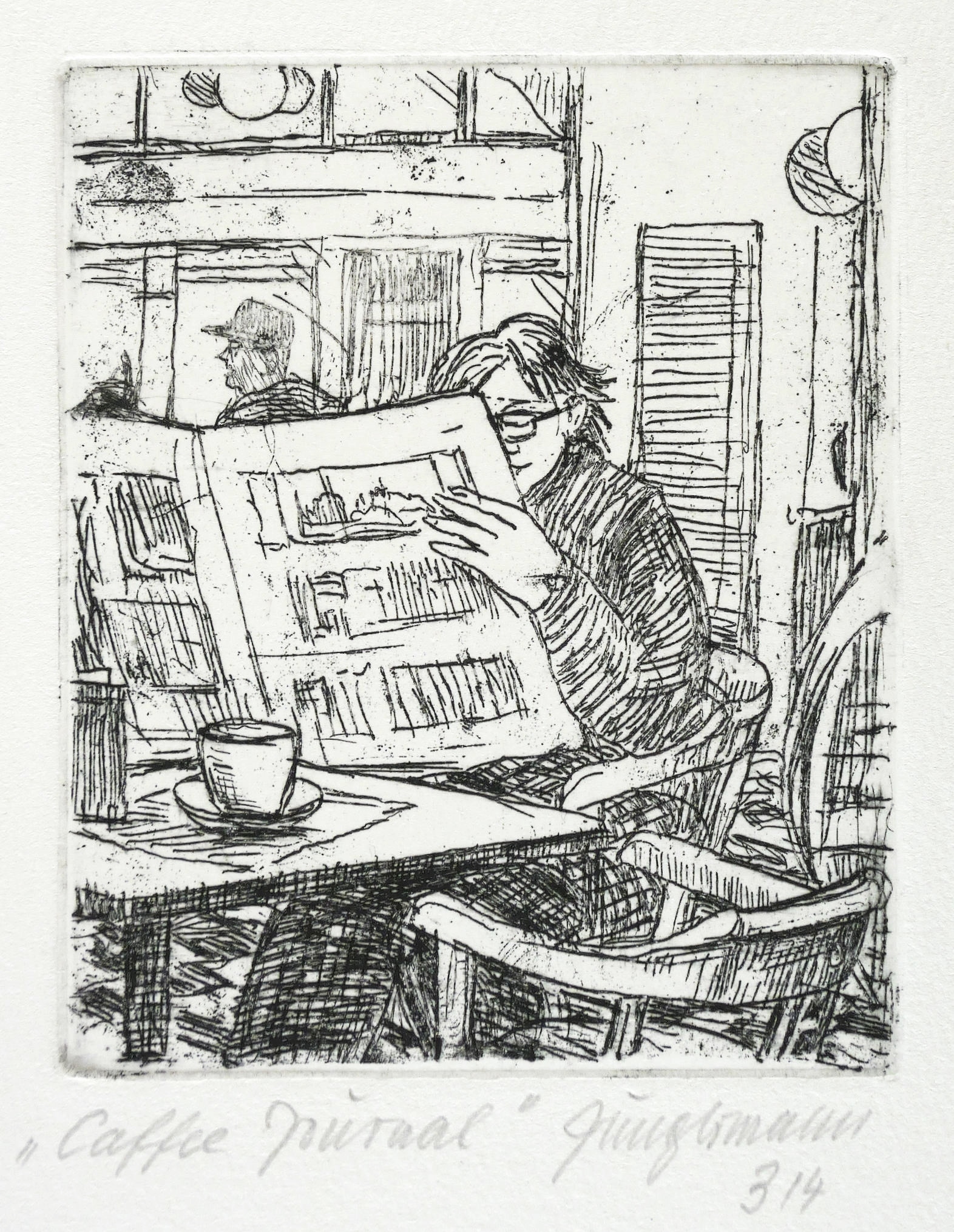 2018. Radierung / Strichätzung, in Schwarz, auf hellchamois Velin. – Originale Künstlergrafik, von Ulrich Jungermann. – Auflage Exemplar Nr. 3/4. – 12,0 x 9,8 cm (Darstellung / Platte), 27 x 23 cm (Blatt).